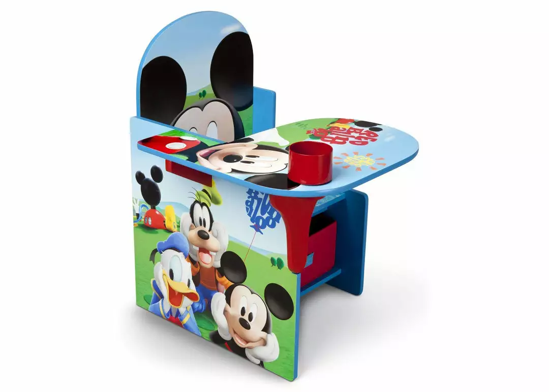 This cheerful Mickey Mouse Chair Desk is the perfect place for your little one to sit and get all of his work done. Designed with all your child’s favorite Mickey Mouse characters and a new exciting Mickey Mouse design, this chair desk is great for coloring, playing, and reading. The seat also opens as a storage space for your little one’s toys, books, and arts supplies. The desk also features a cup holder that can be used for art supplies. Some assembly is required.