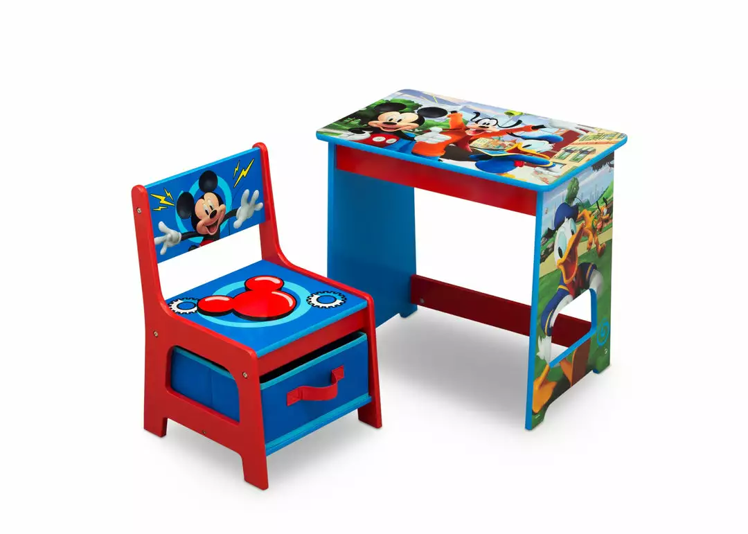 Add a dash of animated fun to playtime, mealtime or study timeâwith the Mickey Mouse Kids Desk and Chair Set by Delta Children! Perfectly sized for your little Mouseketeer, your child will love sitting down at this coordinating, desk and chair set, featuring vibrant graphics of their favorite mouse, Mickey and his fun-loving pals, Goofy and Donald Duck. Bold colors with details of Mickeyâs signature ears enhance the cuteness, while depictions of Mickey and his palsâ charming adventures bring playful excitement to any activity. The desk provides the perfect space for your child to do homework, art projects or eat, while the cleverly designed chair features a storage bin underneath for easy access to art supplies, toys, books, or games! A smart and sturdy option for your childâs bedroom or playroom, this durably constructed wood desk and chair set will stand up to years of use. Bring home the cheerful spirit of Mickey Mouse and his friends to your little oneâs Clubhouse with this Kids Desk and Chair Set.