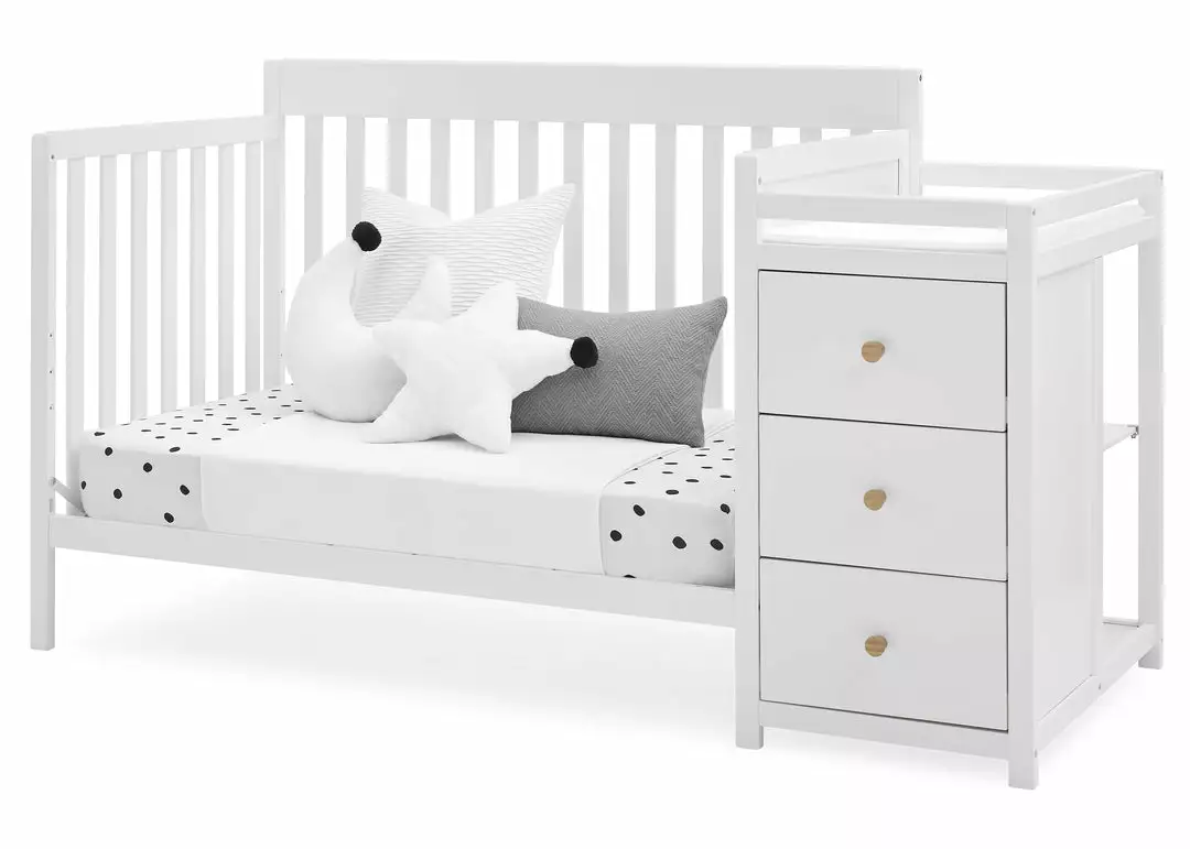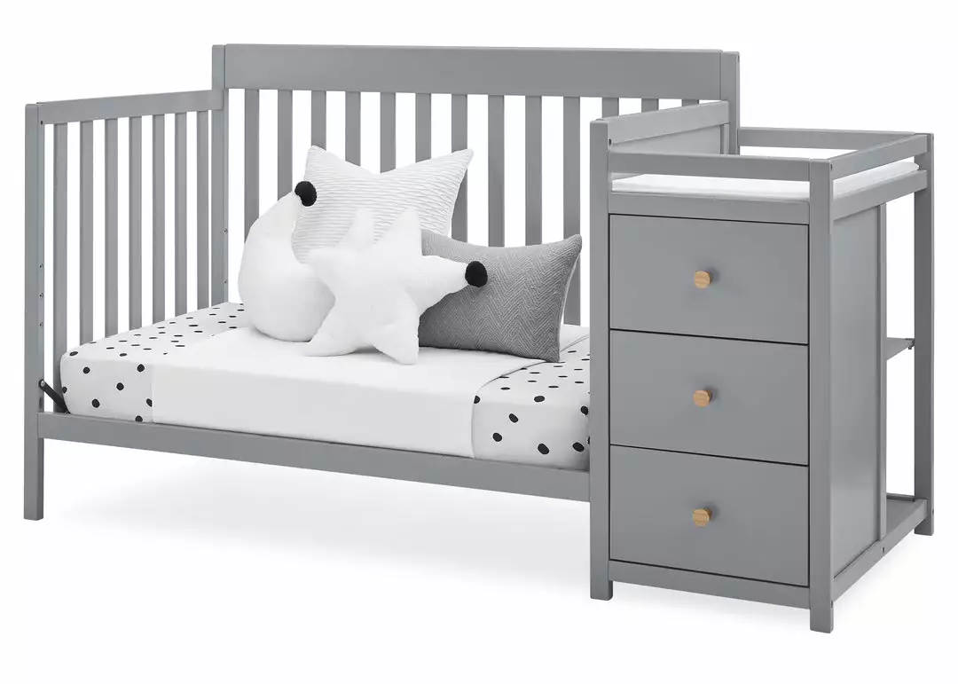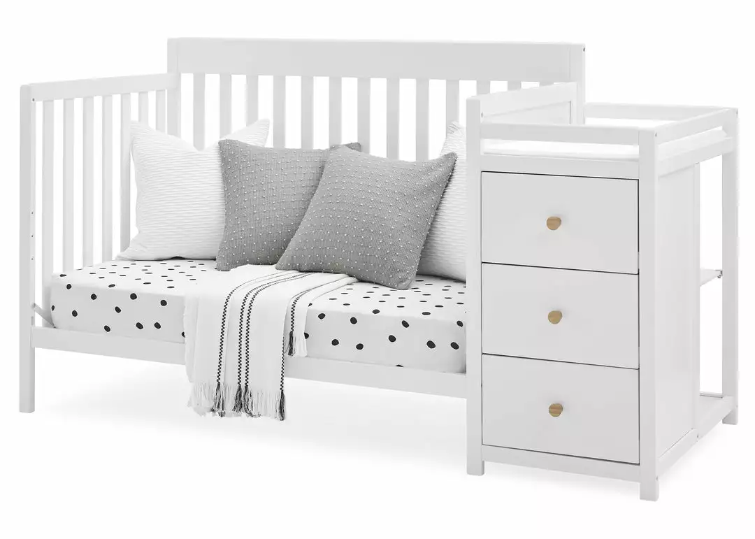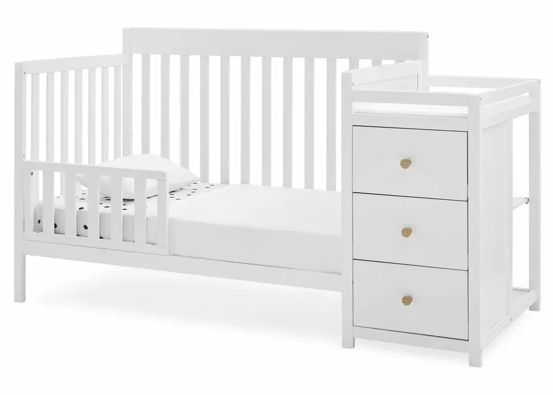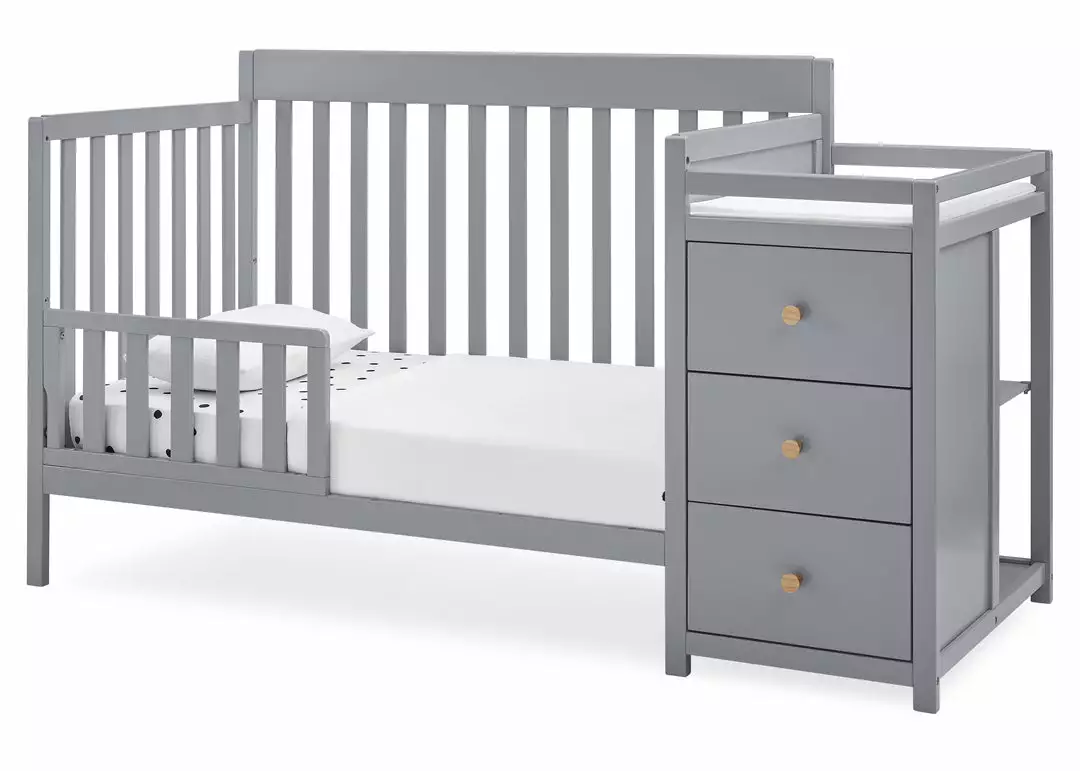 The Flynn 5-in-1 Convertible Crib and Changer by Delta Children is the ideal piece for efficiency and versatility in your babyâs nursery. This cribâs grow-with-me design features three adjustable height levels that allow the crib to be lowered as your child grows, plus it converts from a crib, to a toddler bed, sofa, daybed and full size bed. The attached changing table includes a changing pad on top, then underneath three drawers with modern, natural knobs and two shelves help keep your little oneâs essentials within reach. Everything you need to furnish your nursery, the Flynn 6-in-1 Convertible Crib and Changer by Delta Children is a convertible crib, changing table, and storage piece all in one (Daybed/Sofa Rail included; Toddler Guardrail and Full-Size Bed Rails sold separately).