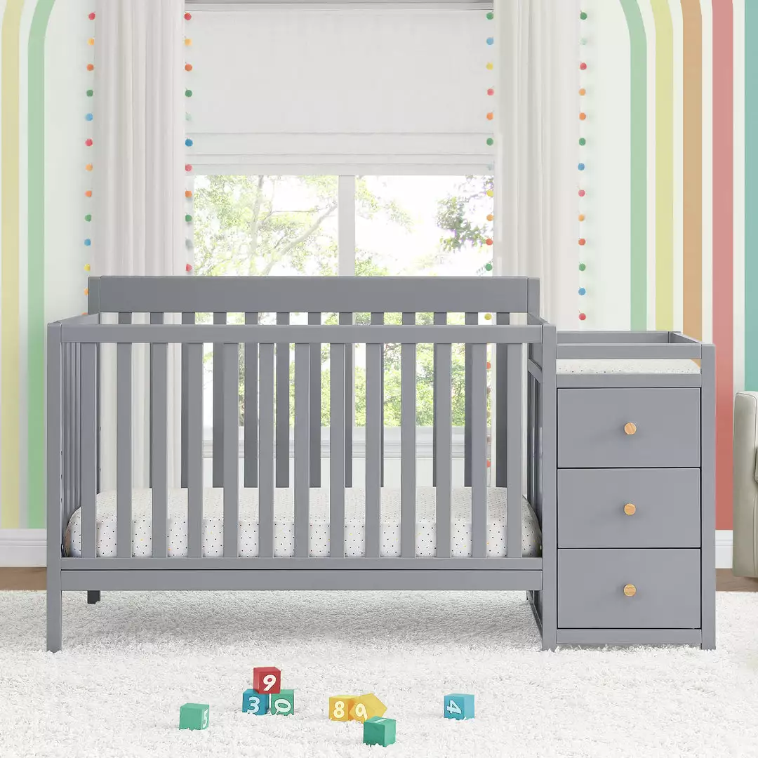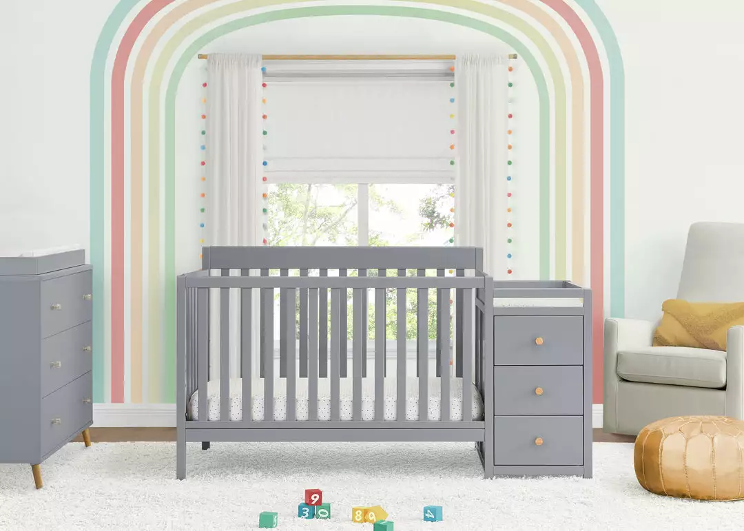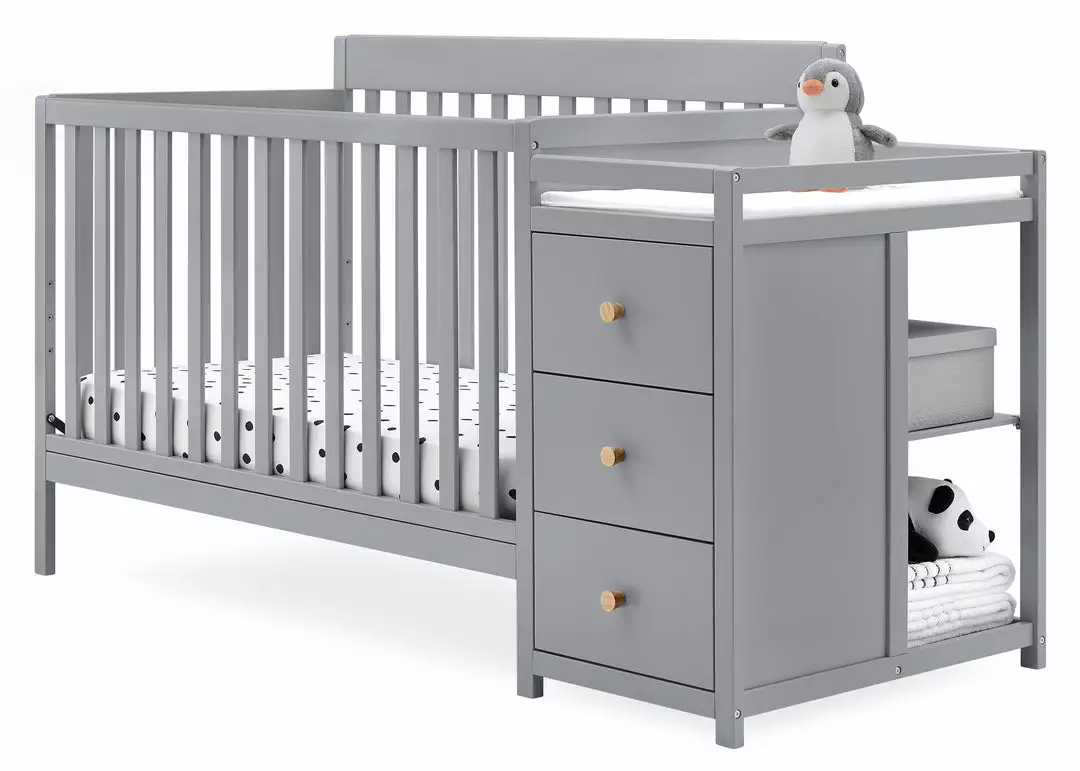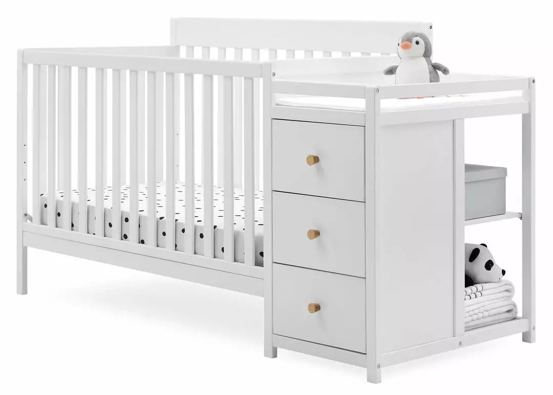 The Flynn 5-in-1 Convertible Crib and Changer by Delta Children is the ideal piece for efficiency and versatility in your babyâs nursery. This cribâs grow-with-me design features three adjustable height levels that allow the crib to be lowered as your child grows, plus it converts from a crib, to a toddler bed, sofa, daybed and full size bed. The attached changing table includes a changing pad on top, then underneath three drawers with modern, natural knobs and two shelves help keep your little oneâs essentials within reach. Everything you need to furnish your nursery, the Flynn 6-in-1 Convertible Crib and Changer by Delta Children is a convertible crib, changing table, and storage piece all in one (Daybed/Sofa Rail included; Toddler Guardrail and Full-Size Bed Rails sold separately).