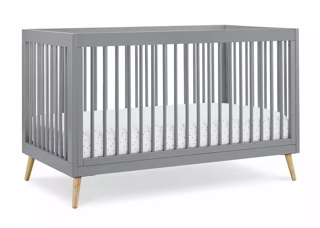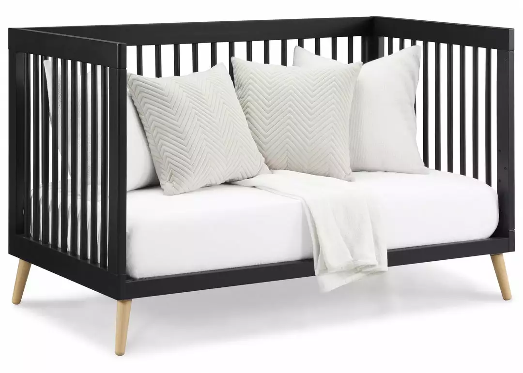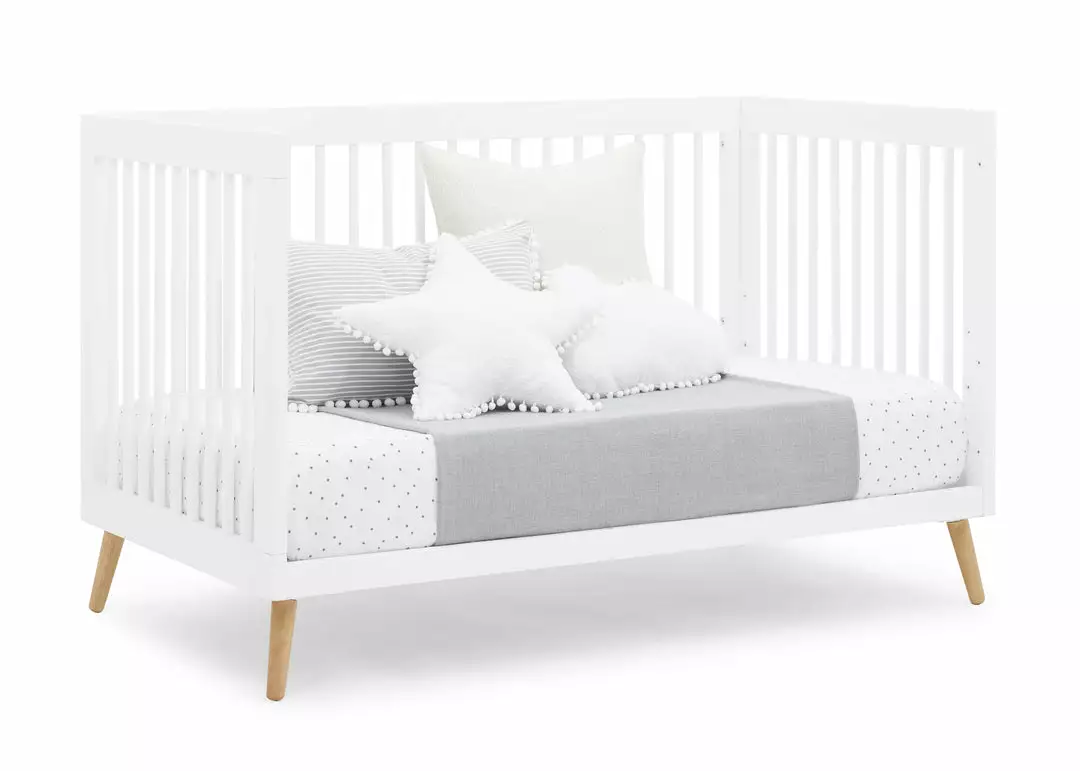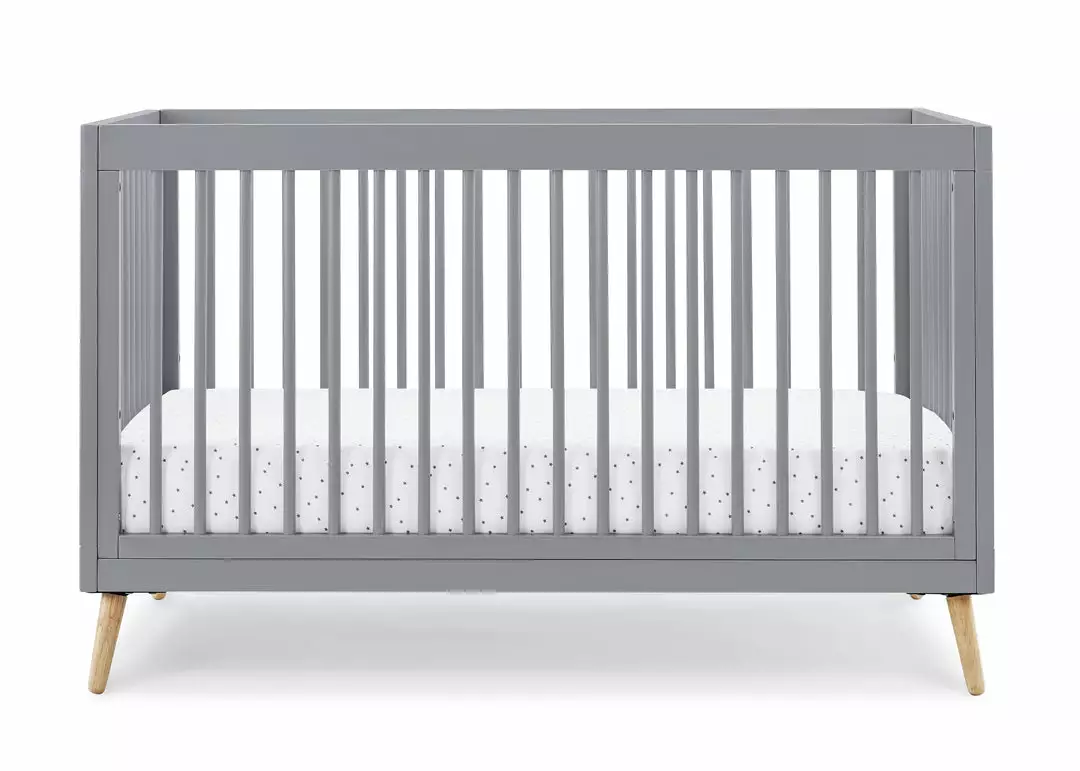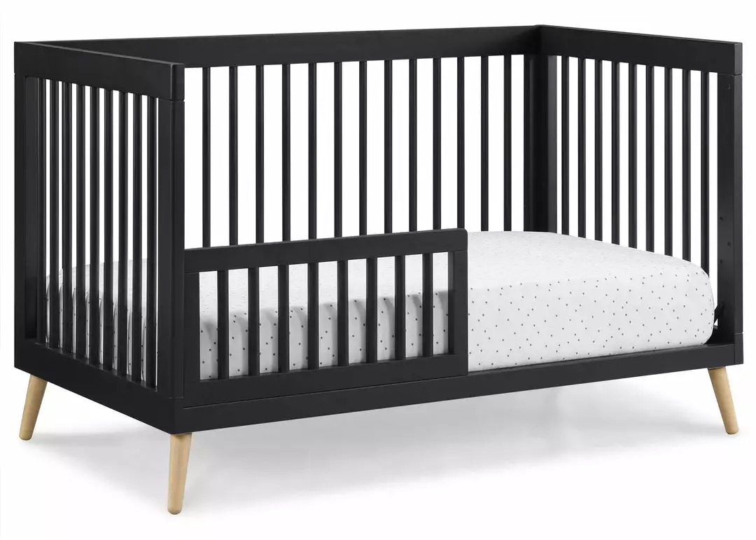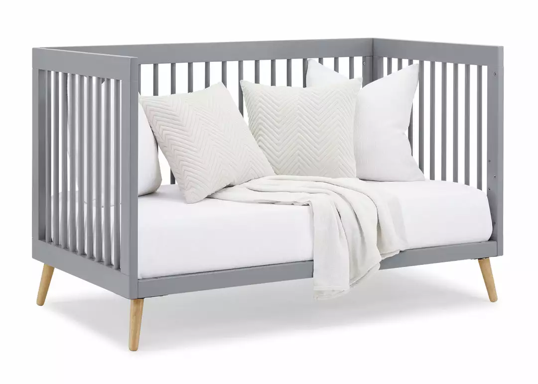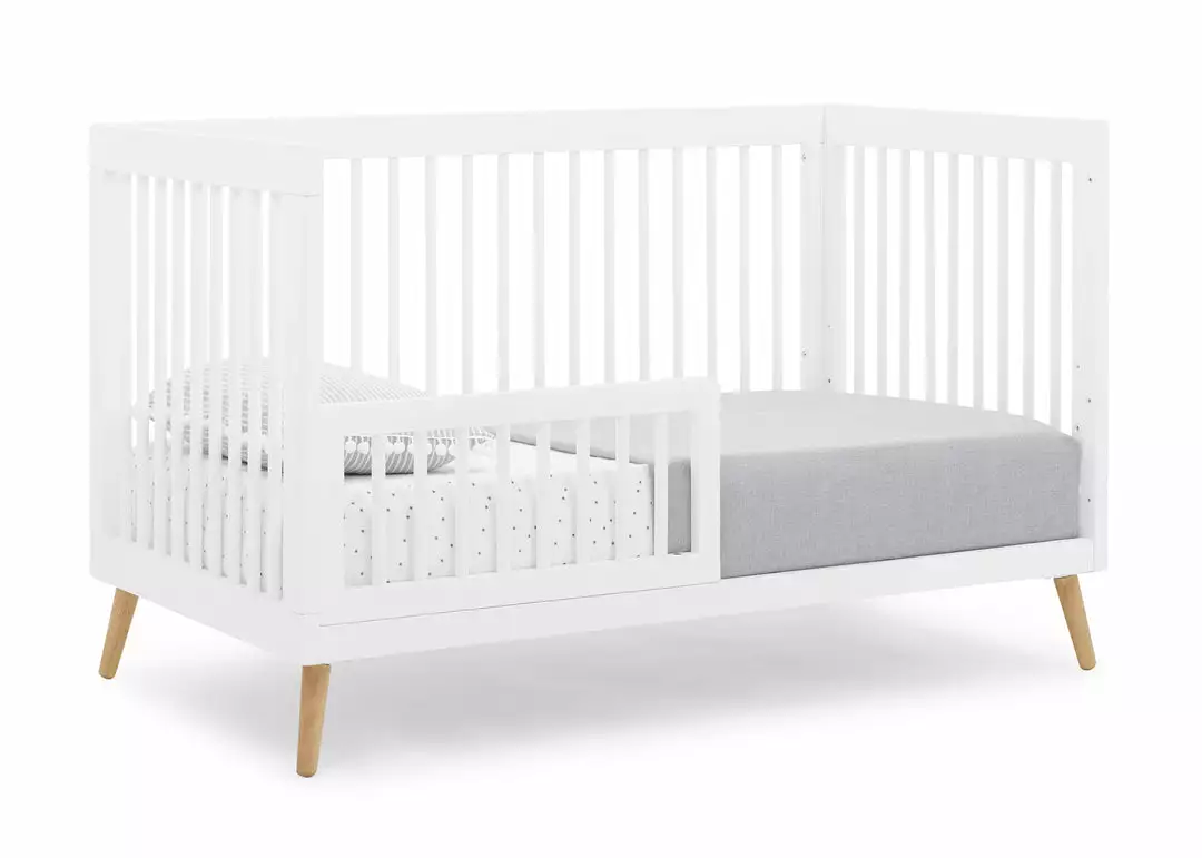 The Jordan 4-in-1 Convertible Baby Crib by Delta Children is a must-have crib for stylish parents and babies! Designed to elevate modern nurseries, it features rounded spindles and splayed feet in a natural finish for some retro-cool contrast. The adjustable height mattress allows this crib to grow alongside your little oneâstart with the mattress at the highest level, then lower it as your baby begins to sit or stand. Once your child outgrows the crib, convert it to a toddler bed, daybed or sofa (Daybed/Sofa Rail included, Toddler Guardrail #W100725 sold separately). To complete your mid-century modern nursery, pair the Jordan 4-in-1 Crib with the Jordan 3 Drawer Dresser and Jordan Storage Changing Table by Delta Children.
