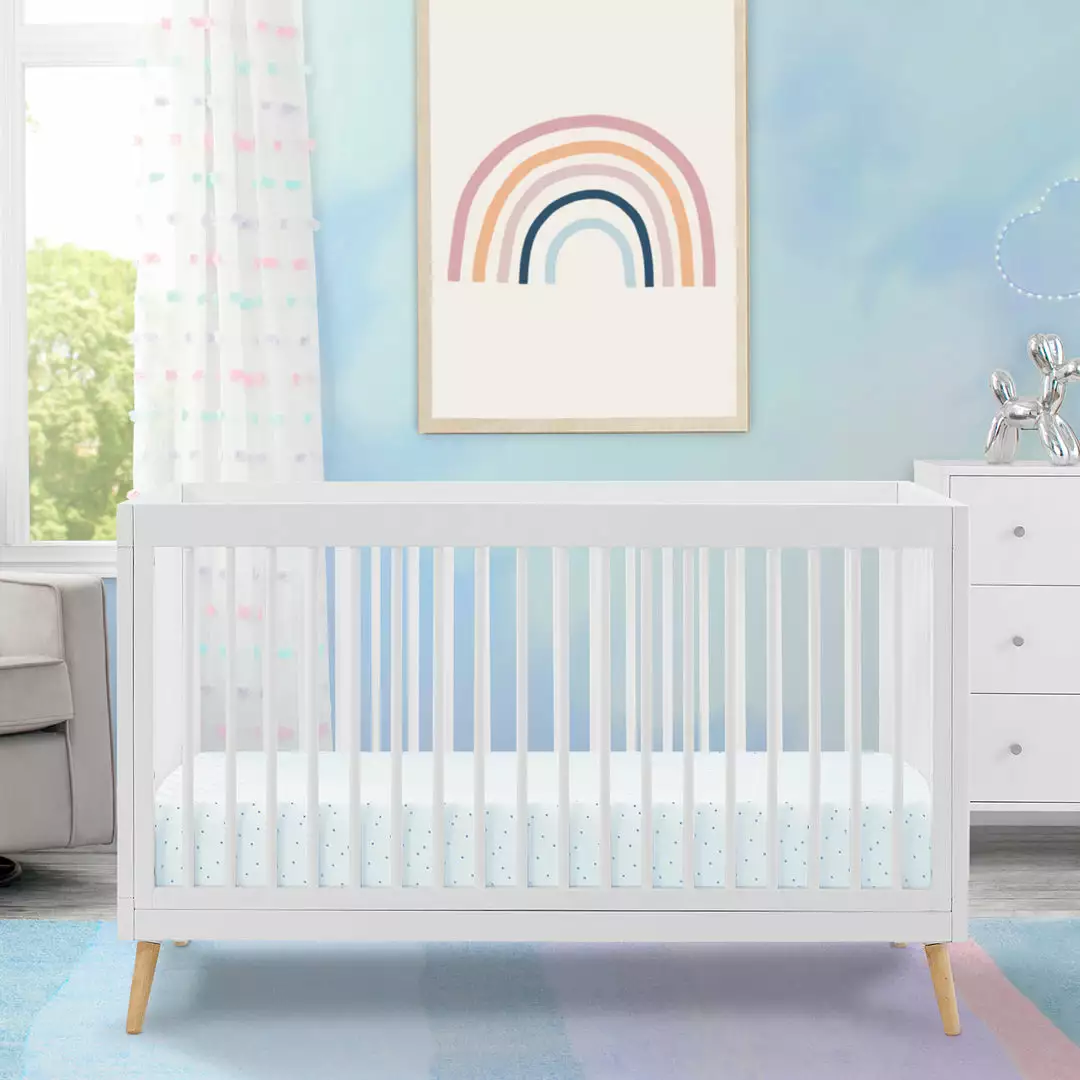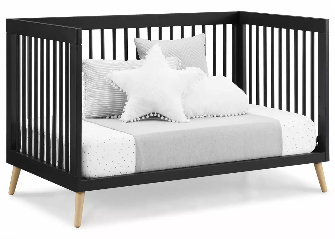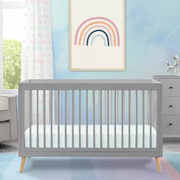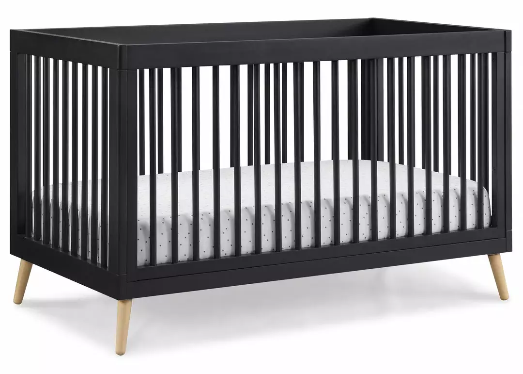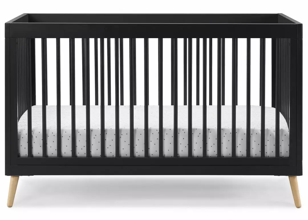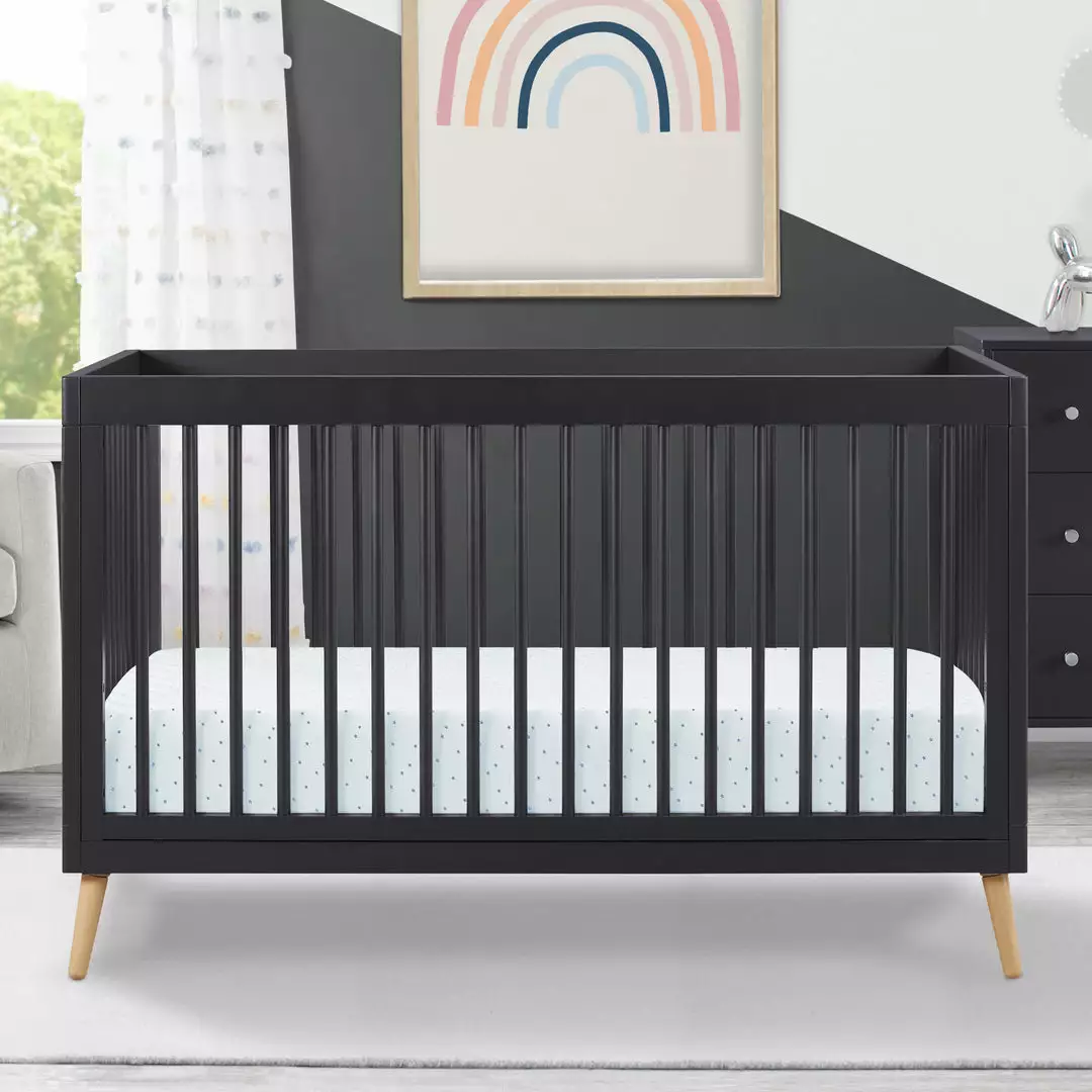 The Jordan 4-in-1 Convertible Baby Crib by Delta Children is a must-have crib for stylish parents and babies! Designed to elevate modern nurseries, it features rounded spindles and splayed feet in a natural finish for some retro-cool contrast. The adjustable height mattress allows this crib to grow alongside your little oneâstart with the mattress at the highest level, then lower it as your baby begins to sit or stand. Once your child outgrows the crib, convert it to a toddler bed, daybed or sofa (Daybed/Sofa Rail included, Toddler Guardrail #W100725 sold separately). To complete your mid-century modern nursery, pair the Jordan 4-in-1 Crib with the Jordan 3 Drawer Dresser and Jordan Storage Changing Table by Delta Children.