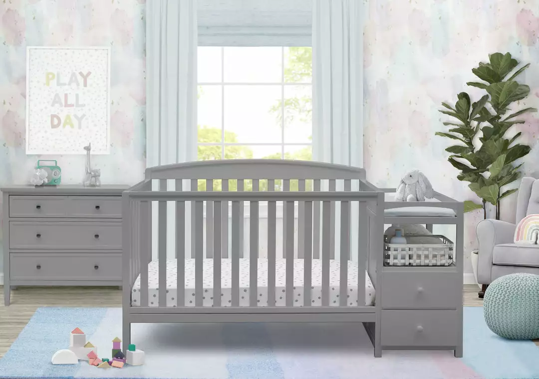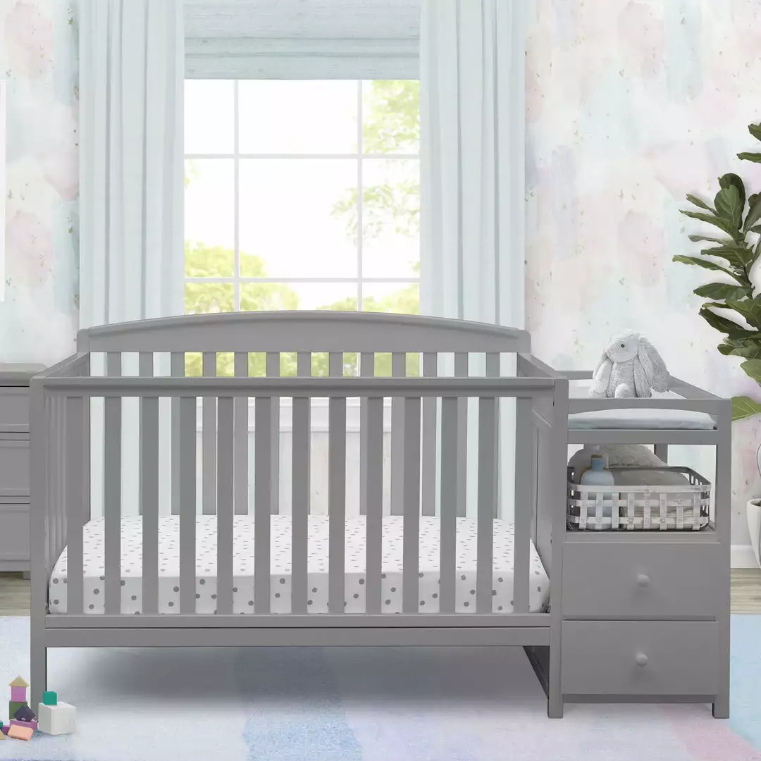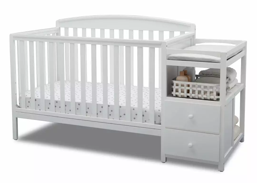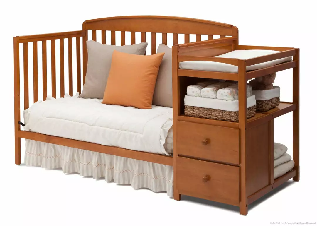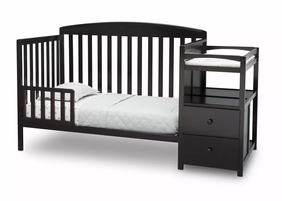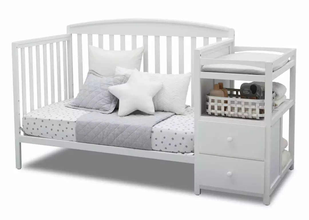 Make the most of your babyâs nursery with the Royal Convertible Crib N Changer from Delta Children! An exceptional value, the design of this crib and changing table combo gives you two pieces of nursery furniture for the price of one. The crib features a slightly arched headboard, airy slates and an adjustable height mattress support that allows you to lower the mattress as your baby growsâplus it converts into a toddler bed, daybed and full size bed when your child is ready. (Daybed Rail is included; Toddler Guardrail and Full Size Metal Bed Frame sold separately). The attached changing table offers a convenient space to safely dress and change your babyâand with two drawers and open cubby spaces, thereâs tons of storage space for all your little oneâs toiletries.