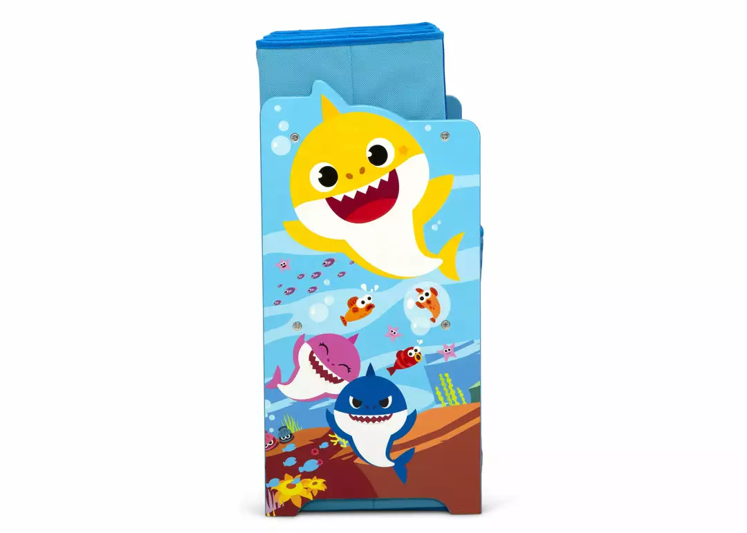 Take a bite out of playroom clutter with this Baby Shark Design & Store 6 Bin Toy Storage Organizer by Delta Children. A storage essential and colorful sticker station and all in one, this toy organizer is boldly decorated with jaw-dropping Baby Shark graphics and includes reusable vinyl stickers that feature a fun under-the-sea theme. Kids can rearrange the stickers on the sides of this organizer for hours of endless storytelling, adding a much-needed incentive to clean-up time. The sturdy wooden frame holds six fabric bins sized for every type of toy, so you can store books, blocks, and more. An eye-popping addition to their playroom or bedroom, this toy organizer makes cleaning quick and easy.