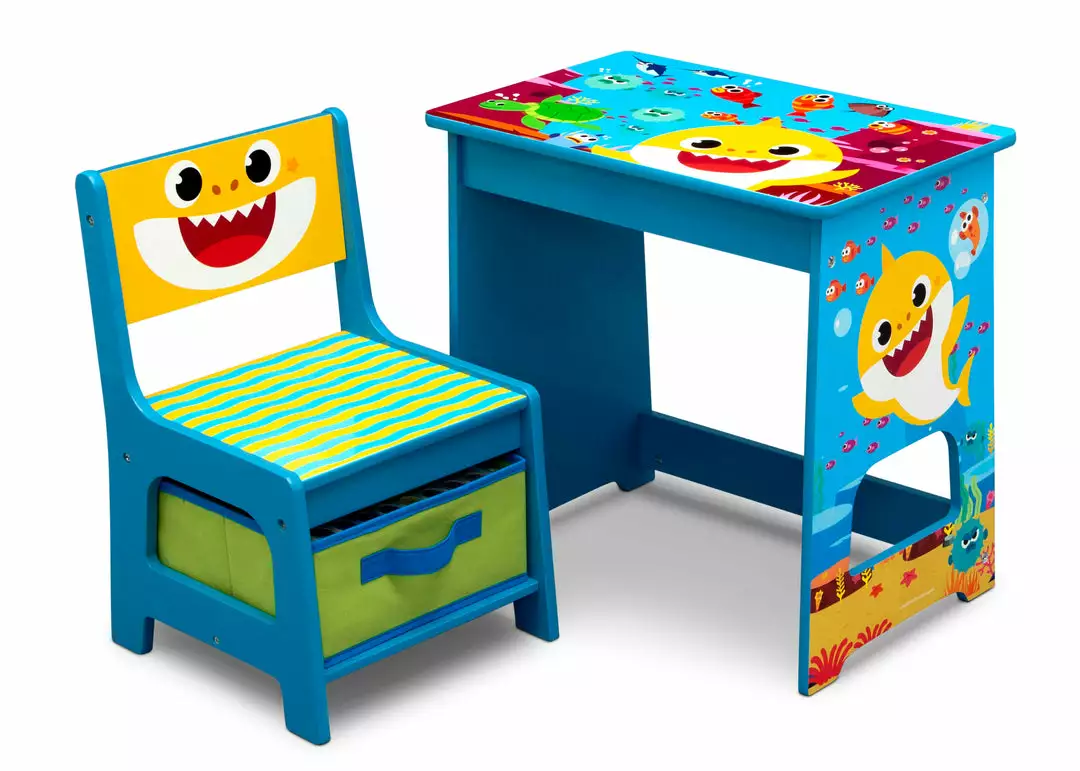 Add a dash of animated fun to playtime, mealtime or study time with the Baby Shark Wood Art Desk and Chair Set by Delta Children! Perfectly sized for your little royal, your child will love sitting down at this coordinating desk and chair set, featuring vibrant graphics of Baby Shark characters. The desk provides the perfect space for your child to do homework, art projects or eat, while also providing plenty of play features. The dry erase tabletop and included reusable vinyl stickers encourage kids to create imaginative scenes. A smart and sturdy option for your childâs bedroom or playroom, this durably constructed wood desk and chair set will stand up to years of use. Get yours today!