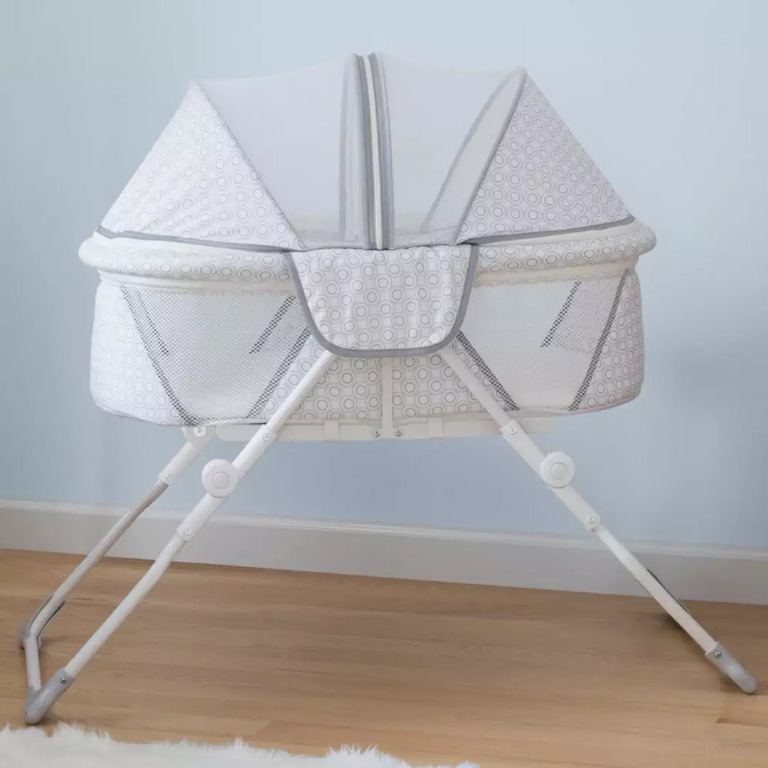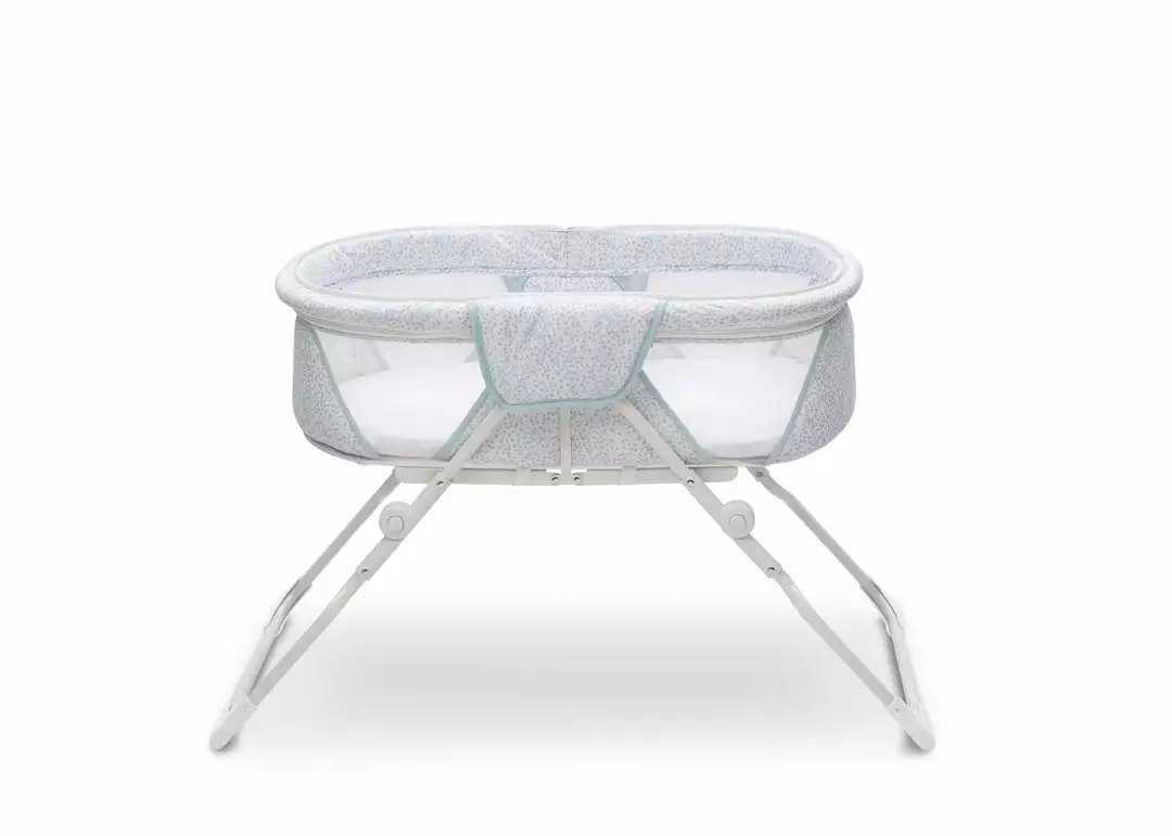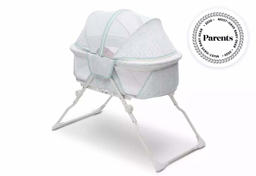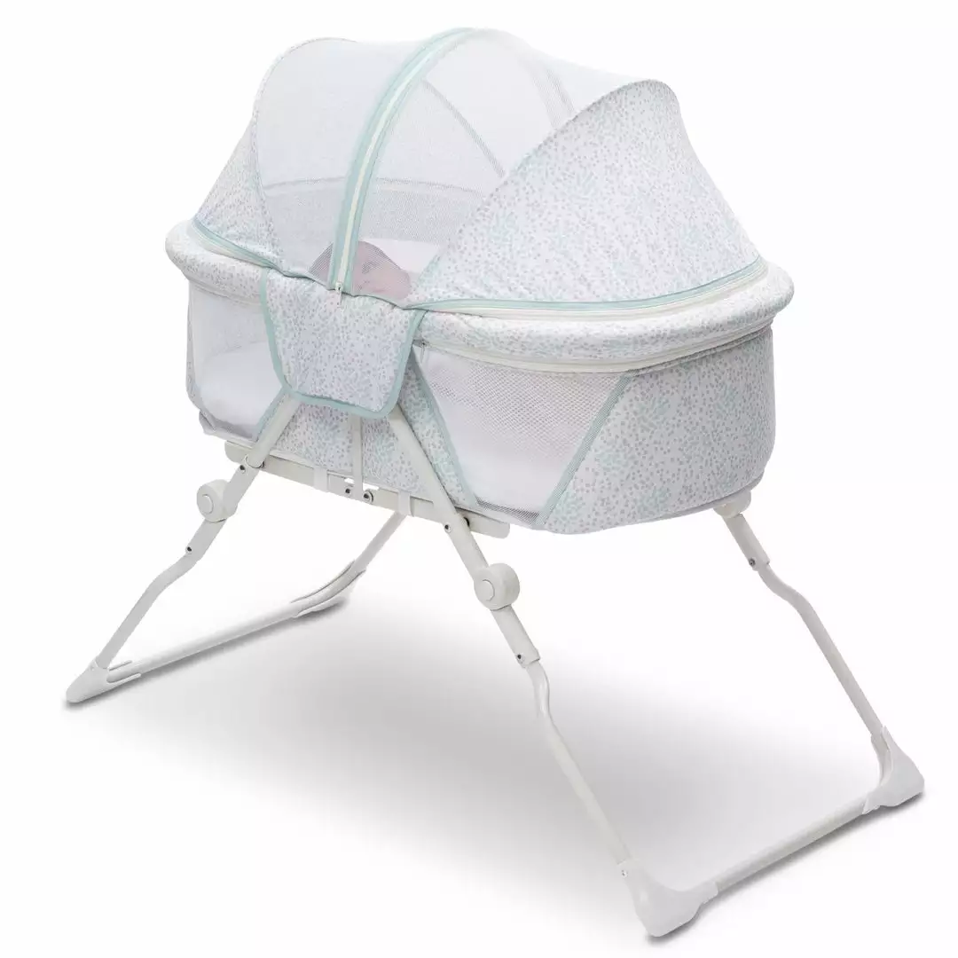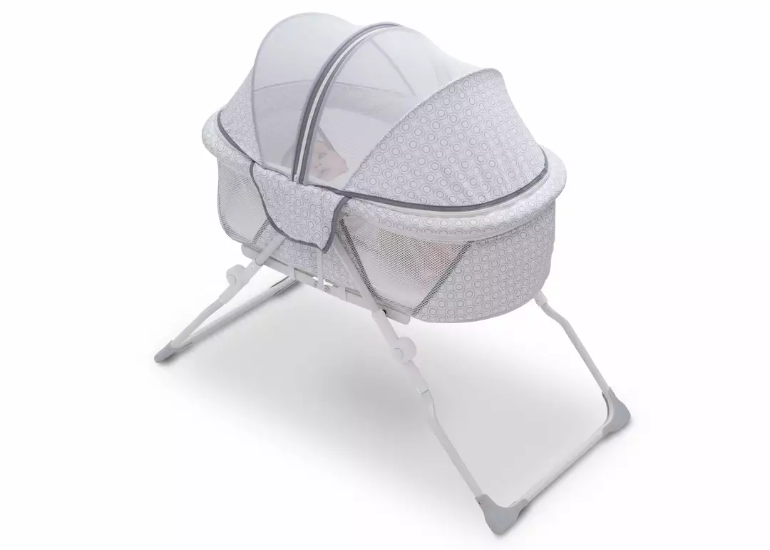 Whether youâre traveling with your baby or in need of ï»ża portable sleeper in your home, the EZ Fold Ultra Compact Travel Bassinet from Delta Children makes naptime and bedtime a breeze! The most compact full size bassinet available, this sleeper ensures your baby has the room they need to rest comfortably while the lightweight design means you can bring it anywhere and everywhere without trouble. Easy to setup and store away, the bassinet requires no assembly, and folds flatâthe included travel bag makes every outing with Baby stress-free. Designed with mesh panels on the sides for airflow and increased visibility, the EZ Fold Ultra Compact Travel Bassinet provides the ideal environment for rest and relaxation. The bassinetâs removable canopy protects your little one from curious pets, mosquitos and other insects, and then effortlessly zips off when not needed.