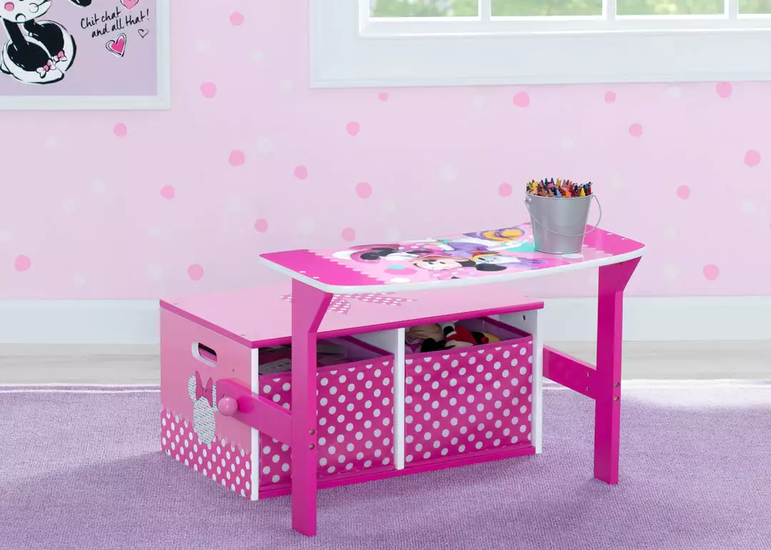 The Disney Minnie Mouse Kids Activity Bench by Delta Children is simply ear-resistible! Adorned with all things Minnie, including a polka dot print, bows and pretty pink hue, this charming bench is timeless, just like Minnie Mouse herself. An ideal choice for your growing Mouseketeer, it features a 3-in-1 design that easily converts from a storage bench to a deskâtransitioning from playtime, to a perfect space for homework, crafts and more, in seconds! This incredibly versatile bench/desk also features ample storage underneath with two fabric bins, offering a perfect spot for kids to keep their toys, books or art supplies. A smart and stylish addition to your little oneâs Clubhouse, this sturdy activity bench will be cherished for years to come.