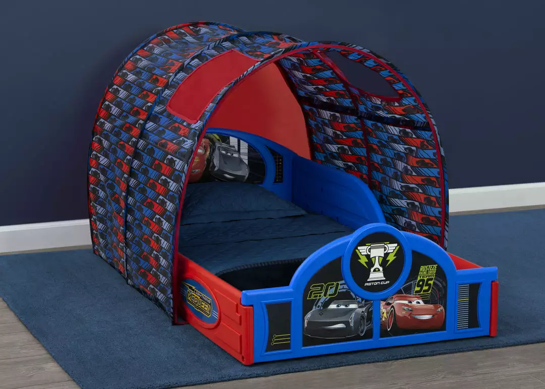 Rev up your little racer’s excitement about bedtime with this Disney/Pixar Cars Sleep and Play Toddler Bed with Tent by Delta Children. The bed’s low mattress height, attached guardrails, cool tent with mesh windows and colorful graphics of Lightning McQueen and Jackson Storm make it the best option for your child’s first big-kid bed—it gives them the independence they crave while keeping them safe throughout the night. And that’s not all, the bed’s versatile plastic frame can also be used as a play enclosure or a ton of other fun things, like a ball pit (play balls not included). Get this toddler tent bed today and bring home the excitement of Disney/Pixar Cars today!