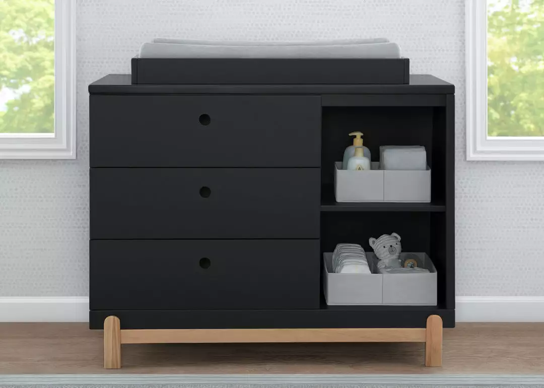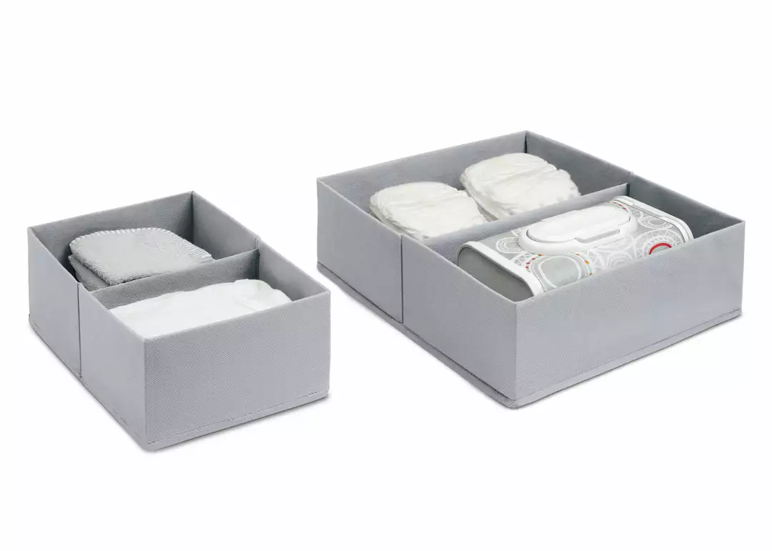 Create a cozy and organized place for your baby during diaper changes with this 7-Piece Essential Changing Table Set by Delta Children. This convenient set includes all the necessary items—a Changing Pad, Plush Changing Pad Cover, 3 Changing Pad Liners and 2 Storage Bins. The Changing Pad features a secure safety harness with a quick release buckle and a waterproof and hypoallergenic design that easily wipes clean. The Changing Pad Cover is machine washable and provides a plush, comfortable changing environment for your baby. Use the three Changing Pad Liners on top of the changing pad for an additional waterproof layer or use them as a portable changing pad for a soft changing surface while on the go. The included storage bins provide organization, allowing you to keep changing necessities within reach. Packaged in an easily giftable box, this 7-Piece Essential Changing Table Set is the ideal gift for baby showers or new parents.