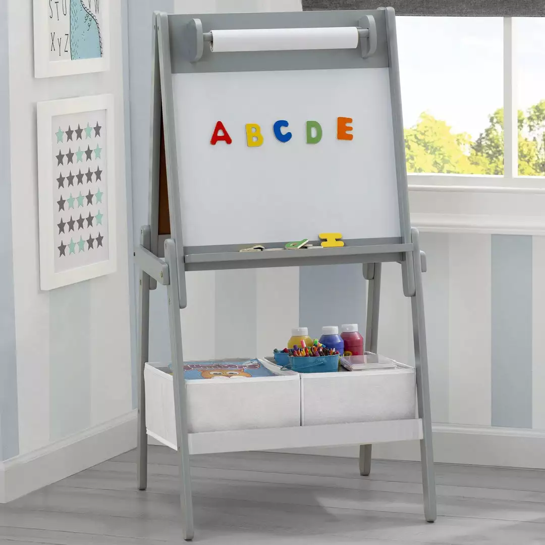 Spark artistic play with the Chelsea Double-Sided Storage Easel with Paper Roll and Magnets from Delta Children. This two-sided easel for kids features three different drawing surfaces–a chalkboard on one side, a magnetic dry-erase whiteboard on the other, and a pull down paper roll on top (33 feet of paper included). Just the right height for growing artists, this kids easel encourages creativity and allows little ones to develop their fine motor skills through painting, drawing, coloring and writing. The included alphabet magnets are ideal for letter recognition, matching, and even simple spelling. Two storage bins underneath the easel keep art supplies neat and nearby. Easel coordinates with other items in the Chelsea Collection from Delta Children.