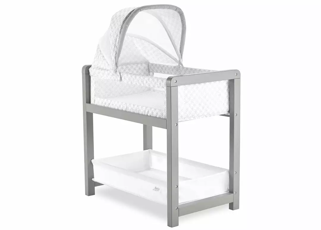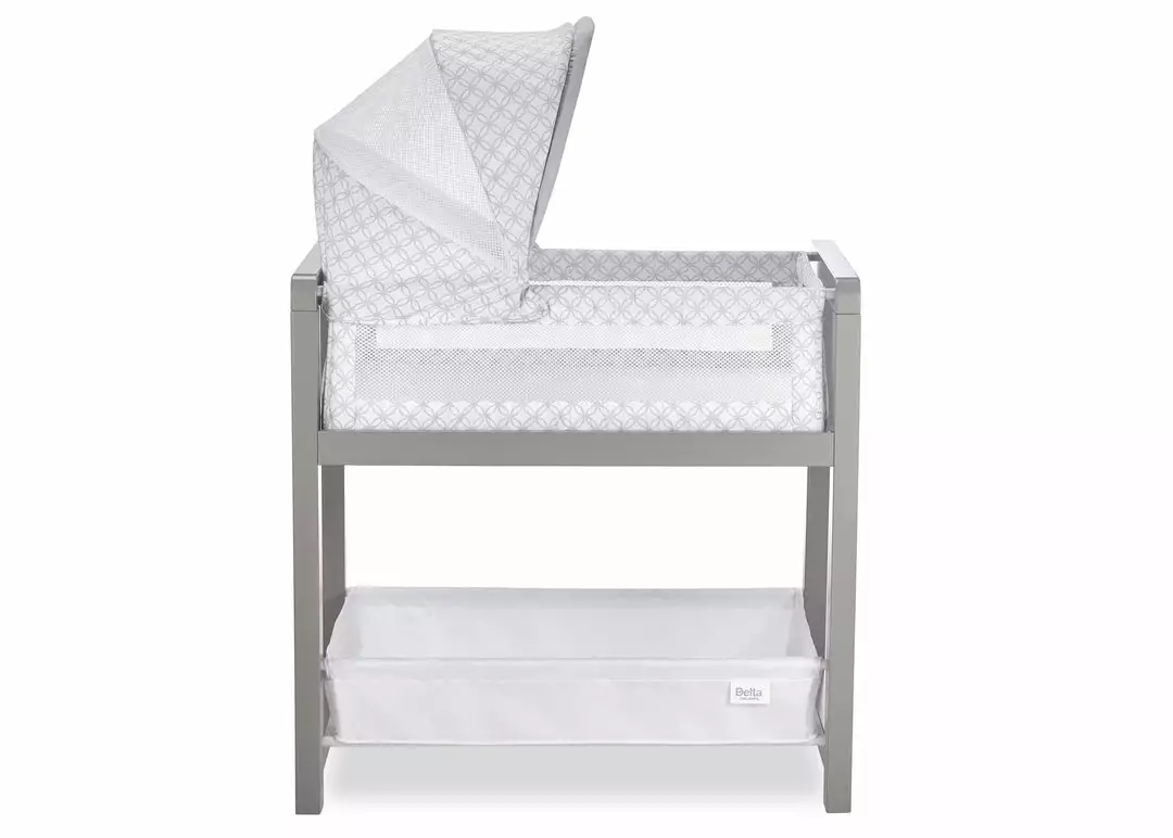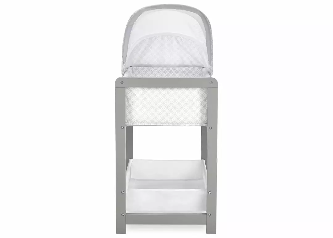 Enjoy peaceful moments from naptime to nighttime with the Classic Deluxe Wood Bedside Bassinet Sleeper by Delta Children. It features a solid wood frame and legs with grey finish and gender-neutral pattern that complements any décor. A safe and comfortable place to sleep anywhere in your home, this bassinet is lightweight enough to be easily moved from room to room. Mesh sides allow generous airflow, while the adjustable canopy helps diffuse light to create a dimmer sleeping environment during the day. This bassinet is recommended for babies 0-5 months. Max weight 30 lbs. Stop use at 5 months or once your infant begins to push up on their hands and knees, whichever comes first.