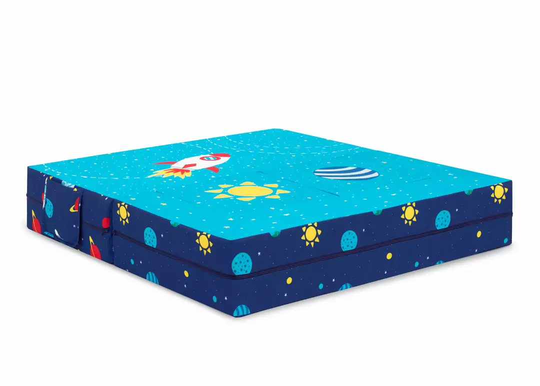 It’s a sofa! It’s a play mat! It’s a fort! The Convertible Foam Sofa and Play Set by Delta Children can be whatever your child imagines. The sofa’s convertible design with two included ottomans allows your little one to use it in so many ways. Use it as a sofa to watch TV, flip it open to use as a play mat or move the parts to configure a puppet theater, castle, ball pit or obstacle course. This modular play couch made up of three foam pieces will give kids hours of entertainment and encourage imaginative play while helping improve gross motor skills. The perfect addition to your child’s bedroom or playroom, the sofa’s sturdy foam base and soft slipcover with a storage pocket and printed with a super-cool outer space pattern is a super-safe play structure. Slipcovers are removable and machine washable. Recommended for ages 18 months and up.