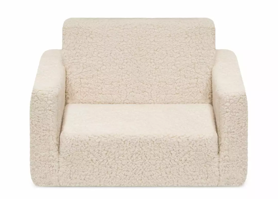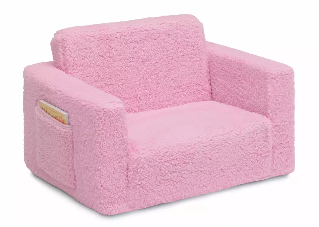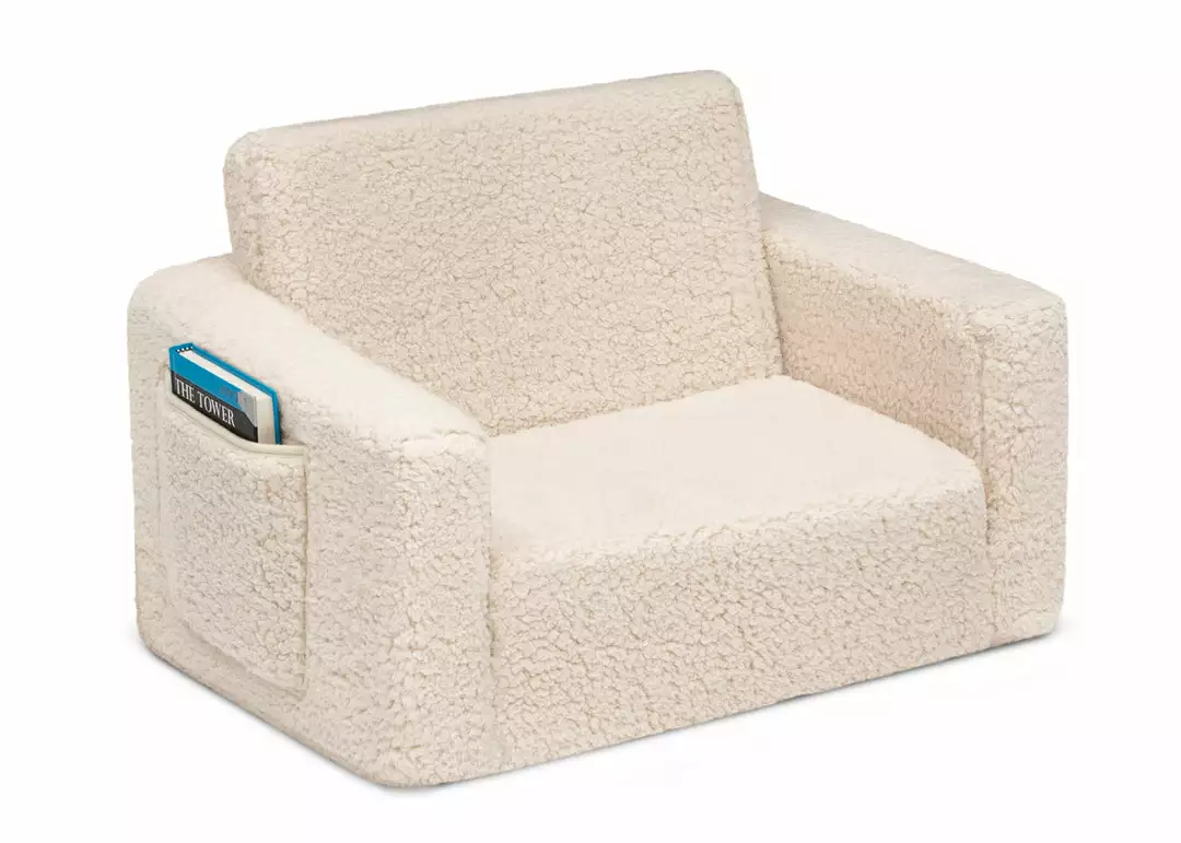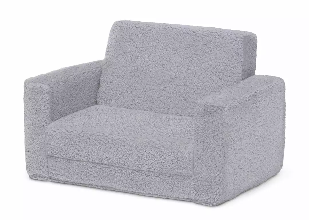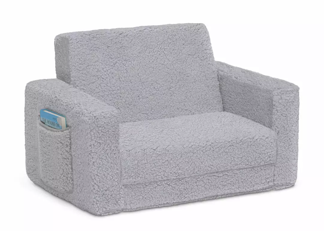 The Cozee Flip-Out Sherpa 2-in-1 Convertible Chair to Lounger by Delta Children is a cozy chair by day, laid-back lounger by night. This convertible seat easily flips open to reveal multiple ways for your child to relax–theyâll love to sit and read or watch their favorite movies on the chair but when itâs time for a nap, this seat folds out into a comfy sleeper bed. Big enough to fit two small kids comfortably in chair mode, itâs light enough to move around the house and is ideal for your children to share during playtime or sleepovers. The super-soft Sherpa slipcover with easy-to-reach side pocket creates the ultimate retreat for your little one. The supportive foam construction will keep its shape and provides all-day comfort. Designed to ship in a super-small box, this lightweight foam kidsâ chair and lounger may take up to 24 hours to fully expand once unboxed. Machine-washable slipcover zips off for easy cleaning. Recommended for ages 18 months+.