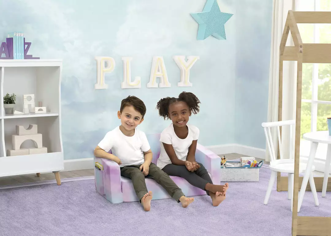 The Cozee Flip-Out 2-in-1 Convertible Sofa to Lounger by Delta Children is a cozy chair by day, laid-back lounger by night. This convertible seat easily flips open to reveal multiple ways for your child to relax–they’ll love to sit and read or watch their favorite movies on the chair but when it’s time for a nap, this seat folds out into a comfy sleeper bed. Big enough to fit three small kids comfortably in sofa mode, it’s light enough to move around the house and is ideal for your children to share during playtime or sleepovers. The super-soft slipcover with easy-to-reach side pocket is treated with Scotchgard stain release finish to resist stains, ensuring the sofa looks beautiful for years to come! The supportive foam construction will keep its shape and provides all-day comfort. Designed to ship in a super-small box, this lightweight foam kids’ sofa and lounger may take up to 24 hours to fully expand once unboxed. Machine-washable slipcover zips off for easy cleaning. Recommended for ages 18 months+.