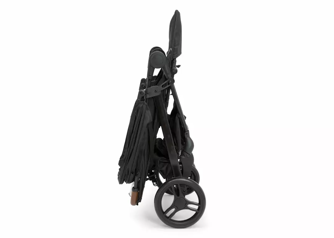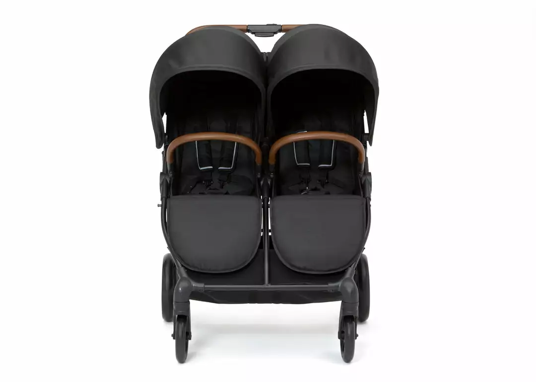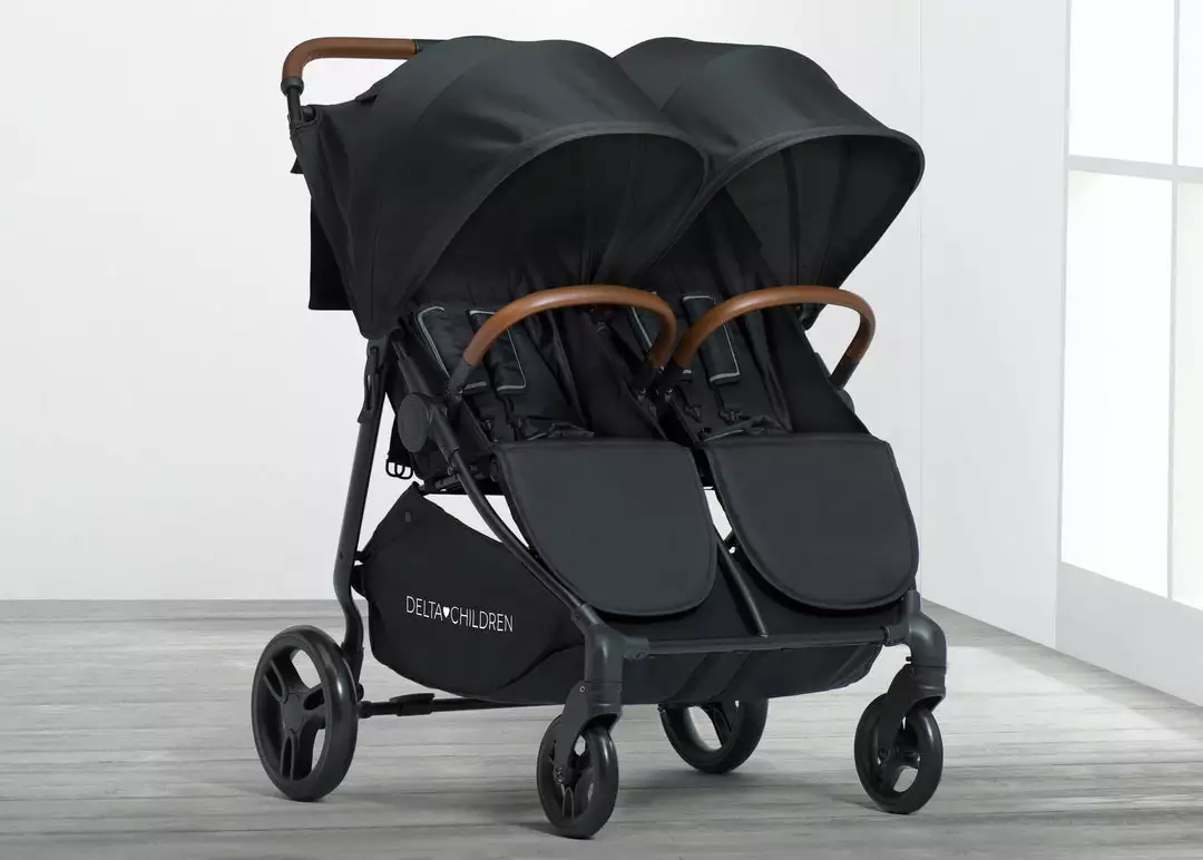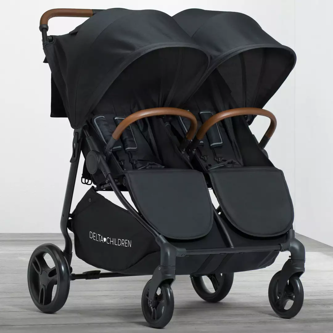 Siblings, twins or friends can ride side by side comfortably with the Delta Children Cruzer Double Stroller. Featuring front swivel wheels for 360-degree maneuverability and one-step back brake for ultra-smooth rides, this double stroller will not weigh you down thanks to its lightweight frame and puncture-proof airless tires that will never go flat. The strollerâs two front-facing seats feature multi-position recline, adjustable footrests and two extendable canopies with peek-a-boo windows for ultimate comfort. Two detachable storage pockets on the back and extra-large storage baskets under the seats ensure you have plenty space for all your travel necessities. The compact, flat fold with auto latch lock provide ultimate convenience. Designed with a soft, faux leather handlebar and child bar, the modern design of this everyday stroller is easy to navigate, transport, and store. Stroller features two 5-point safety harness and reflective shoulder pads.Â