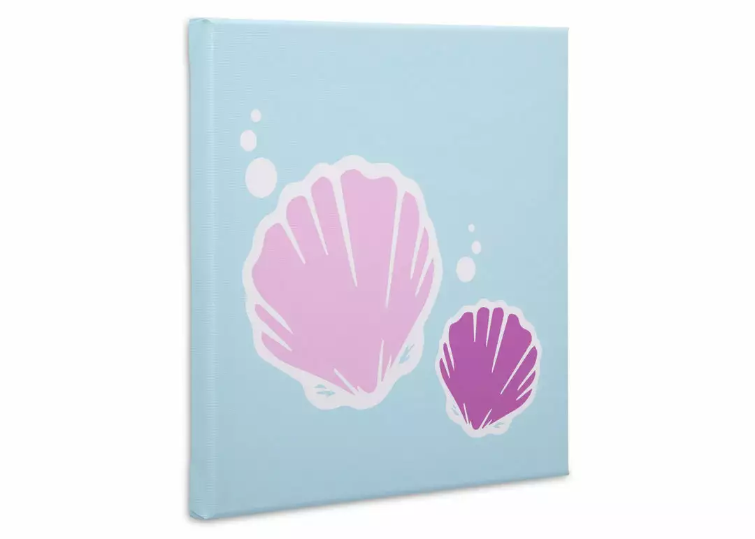 This Seashell 3-Piece Wall Art Set by Delta Children will add seaside style to any space. Designed to create a magical gallery wall, these three large canvases feature graphics of a mermaid tail, seashells and “Under the Sea” typography. Printed on poly canvas and wrapped around a wood frame, each piece features a sawtooth backing for easy mounting. Place all three canvas on the same wall, spread them around the room or lean them against the wall on a dresser—you’ll add a dash of charm wherever you place them. Ideal for mermaid-inspired nurseries or bedrooms, this wall art set coordinates with the Seashell Rug by Delta Children (sold separately).