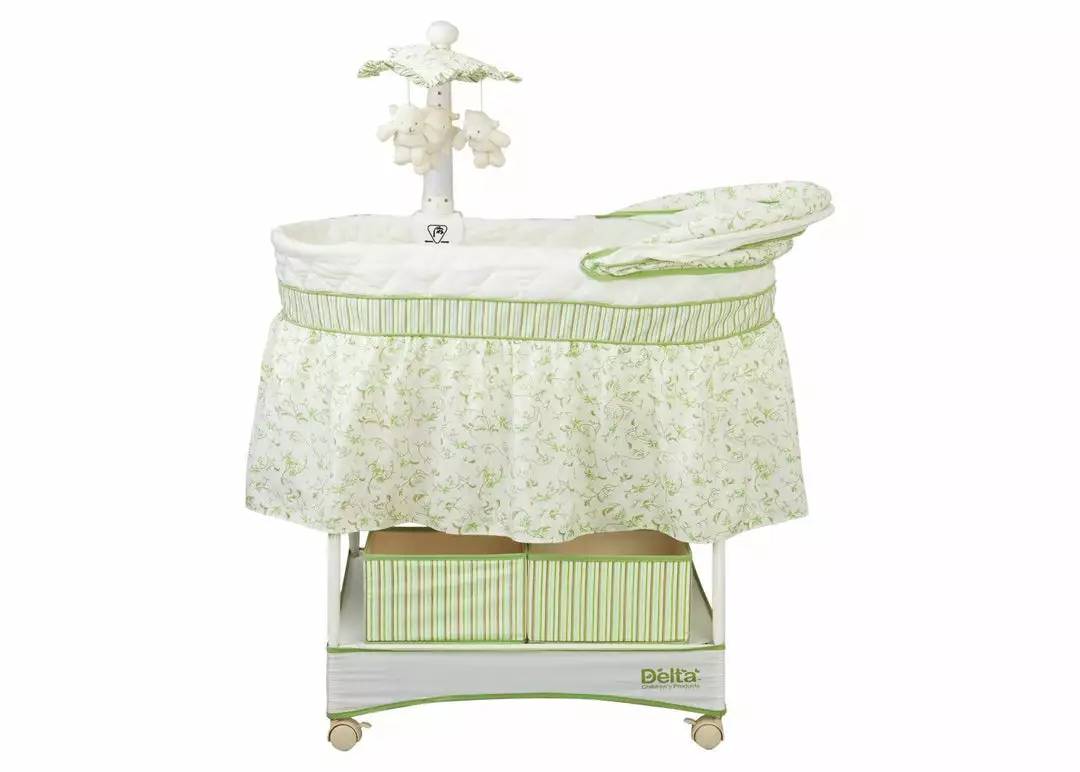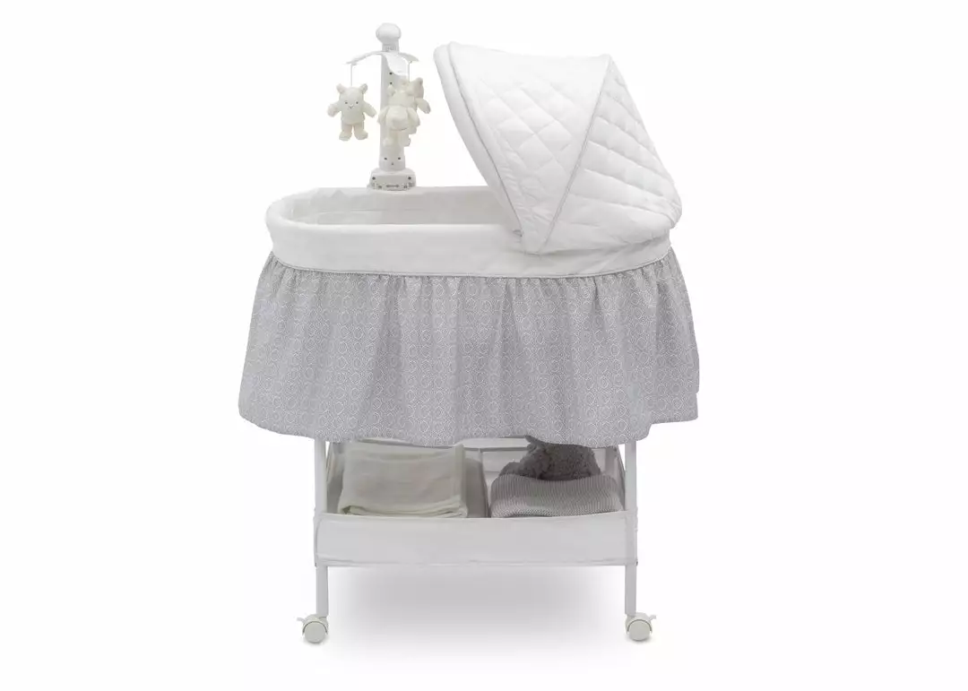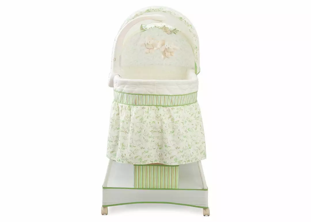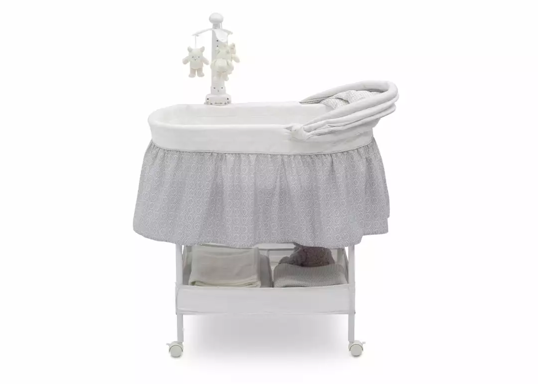 As beautiful as it is practical, the Deluxe Gliding Bassinet from Delta Children will lull your little one to sleep with soothing music, soft nightlight and an electronic mobile accented with three plush bears. This safe, super-cozy bassinet outfitted with swivel wheels makes keeping baby close at night easy, while a large, two-section basket underneath provides extra storage for all of baby’s essentials. Includes a mattress pad and matching sheet. Machine washable sheet for easy cleaning.