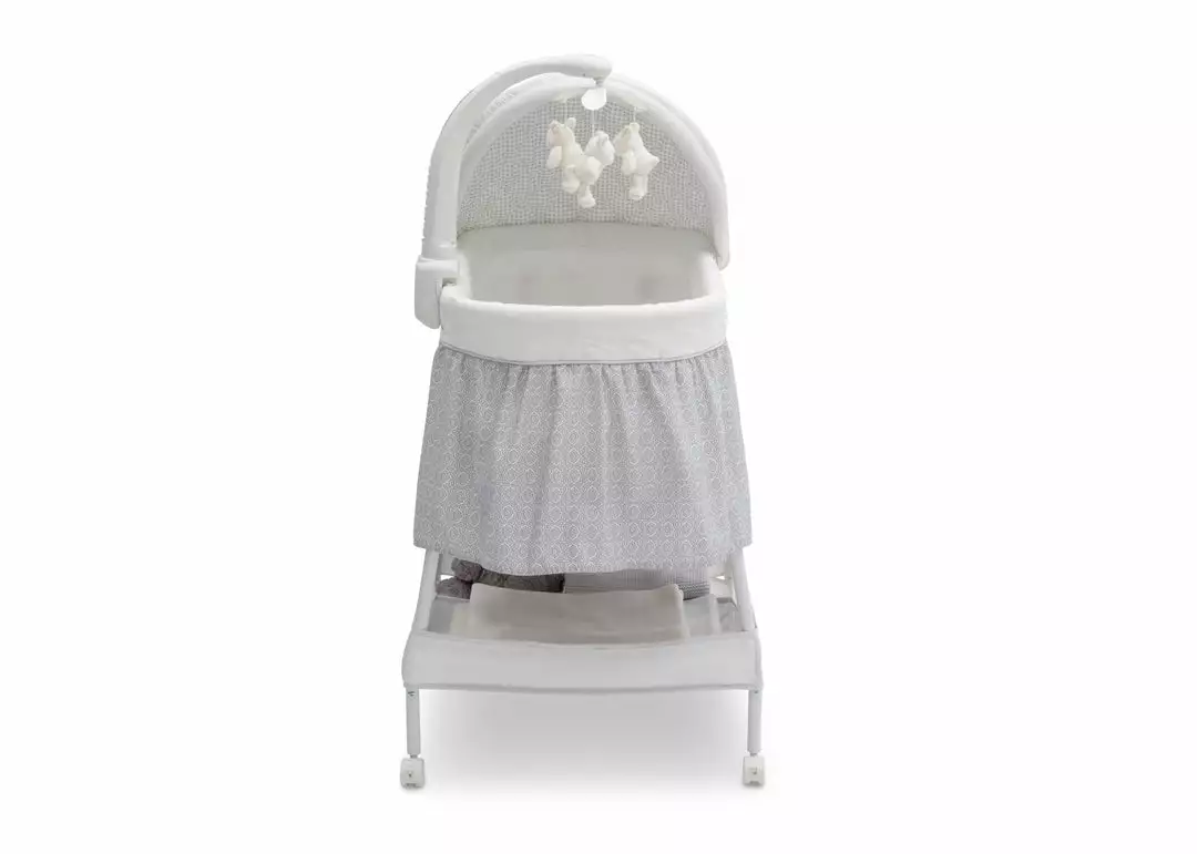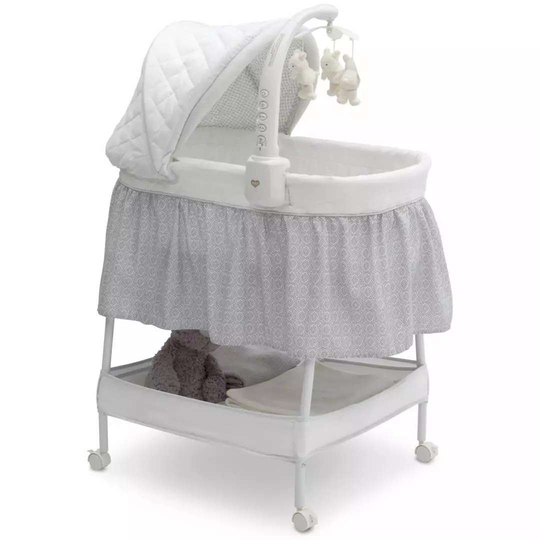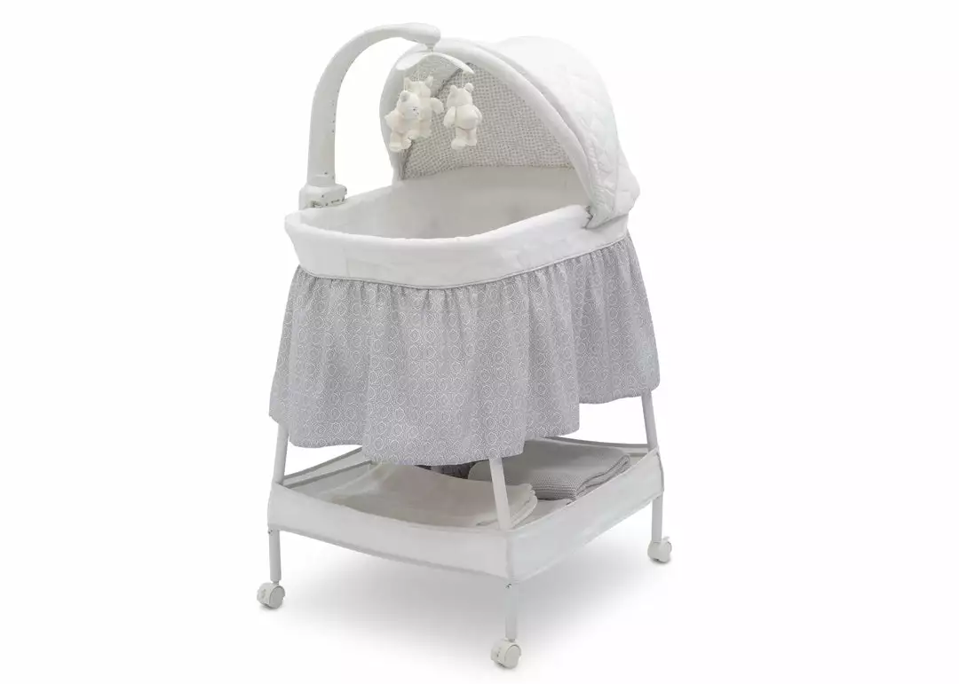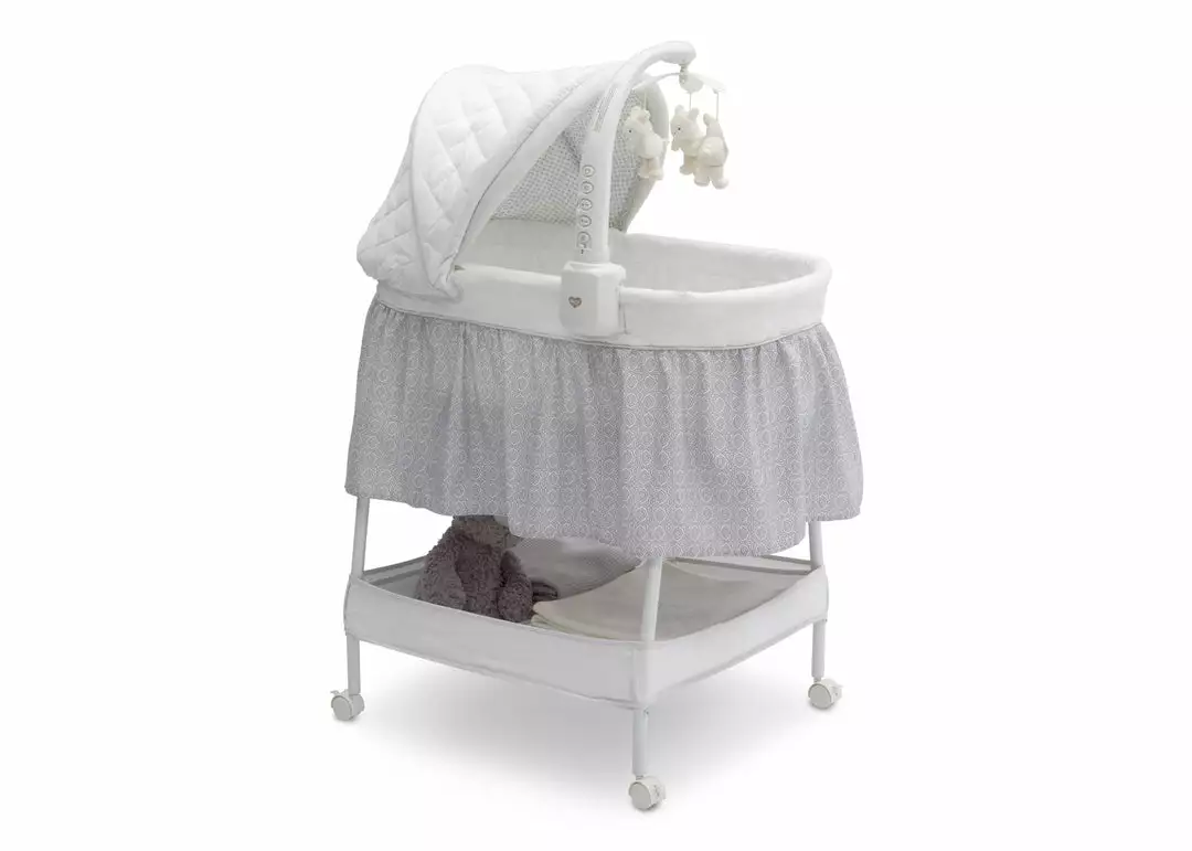 As beautiful as it is practical, the Deluxe Gliding Bassinet from Delta Children will lull your little one to sleep with soothing music, soft nightlight and an electronic mobile accented with three plush bears. This safe, super-cozy bassinet outfitted with swivel wheels makes keeping baby close at night easy, while a large, two-section basket underneath provides extra storage for all of baby’s essentials. Includes a mattress pad and matching sheet. Machine washable sheet for easy cleaning.