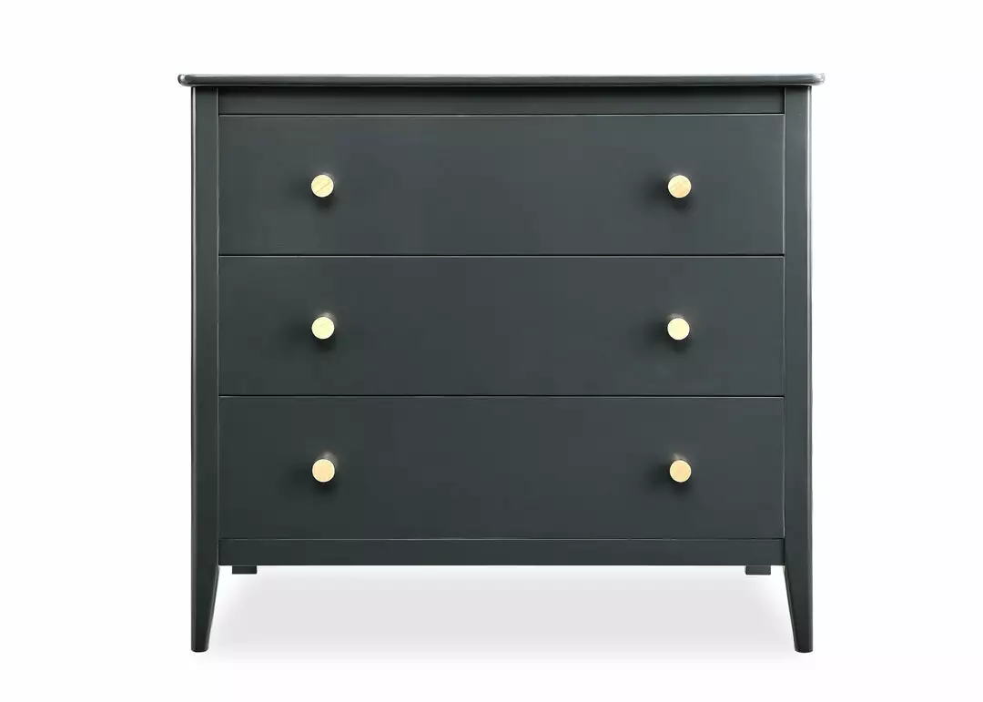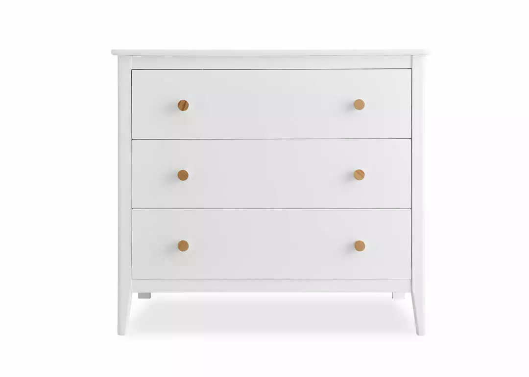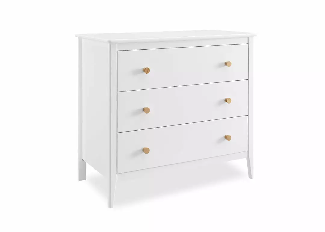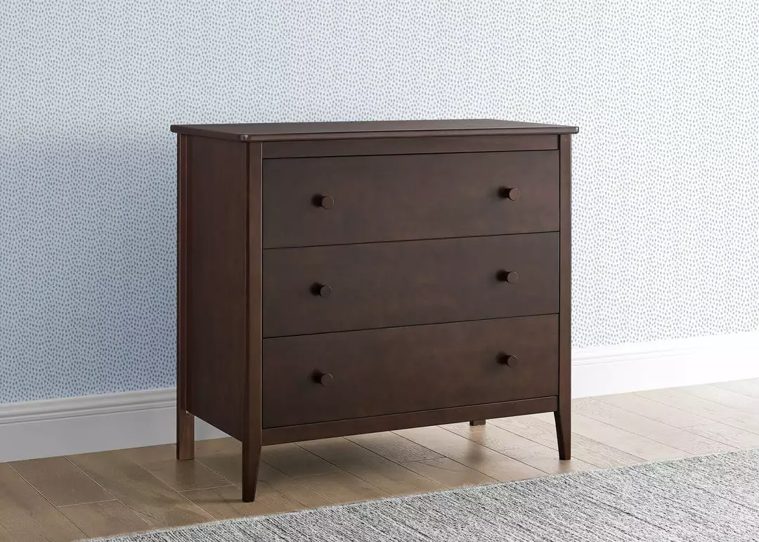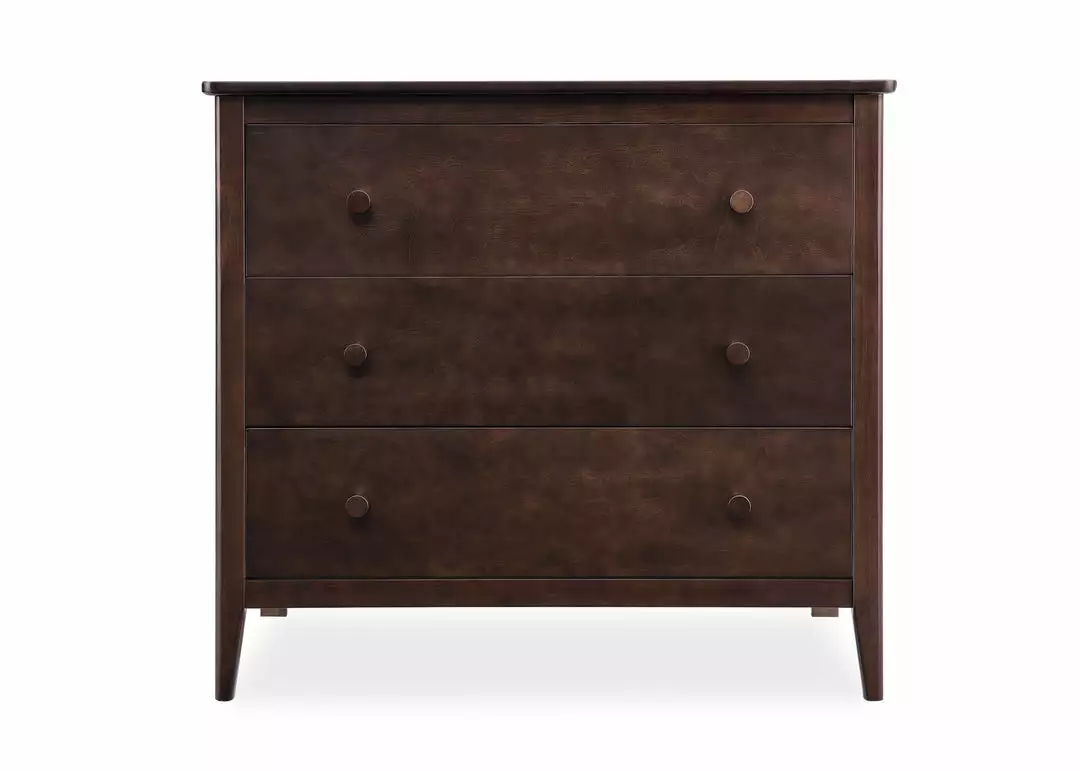 The Casey 3 Drawer Dresser by Delta Children will instantly elevate your nursery with its mid-century modern style. Clean lines, playful round knobs and tapered legs define this beautiful dresser. This dresser also has a smooth metal glide system with safety stops that prevent drawers from pulling out, so it is easy and safe for kids to manage on their own. Pair this dresser with other pieces in the Casey Collection for a coordinated look, as well as the coordinating Changing Top #W100810 (sold separately) to transform this dresser into a convenient changing table.