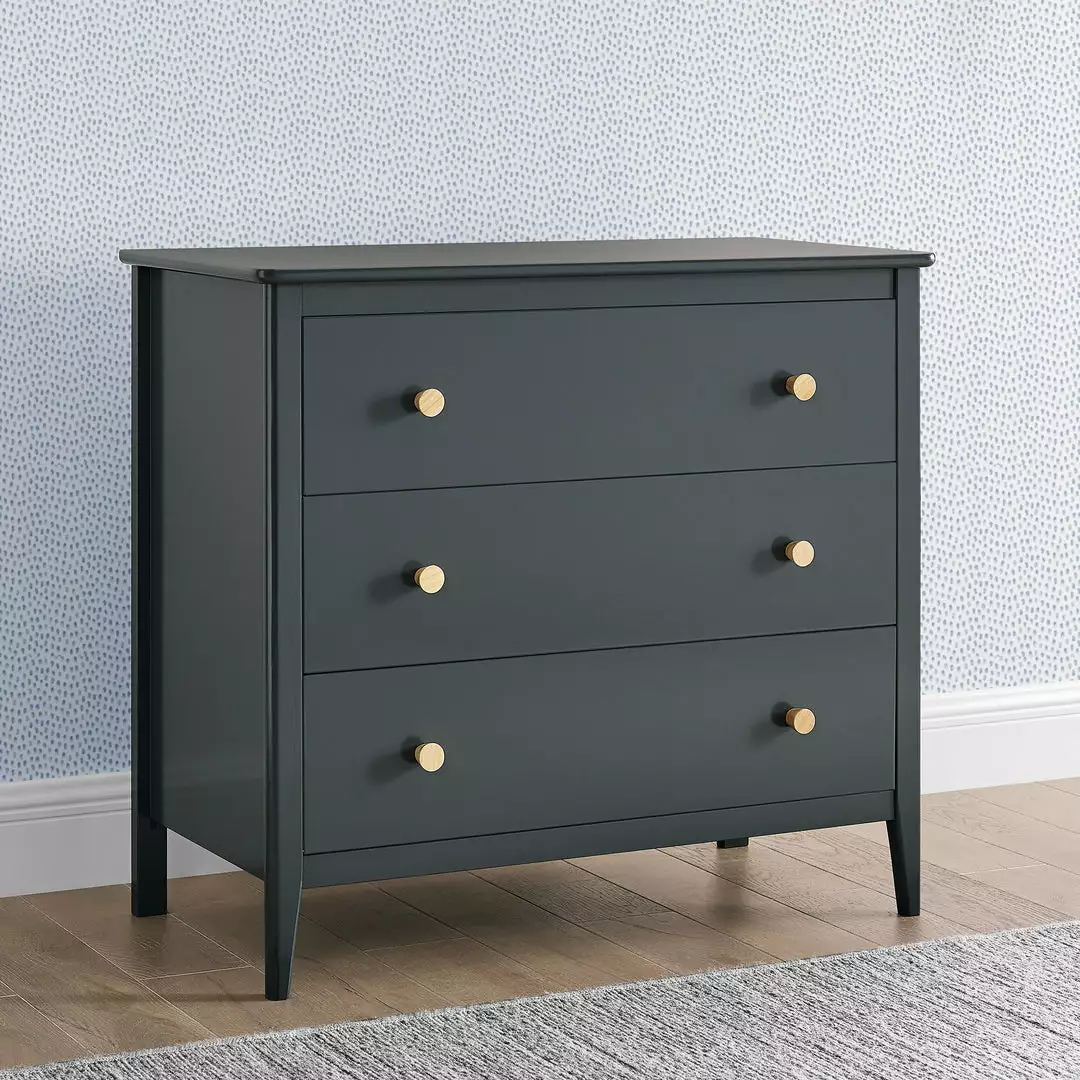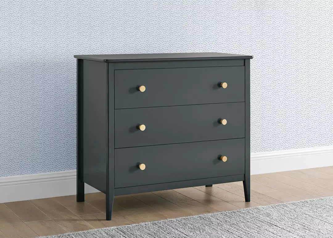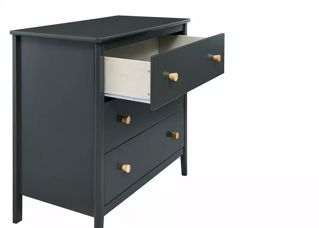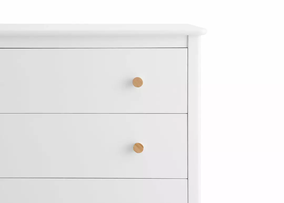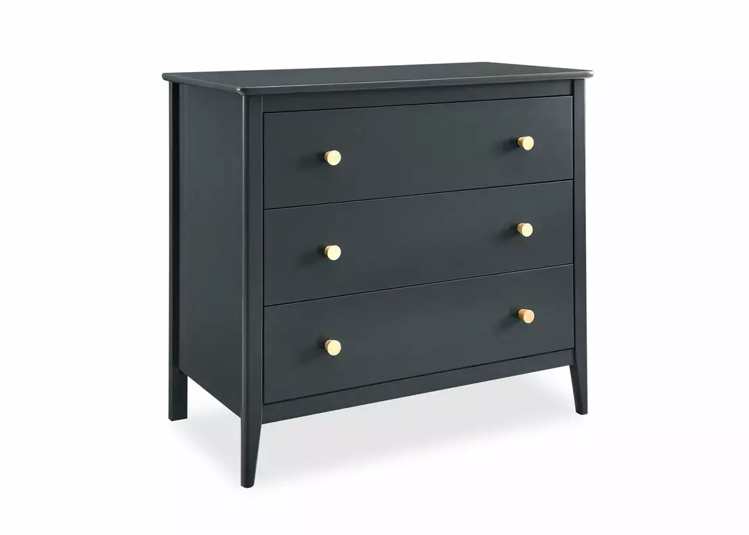 The Casey 3 Drawer Dresser by Delta Children will instantly elevate your nursery with its mid-century modern style. Clean lines, playful round knobs and tapered legs define this beautiful dresser. This dresser also has a smooth metal glide system with safety stops that prevent drawers from pulling out, so it is easy and safe for kids to manage on their own. Pair this dresser with other pieces in the Casey Collection for a coordinated look, as well as the coordinating Changing Top #W100810 (sold separately) to transform this dresser into a convenient changing table.