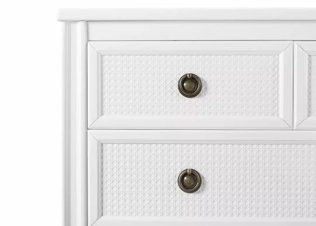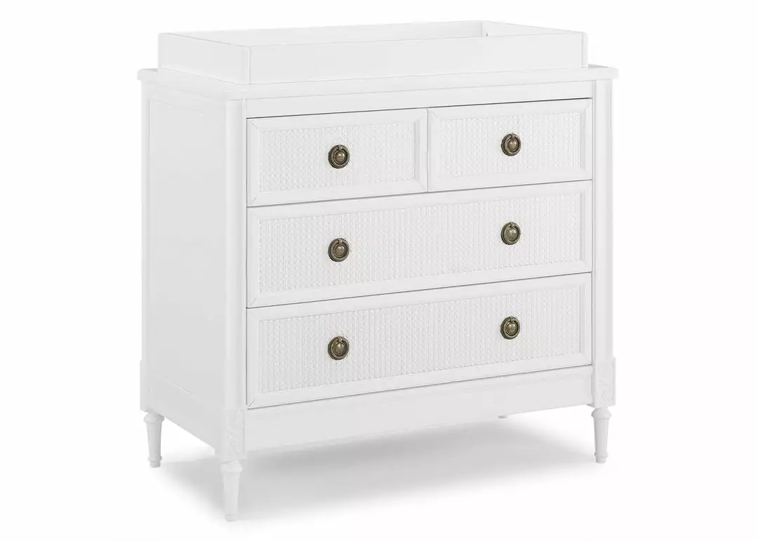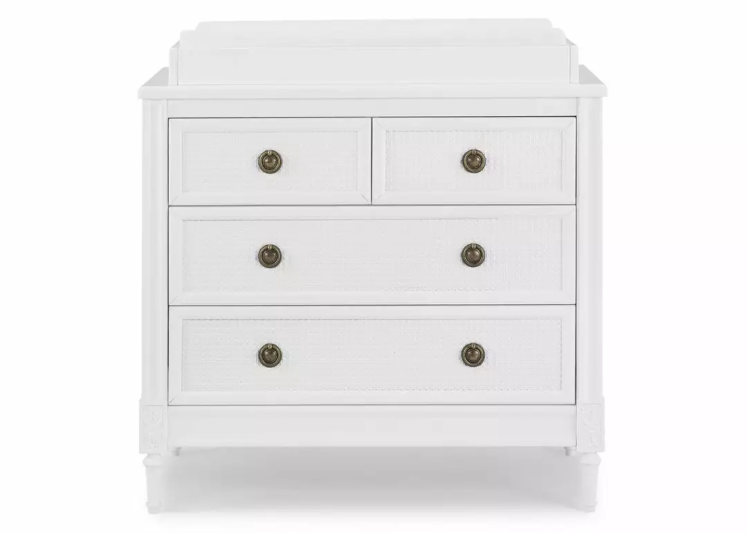 The Madeline 4 Drawer Dresser with Changing Top by Delta Children is an elegant and functional addition to the nursery, kids’ bedroom, even your master bedroom. The timelessness of this dresser is found in the details—the woven cane detailing on the drawer fronts, rosette carvings, fluted legs and antique brass drawer pulls elevate any bedroom. It features four spacious drawers for ample clothing storage and includes a removable changing top that creates the perfect space for diaper changing. Remove the changing top to create a more grown-up space later on. Pair this dresser with other pieces in the Delta Children Madeline Collection for a coordinated look.