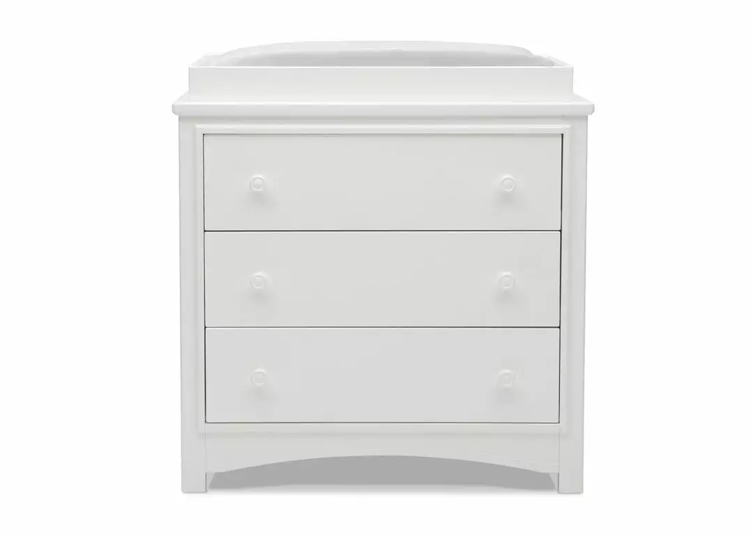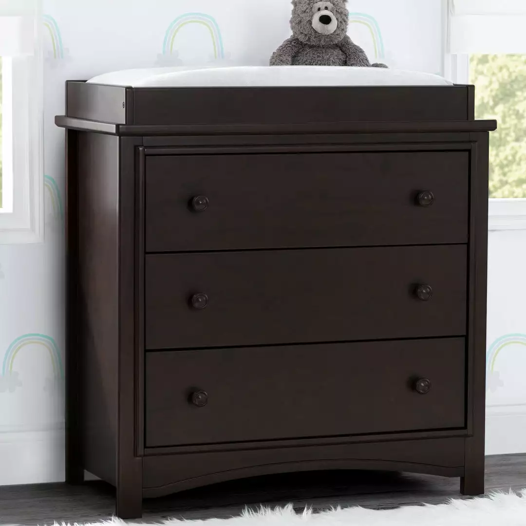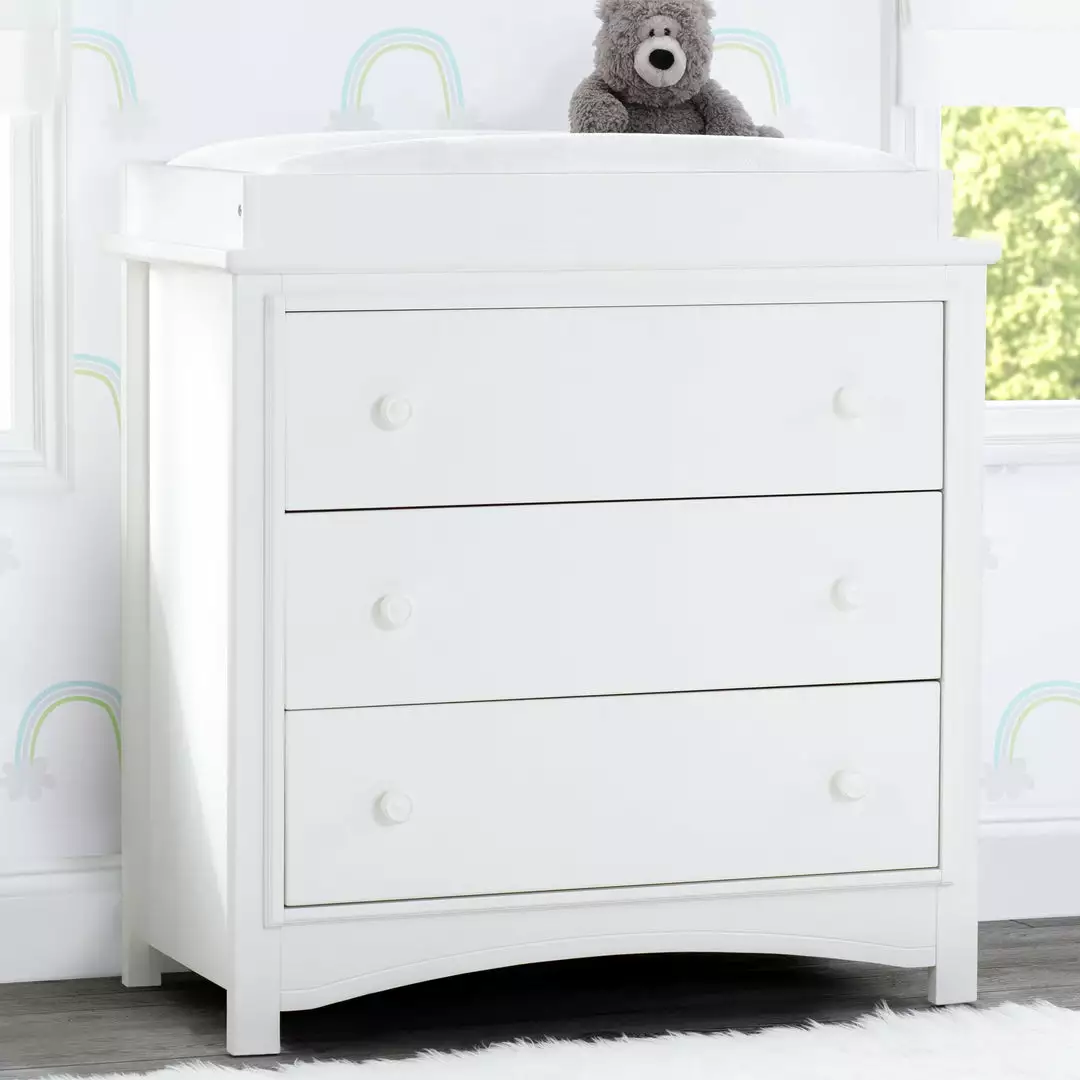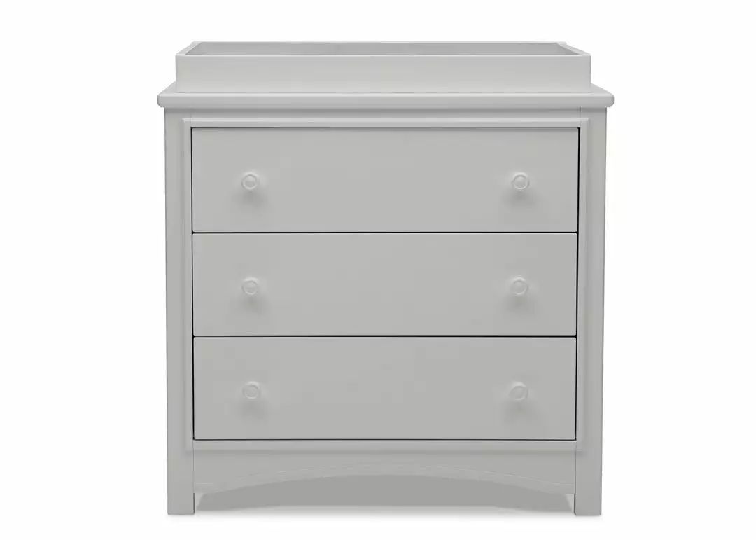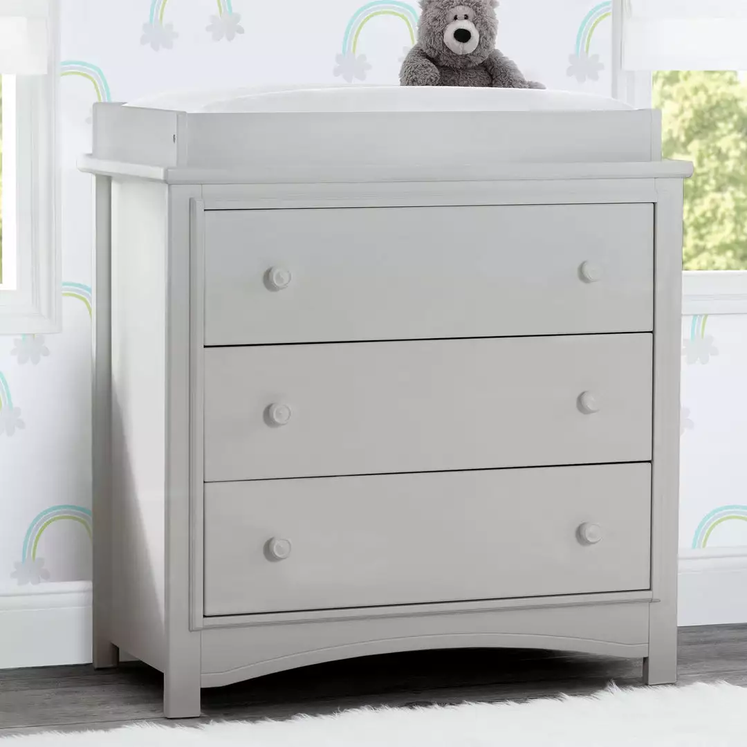 An array of smart design details makes the Perry 3 Drawer Dresser with Changing Top by Delta Children a standout style. The round drawer pulls accent the three spacious drawers that are trimmed with picture frame molding. Topped with a removable changing top, this nursery dresser creates the perfect space for diaper changing sessions now and is easily removable, so you can create a more grown-up space later on. Available in Bianca White, Moonstruck Grey and Walnut Espresso. Complete your space with coordinating items in the Delta Children Perry Collection.