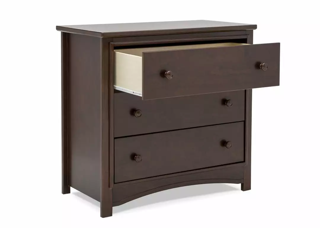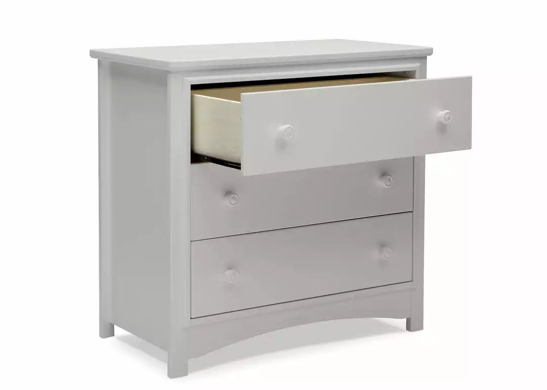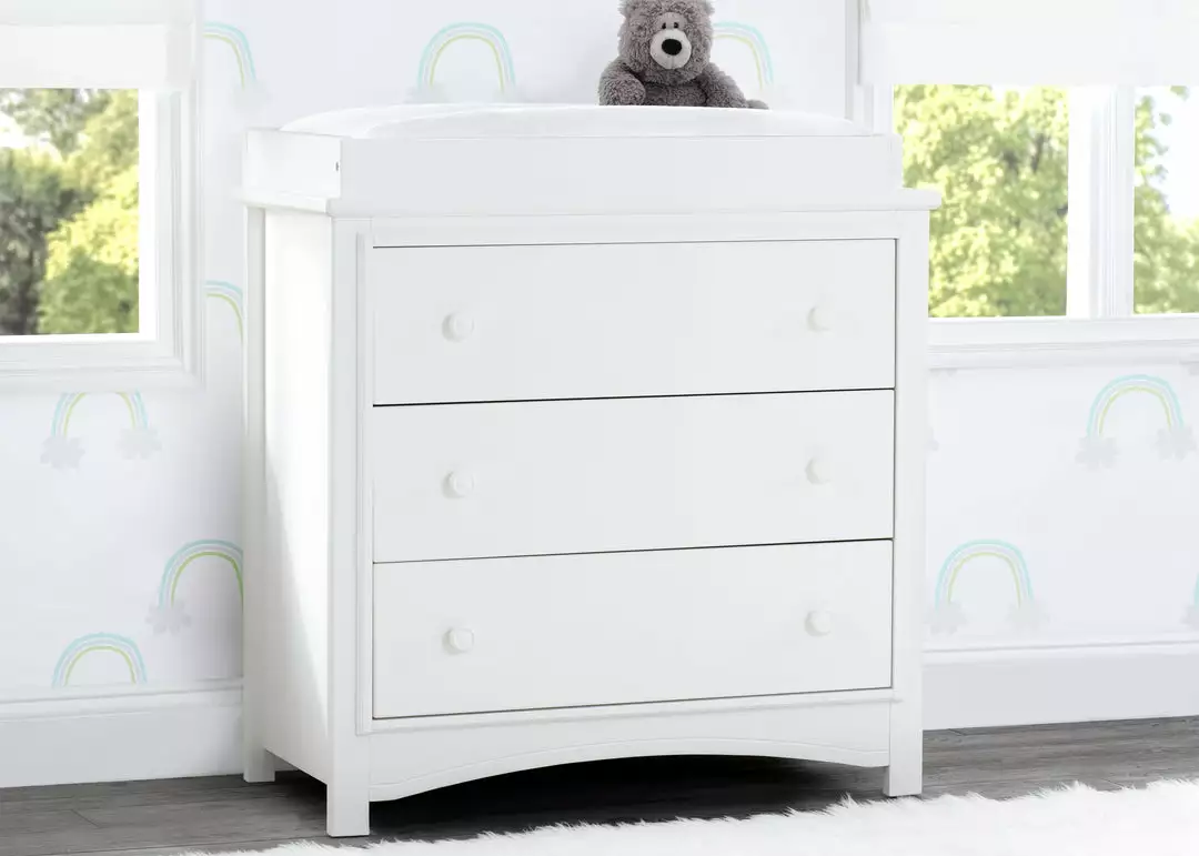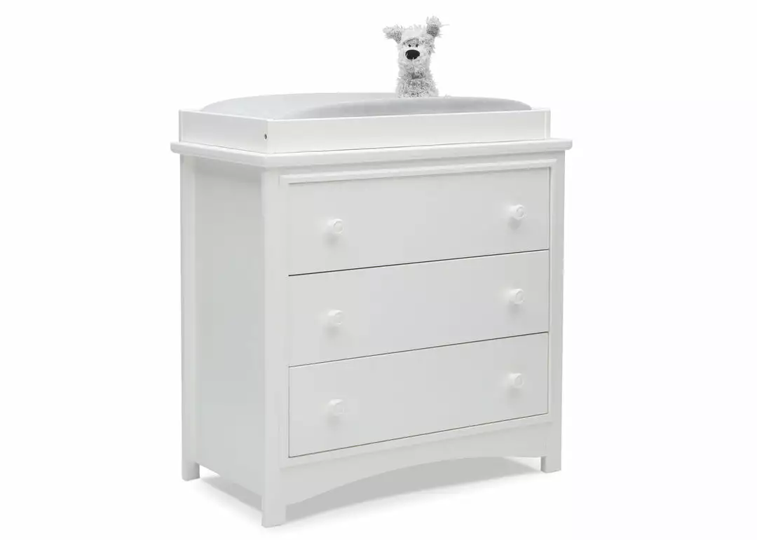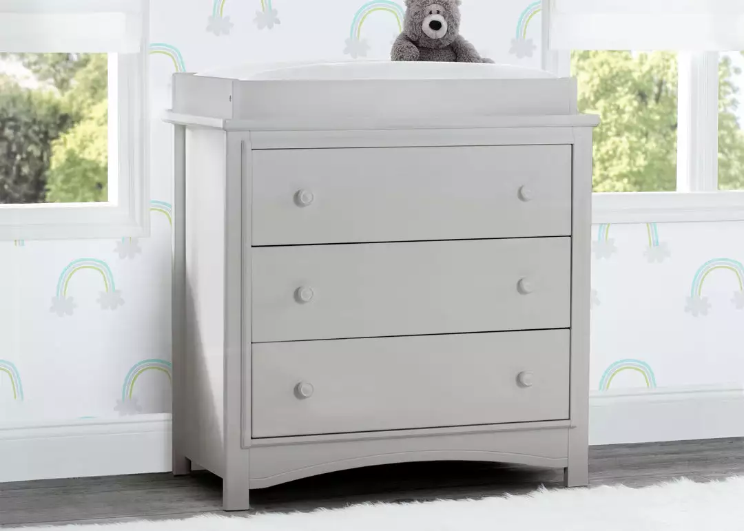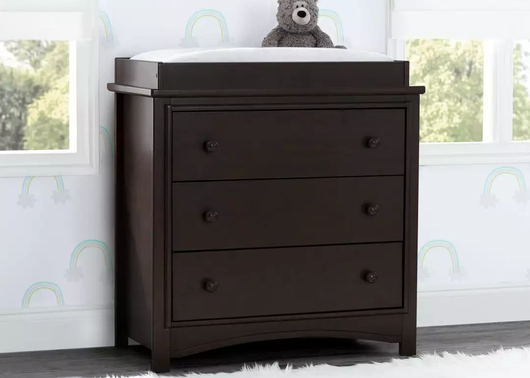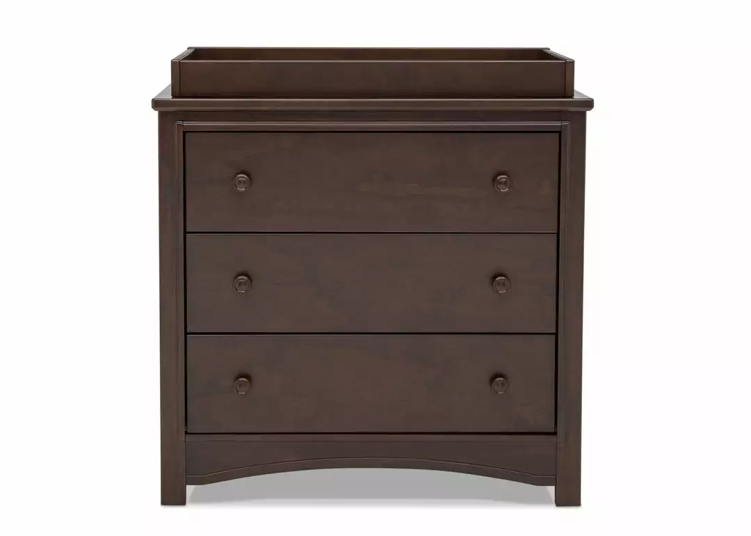 An array of smart design details makes the Perry 3 Drawer Dresser with Changing Top by Delta Children a standout style. The round drawer pulls accent the three spacious drawers that are trimmed with picture frame molding. Topped with a removable changing top, this nursery dresser creates the perfect space for diaper changing sessions now and is easily removable, so you can create a more grown-up space later on. Available in Bianca White, Moonstruck Grey and Walnut Espresso. Complete your space with coordinating items in the Delta Children Perry Collection.
