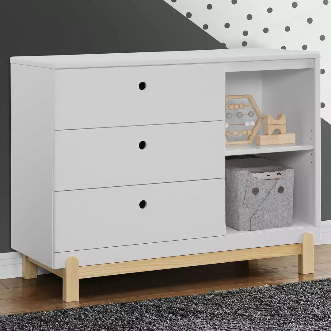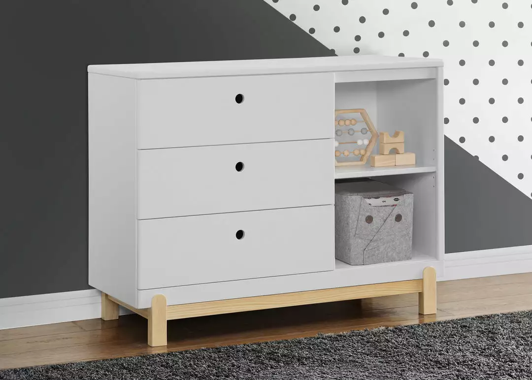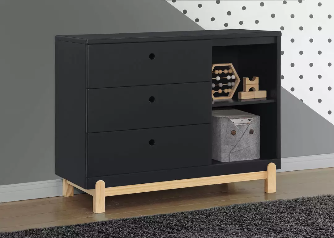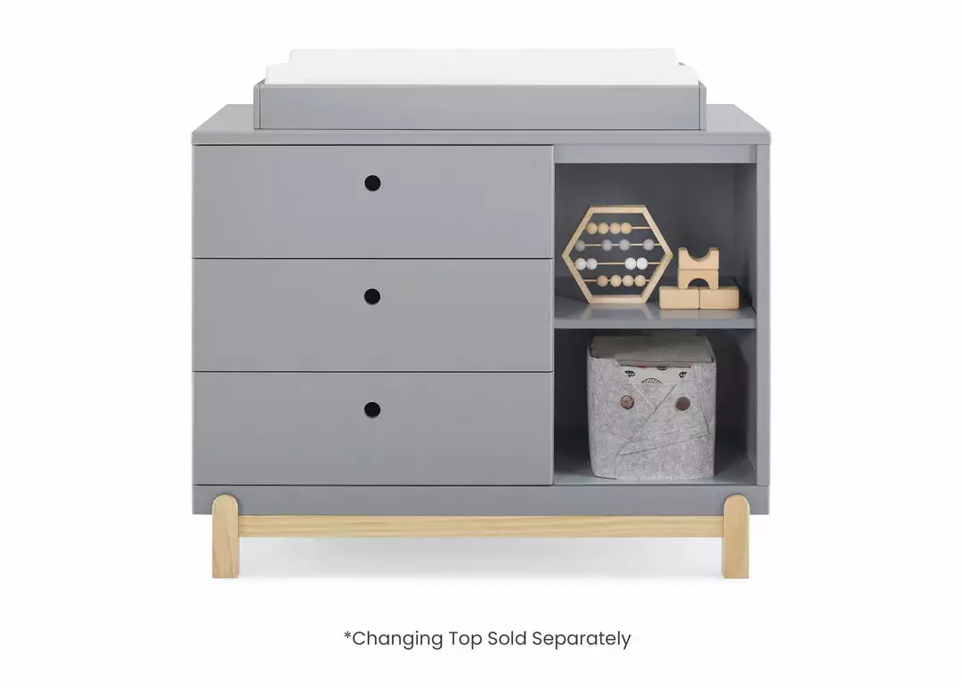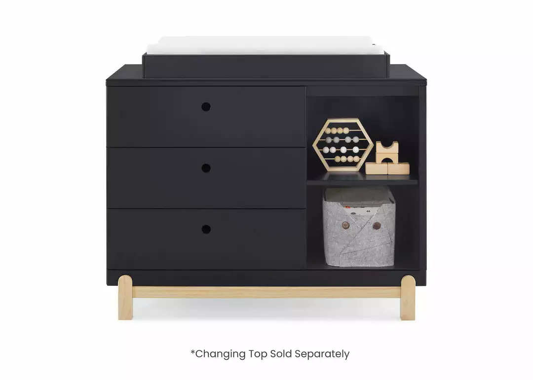 Bring style and convenient storage to your little one’s bedroom with the Poppy 3 Drawer Dresser with Cubbies by Delta Children. This wood dresser features three drawers to keep shirts, pants and socks, while the other side features two open cubbies to house books, bins or toys. Modern and playful, this versatile dresser features a natural wood base and feet paired with a contrasting finish on top for a look that works from baby to big-kid. To complete your child’s bedroom, pair the Poppy 3 Drawer Dresser with Cubbies with the Poppy 4-in-1 Convertible Crib by Delta Children. Dresser is available in Bianca White with Natural, Grey with Natural and Midnight Grey with Natural.