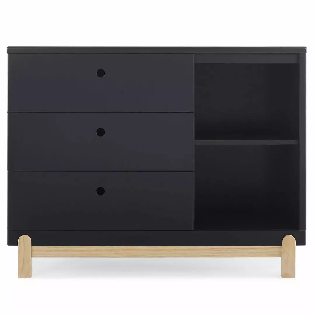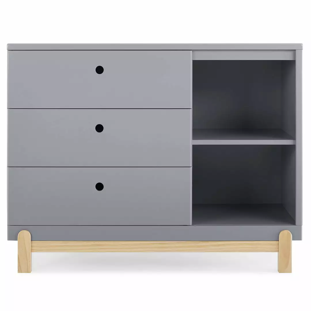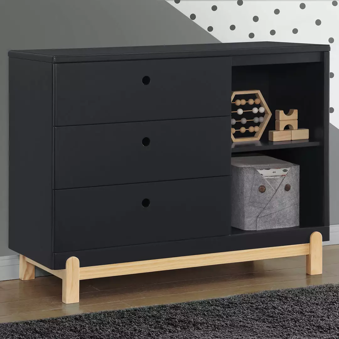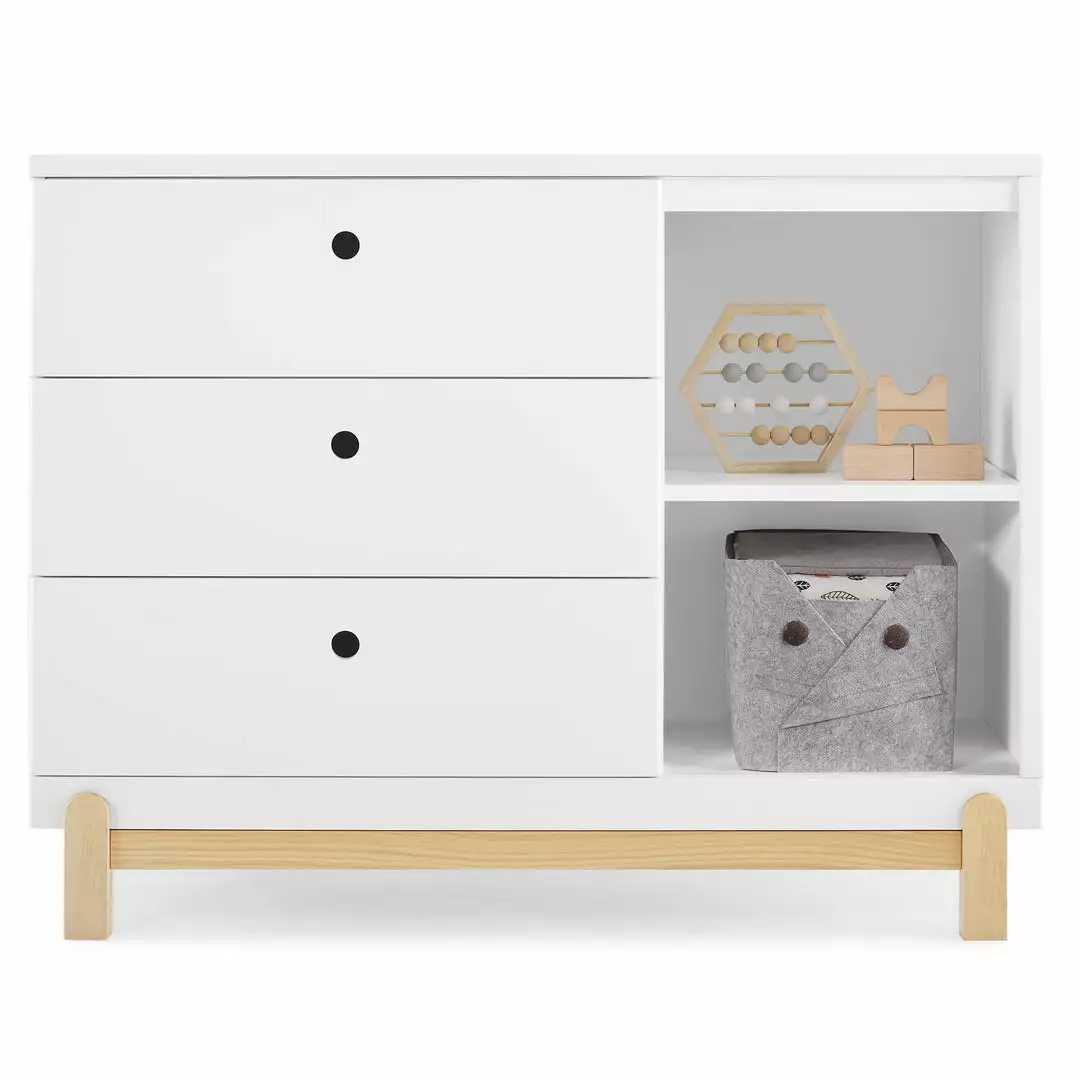 Bring style and convenient storage to your little one’s bedroom with the Poppy 3 Drawer Dresser with Cubbies by Delta Children. This wood dresser features three drawers to keep shirts, pants and socks, while the other side features two open cubbies to house books, bins or toys. Modern and playful, this versatile dresser features a natural wood base and feet paired with a contrasting finish on top for a look that works from baby to big-kid. To complete your child’s bedroom, pair the Poppy 3 Drawer Dresser with Cubbies with the Poppy 4-in-1 Convertible Crib by Delta Children. Dresser is available in Bianca White with Natural, Grey with Natural and Midnight Grey with Natural.