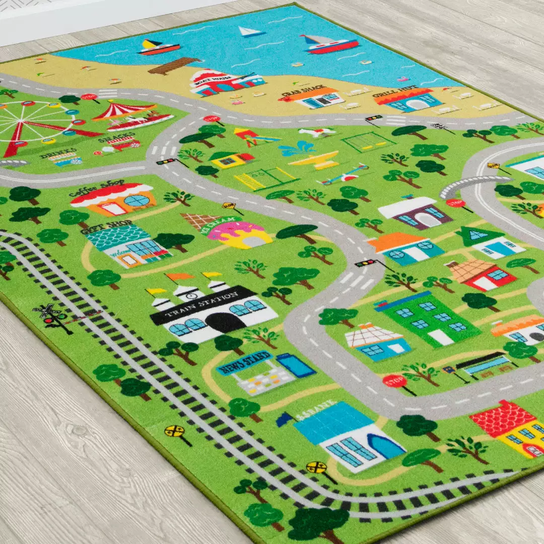 Lay the foundation for endless adventures with this Extra Large Road Map Activity Rug for Girls and Boys by Delta Children! The colorful and detailed town on this comfy playmat rug stimulates kids’ imaginations as they drive past the neighborhood with their own wood or metal cars, trucks and other transportation toys. Large enough to accommodate multiple children, this activity rug with an ariel view of a busting town instantly creates a cozy place for creative play while improving dexterity and hand-eye coordination in any room in your house. The rug’s non-slip latex backing makes it safe to use on types of flooring and reinforced borders prevent fraying. Recommended for ages 3+.