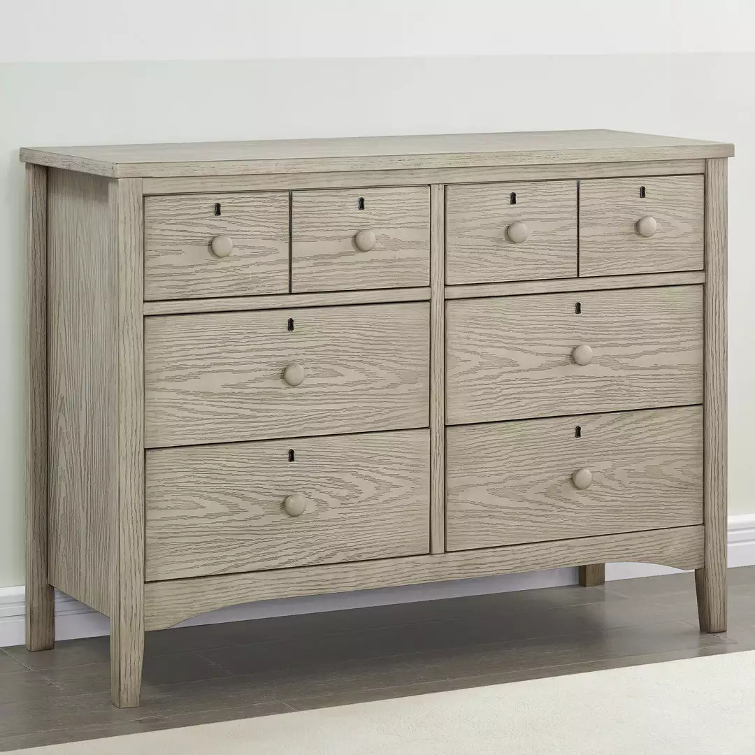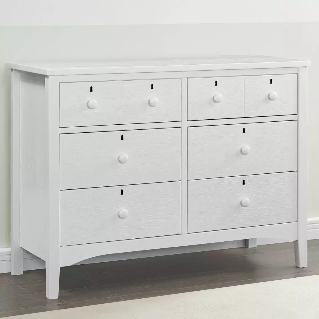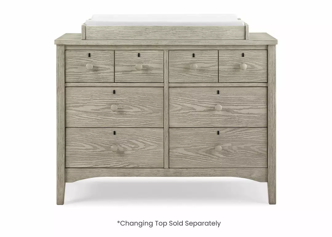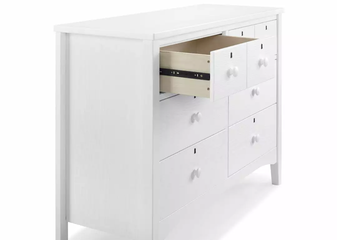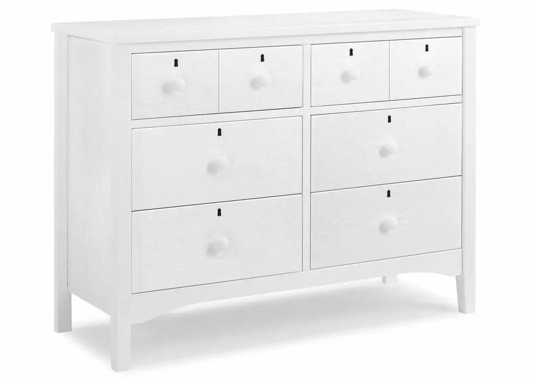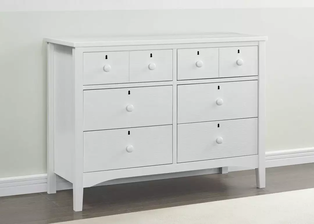 Inspired by rustic design, the Farmhouse 6 Drawer Dresser by Delta Children is set atop tapered legs, finished with a lightly textured technique, and accented with wood drawer pulls and keyholes. A great option for your baby’s nursery or kid’s bedroom, it features six large drawers that provide ample storage space. Available in Textured Limestone, Textured White, Textured Midnight Grey. This dresser coordinates with other items in the Delta Children Farmhouse Collection.