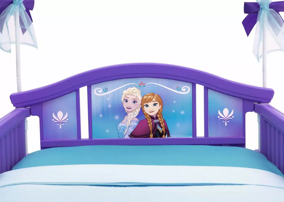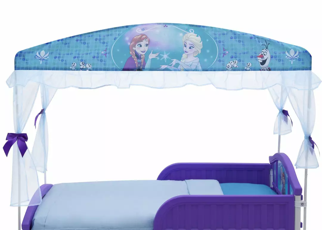 No need to put dreams on ice when you can make them come true with this Disney Frozen Toddler Canopy Bed by Delta Children. Designed in frosty shades of blue and purple, this sturdy kids’ bed topped with a sheer organza canopy will cause a flurry of excitement. Finished with two attached guardrails to help keep your little one from falling out of bed while sleeping, the Disney Frozen Toddler Canopy Bed by Delta Children provides the independence your young princess is after, while keeping her safe all night long. She’ll go on dreamtime adventures to Arendelle in the company of Anna, Elsa and Olaf every night!