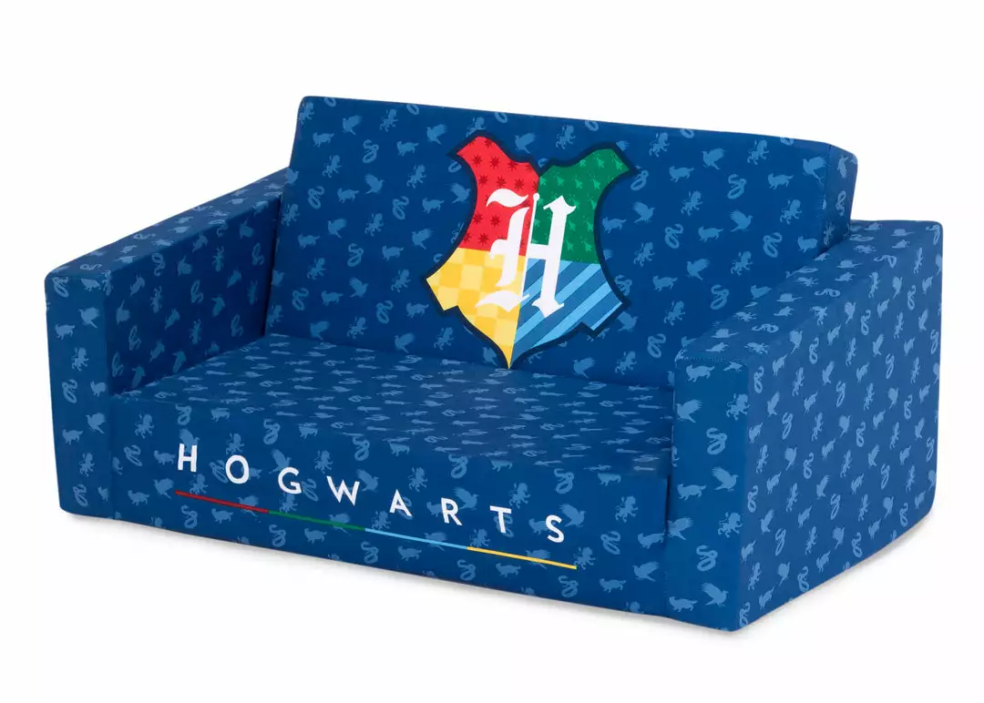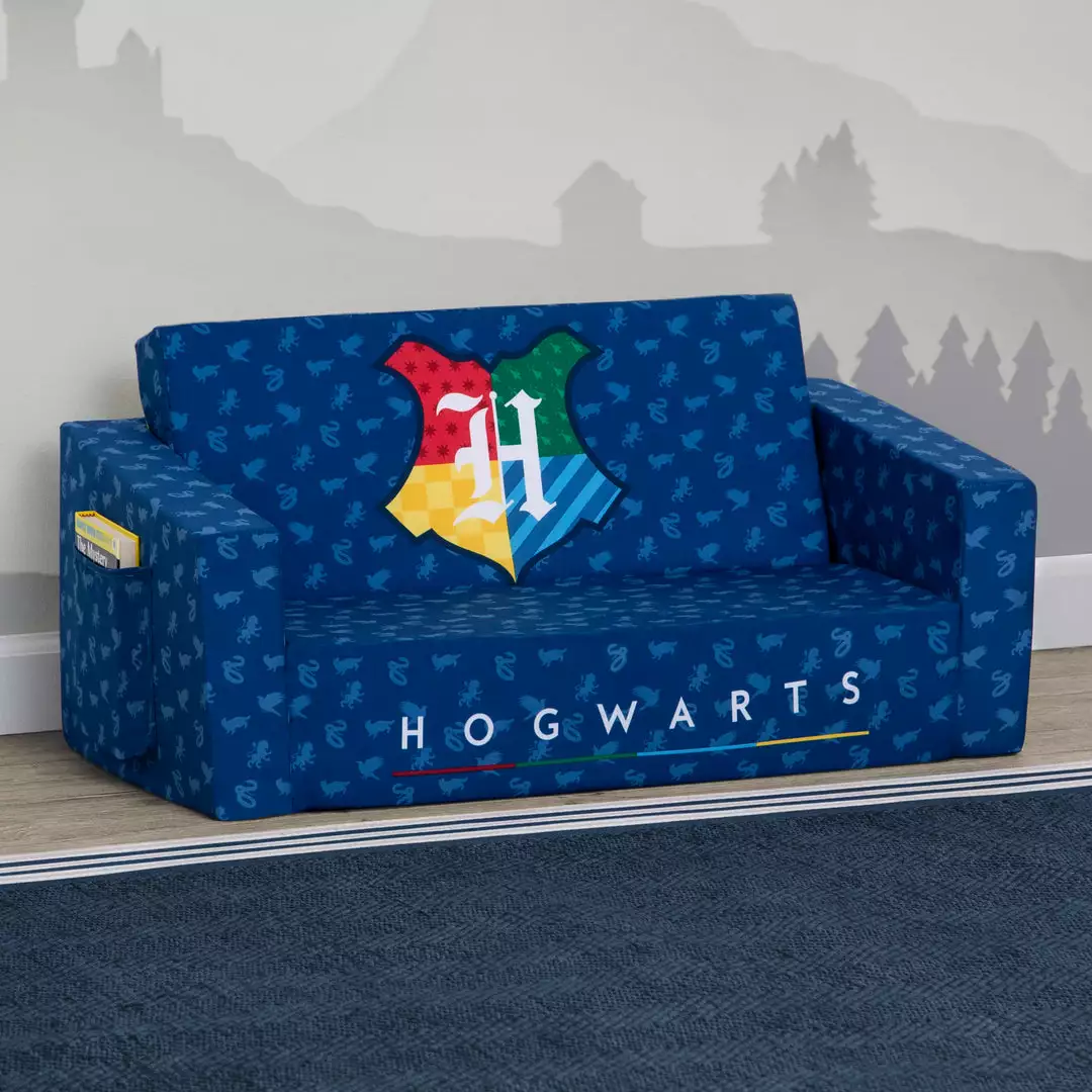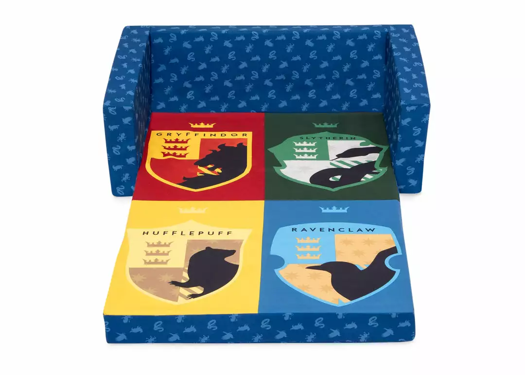 The Harry Potter Cozee Flip-Out Sofa by Delta Children is a cozy sofa by day, laid-back lounger by night. This convertible seat easily flips open for multiple ways for your child to relax–they’ll love to sit and read or watch their favorite movies on the sofa but when it’s time for a nap, this seat folds out into a comfy sleeper bed. Plus, when the chair is flipped open it magically reveals the crests of the four Hogwarts houses, Gryffindor, Ravenclaw, Slytherin and Hufflepuff. Big enough to 2 to 3 small kids comfortably in sofa mode, it’s light enough to move around the house and is ideal for your children to share during playtime or sleepovers. The super-soft slipcover with easy-to-reach side pocket is treated with a Scotchgard stain release finish to resist stains, ensuring the chair looks beautiful for years to come! The supportive foam construction will keep its shape and provides all-day comfort. Designed to ship in a super-small box, this lightweight foam kids’ sofa and lounger may take up to 24 hours to fully expand once unboxed. Machine-washable slipcover zips off for easy cleaning. Recommended for ages 18 months+.