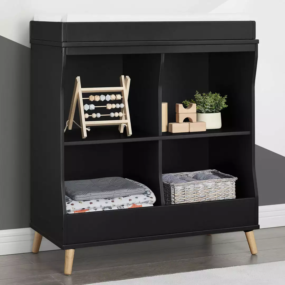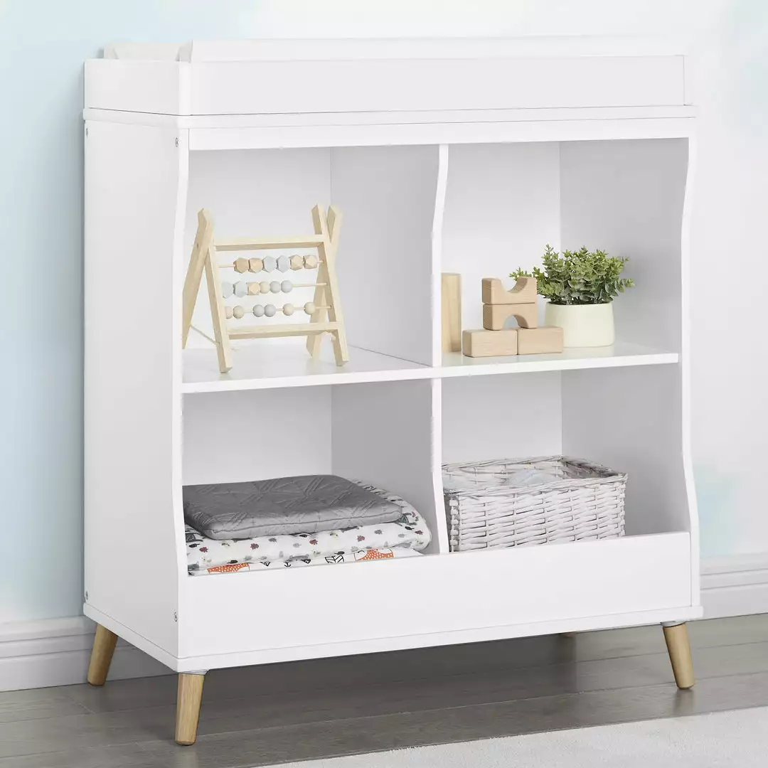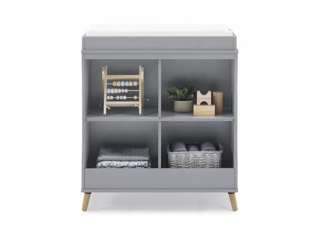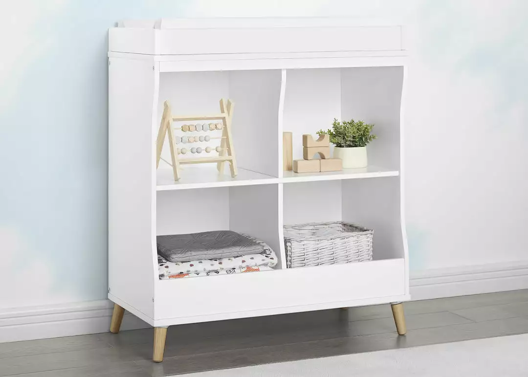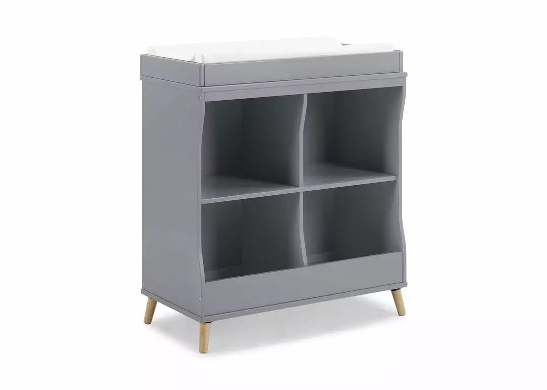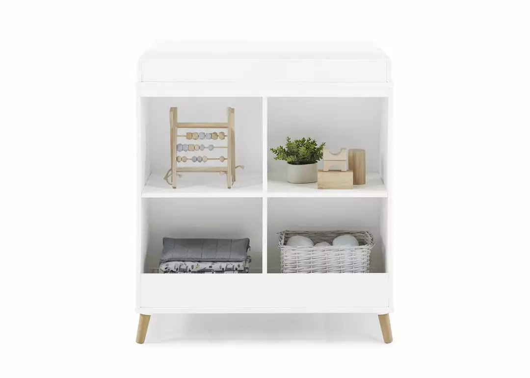 The Jordan Storage Changing Table by Delta Children offers all the essentials: a secure place to change your baby and shelves for storage. A new take on iconic mid-century style, it features simple lines and natural colored splayed legs for added contrast. This convertible changing table has four open cubbies for storage and a topper that keeps the changing pad firmly in place (changing pad sold separately). Best of all, its innovative 2-in-1 design allows the changing topper to be easily removed once your child is potty-trained, effortlessly converting the piece into a bookcase. A great option that will grow with your child, from nursery to big-kid room, the Jordan Storage Changing Table by Delta Children is also ideal for shared bedrooms, or anywhere you need a space-saving storage piece. Coordinates with other items in the Delta Children Jordan Collection.