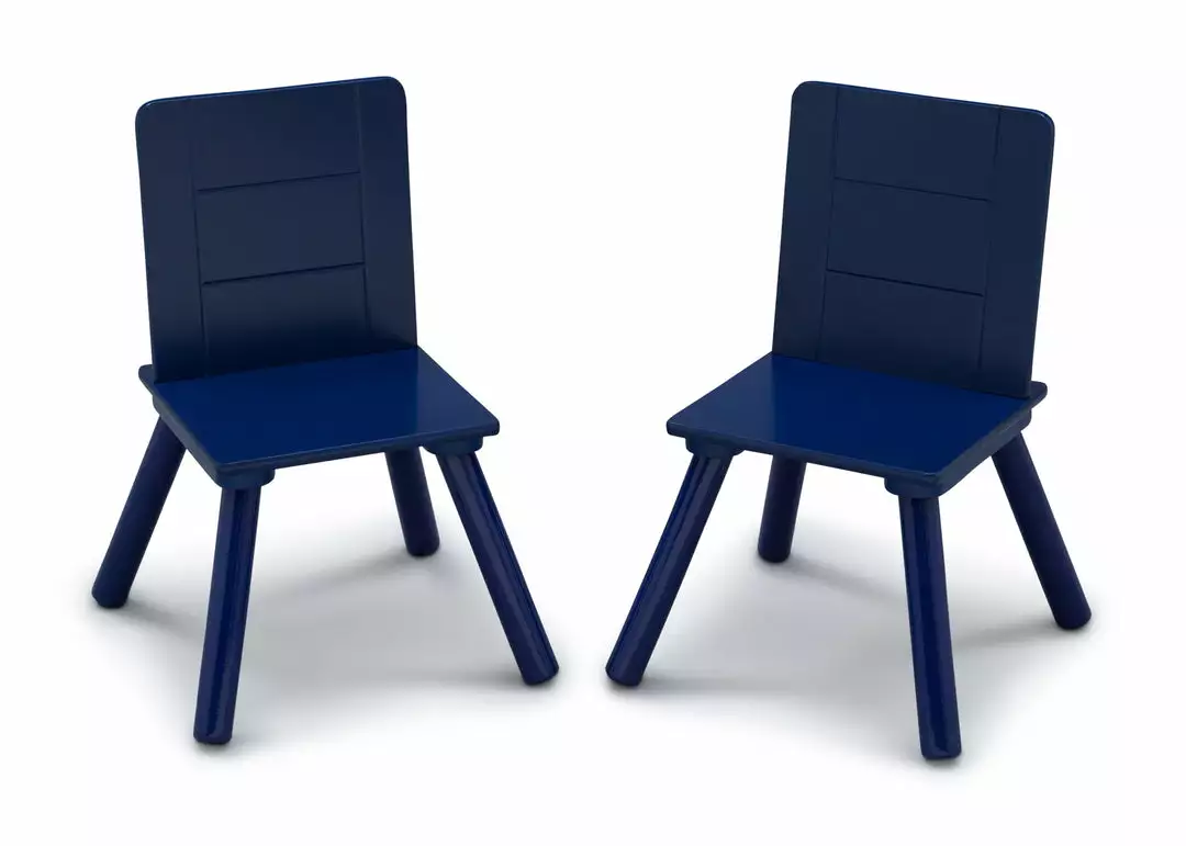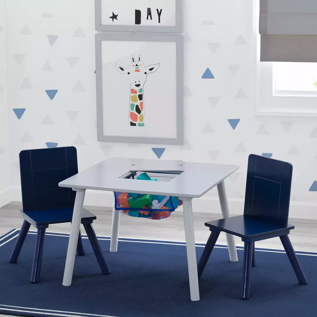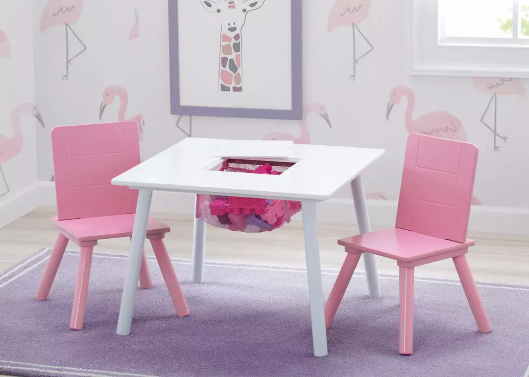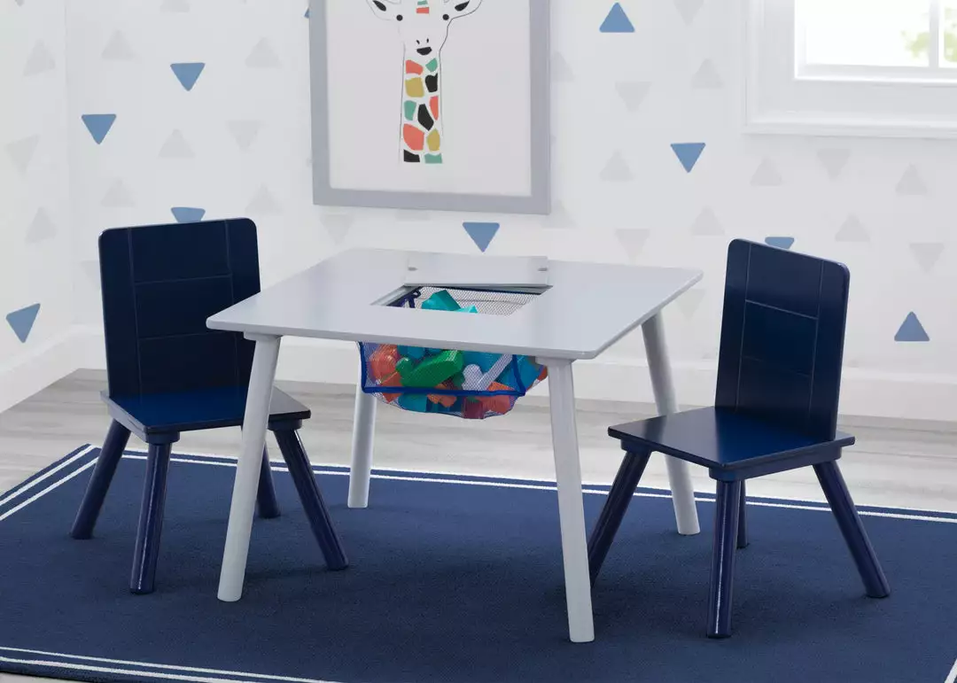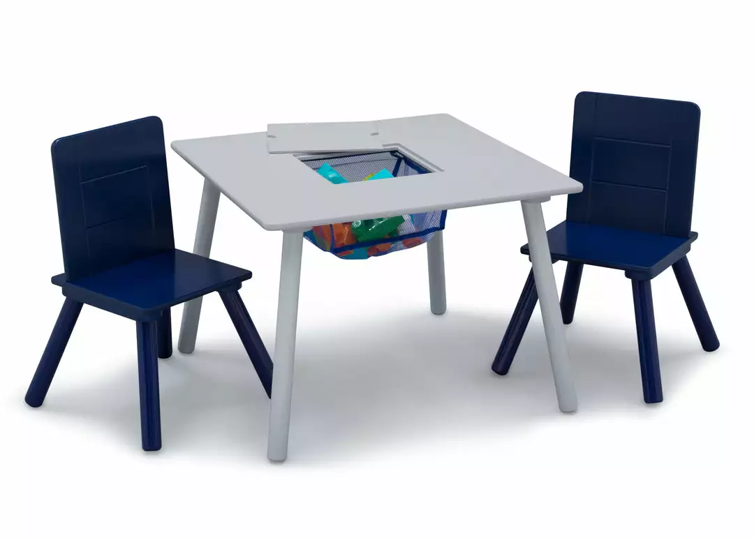 Spark years of creative play and learning with this Table and Chair Set with Storage by Delta Children. Perfectly sized for your growing child, this set features a sturdy wood table in white and two boldly colored chairs with grooved detailing. As functional as it is stylish, this set also features a built-in storage compartment at the center of the tabletop, perfect for stowing away toys, books or art supplies. Beautifully crafted, this set proves that play tables can be as tasteful, charming and multi-functional as the rest of your home décor—use it in your child’s bedroom, playroom or any living space.