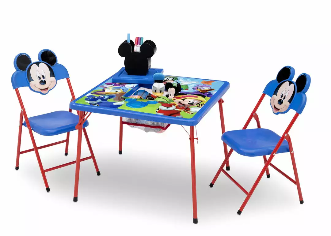 Create the perfect play space for your child with this Disney Mickey Mouse 4-Piece Kids Furniture Set from Delta Children. This versatile set includes a folding play table with 3D storage in the center for markers, pencils or other art supplies, two coordinating chairs and a spacious fabric toy box. An easy way to get your child excited about cleaning up or homework, this versatile seating and storage combo features colorful graphics of Mickey Mouse and his Roadster Racers friends, Donald Duck, Goofy and Minnie Mouse. Built from sturdy materials, these pieces will stand up to years of playtime.