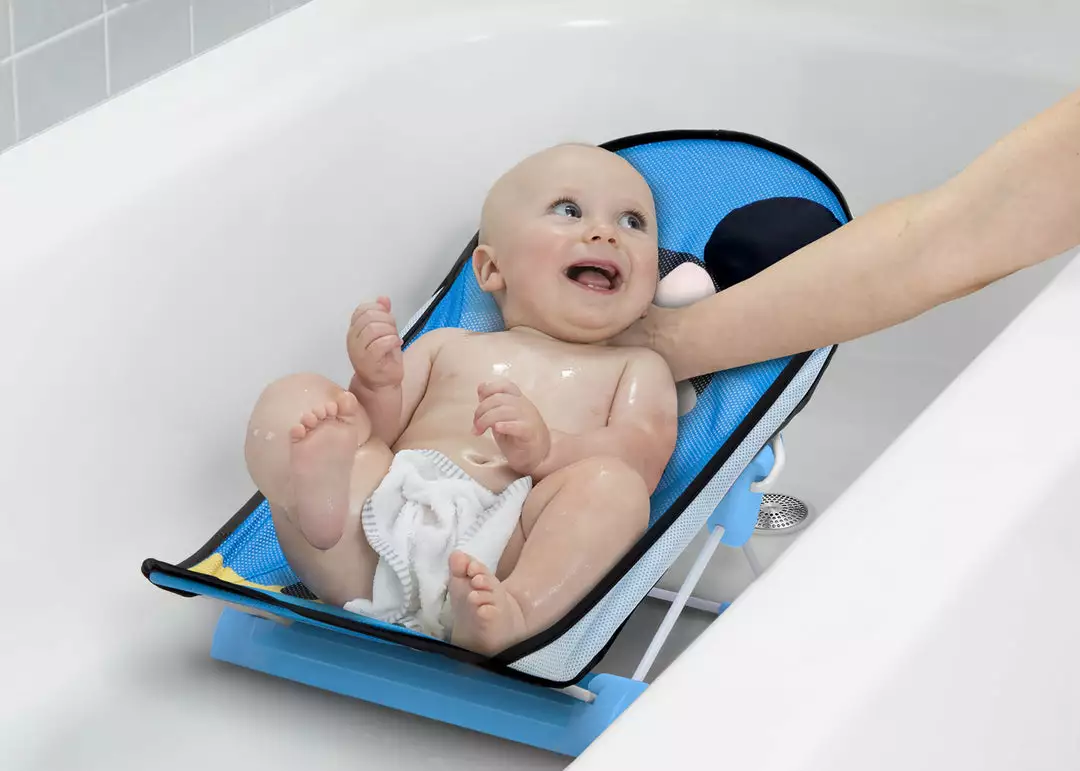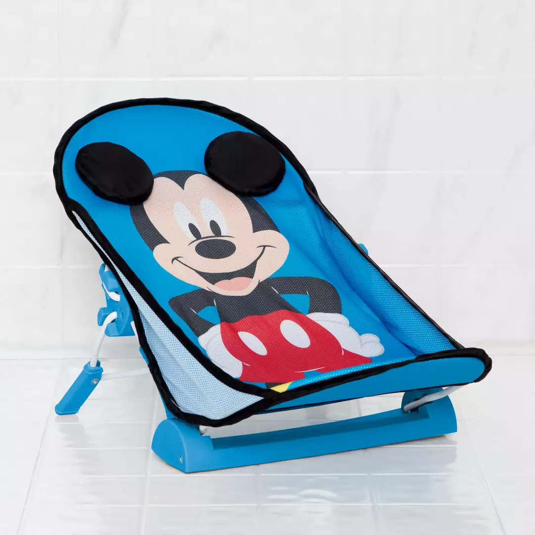 Made for mini Mouseketeers, this Disney Mickey Mouse Baby Bather by Delta Children provides a safe place to bathe your newborn. The batherâs soft mesh material is gentle on babyâs delicate skin and is easy to cleanâthe slightly inclined design ensures your baby is in a secure position throughout bath time. Mickeyâs 3D ears provide needed head support and an extra dose of fun. Use it in your sink or bath tub. The batherâs compact fold is convenient for storage or travel.