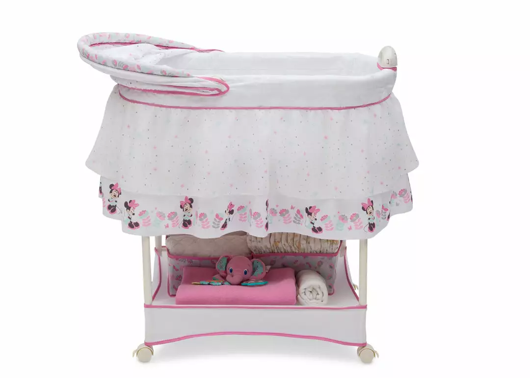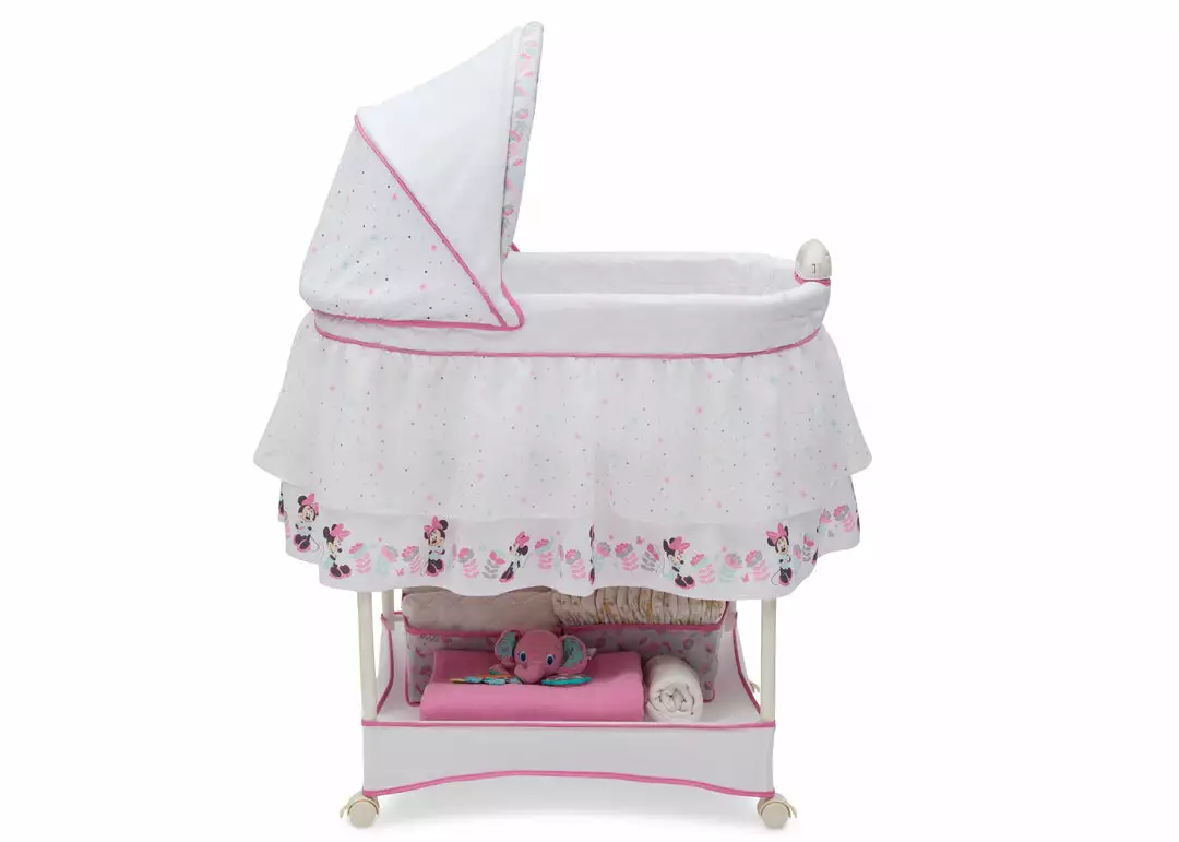 Make your girl’s space extra-special with a little help from Mickey’s main squeeze, Minnie Mouse. The Disney Minnie Boutique Gliding Bassinet by Delta Children is designed with sweet, artful illustrations of Minnie and boasts an electronic music module with nightlight and gentle vibration that helps little oneâs sleep. Outfitted with a large storage basket underneath, a gliding base and locking casters, it makes bedtime easier for parents and babies.