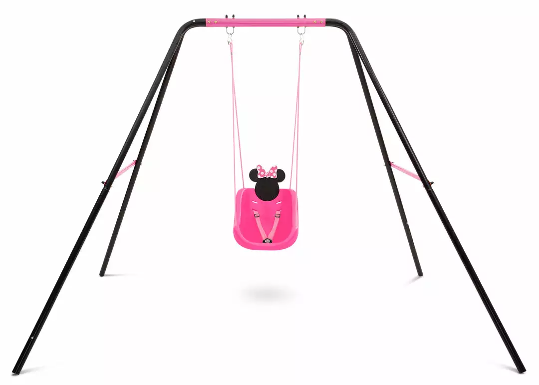 Good times will be in full swing when you get your little one this Minnie Mouse 2-in-1 Outdoor Swing by Delta Children! The swingâs comfortable bucket seat and high back provides support while the three-point safety harness ensures your child stays securely in placeâthe harness can be removed as your child grows. A three-dimensional accent of Minnieâs silhouette at the top of the swing adds sweet style. Made from durable, weather-resistant plastic, it will withstand the elements for many years. Plus, this fun swing comes with everything you need to attach it to your existing play structure, the included rope measures 36-inches from the top of the swing. Ideal for children ages 9-48 months.