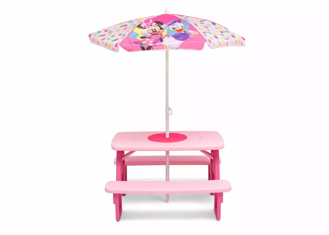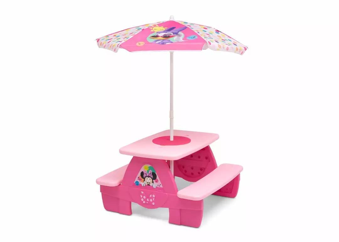 Delta Children Minnie Mouse 4 Seat Activity Picnic Table With Umbrella And LEGO Compatible Tabletop Outdoor