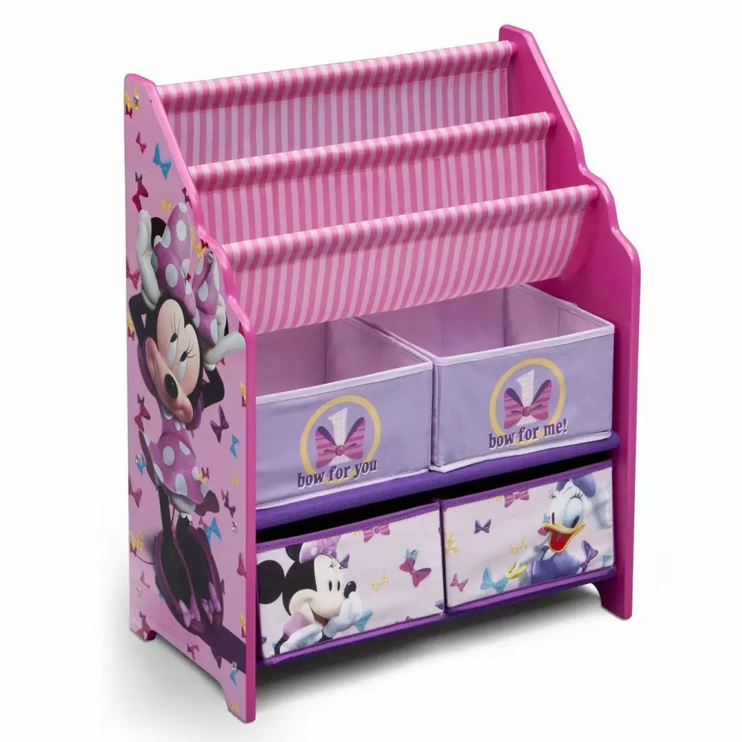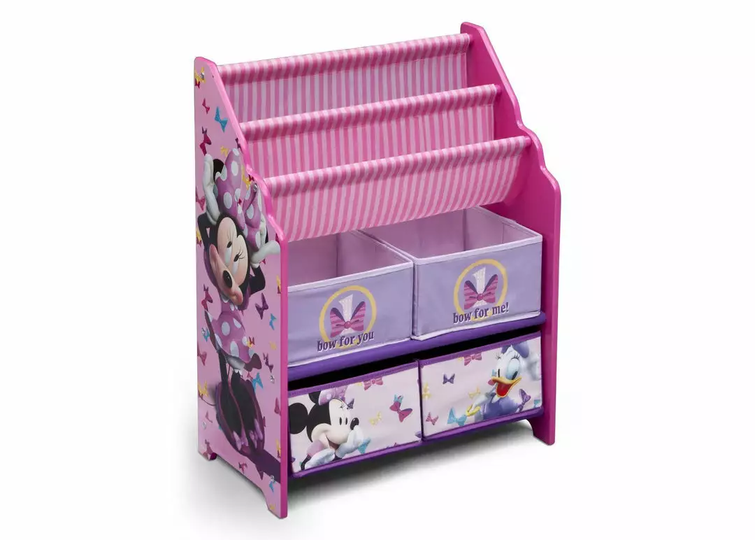 Bring a spot of color to your girl’s bedroom or playroom with this Minnie Mouse Book & Toy Organizer from Delta Children! Featuring four fabric bins and a two-tiered bookrack supported by a sturdy wood frame, it’s finished with colorful illustrations of Minnie Mouse and her iconic polka dots.