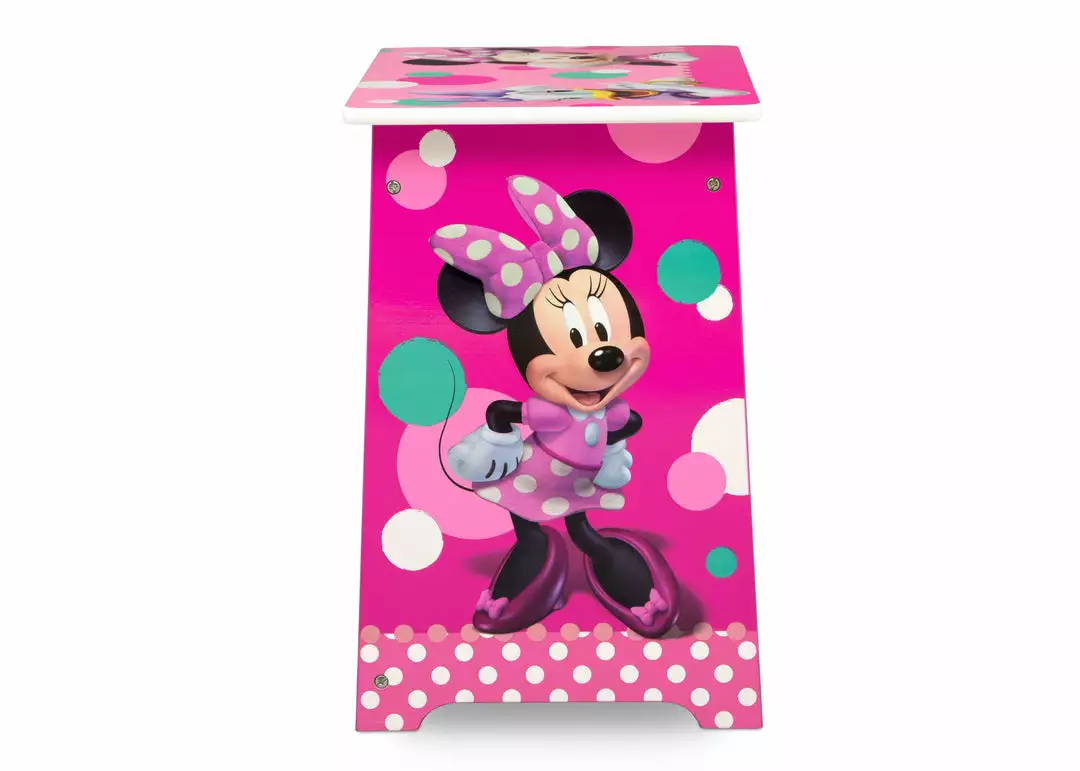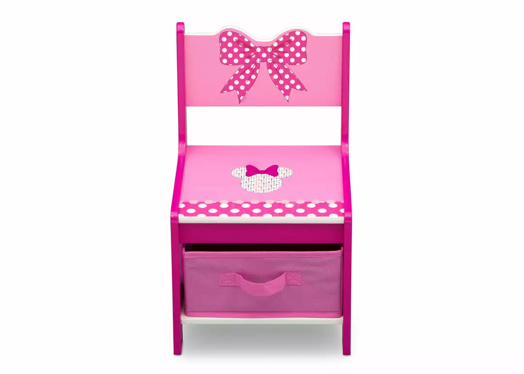 Add a dash of animated fun to playtime, mealtime or study timeâwith the Minnie Mouse Kids Desk and Chair Set by Delta Children! Perfectly sized for your little Mouseketeer, your child will love sitting down at this coordinating, desk and chair set, featuring adorably charming graphics of Minnie Mouse and her bestie, Daisy Duck. Minnieâs signature bow, with of course, plenty of pink tones and polka dots allover enhance the cuteness. The desk provides the perfect space for your child to do homework, art projects or eat, while the cleverly designed chair features a storage bin underneath for easy access to art supplies, toys, books, or games! A smart and sturdy option for your childâs bedroom or playroom, this durably constructed wood desk and chair set will stand up to years of use. Bring home the cheerful spirit of Minnie Mouse and her friends to your little oneâs Clubhouse with this Kids Desk and Chair Set.