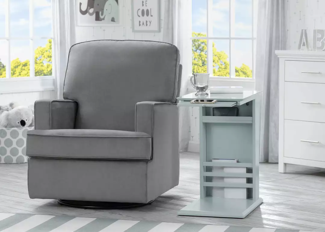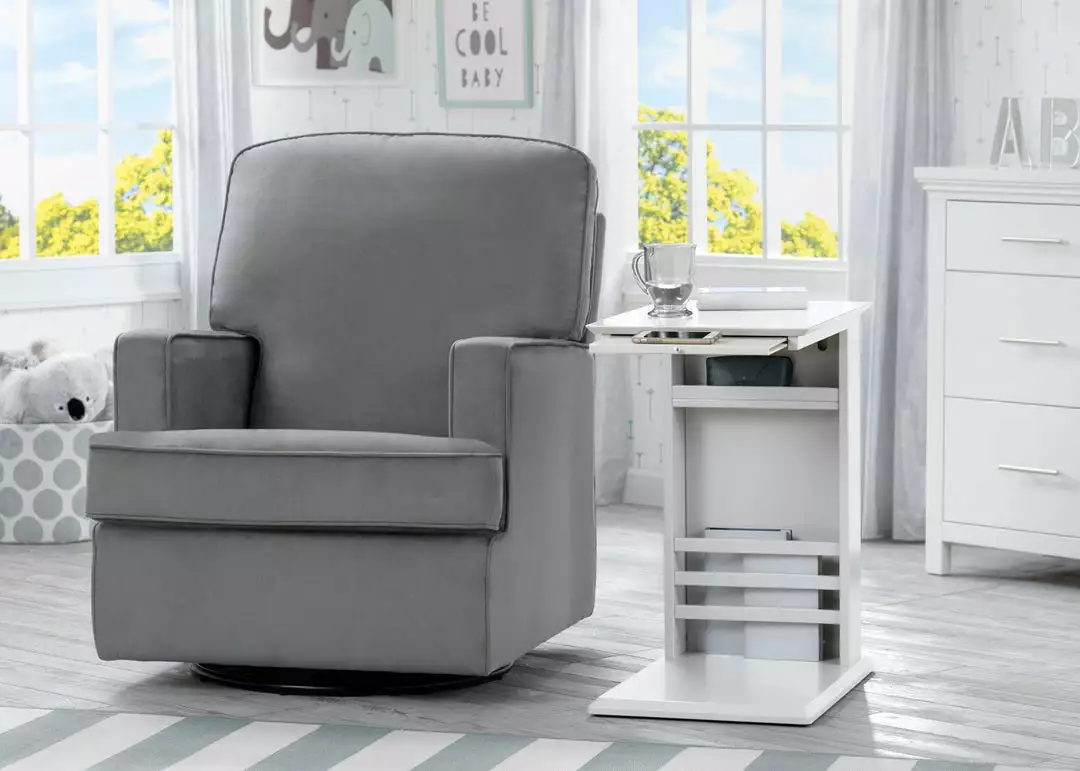 The simple lines and hidden storage on the Delta Children Nolan End Table/Side Table for the Nursery will keep your room looking great and organized! The thin base of the table can easily slide under/in front of most nursery gliders, sofas, couches or beds to make bottles, books, remotes or your phone easier to reach. A handy book rack on the side provides additional storage, and the spacious tabletop provides enough room for a lamp and knickknacks. A slide-out shelf below the tabletop offers an extra surface when you need it, then tucks away nicely when you don’t. A great space-saving option in any room of the house, from the nursery to the living room, the Nolan End Table/Side Table from Delta Children ensures you’ll always have all your essentials right beside you. Available in Ebony, Grey, Bianca White, Lotus Pink or Misty Blue.