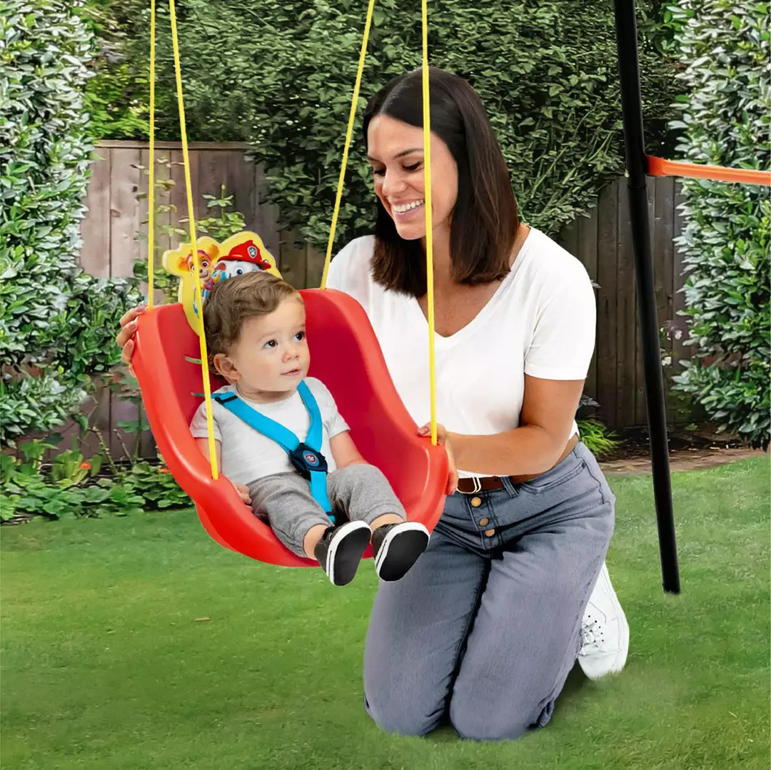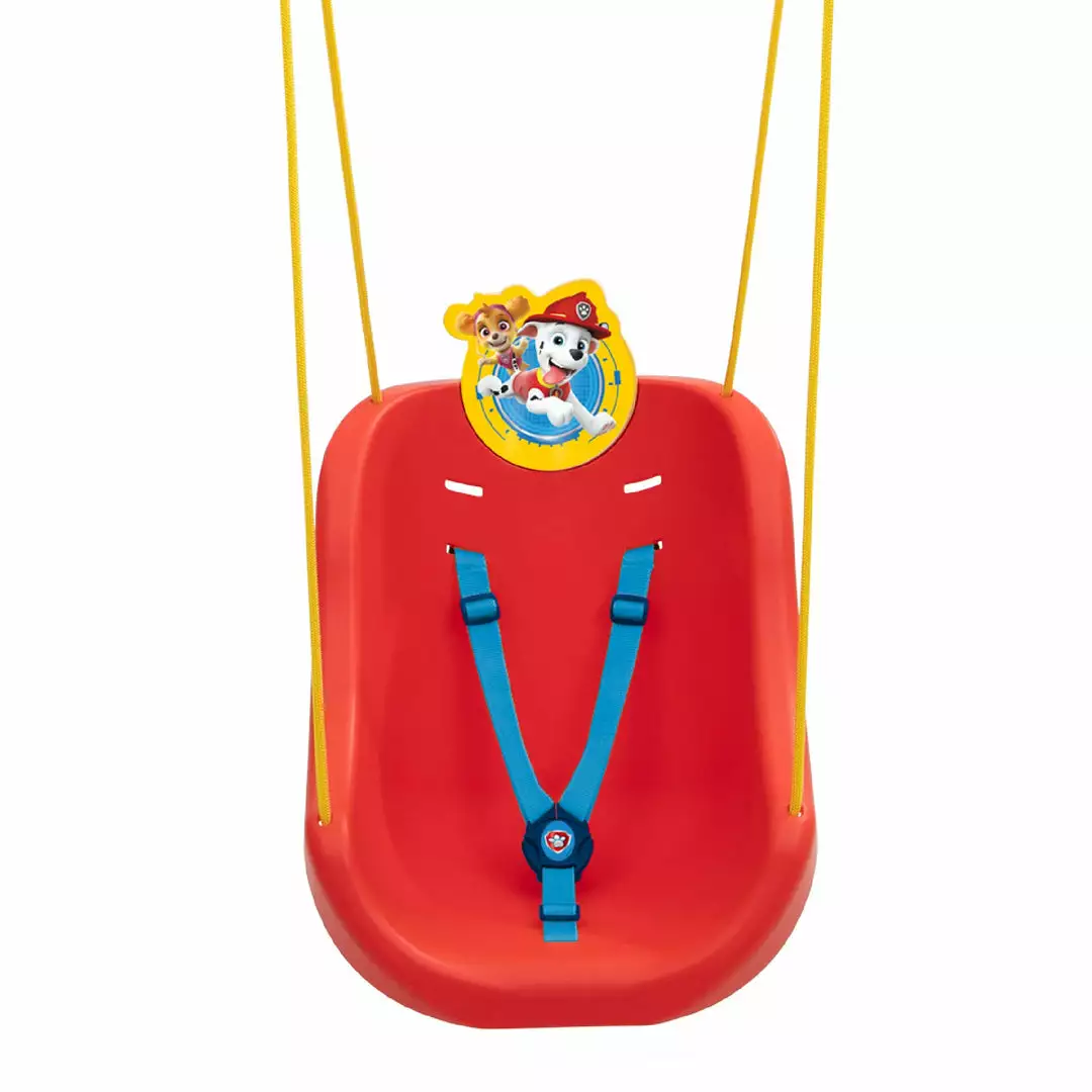 Good times will be in full swing when you get your little one this PAW Patrol 2-in-1 Outdoor Swing by Delta Children! The swingâs comfortable bucket seat and high back provides support while the three-point safety harness ensures your child stays securely in placeâthe harness can be removed as your child grows. Colorful graphics for Marshall and Skye at the top of the swing add action-packed fun. Made from durable, weather-resistant plastic, it will withstand the elements for many years. Plus, this fun swing comes with everything you need to attach it to your existing play structure, the included rope measures 36-inches from the top of the swing. Ideal for children ages 9-48 months.