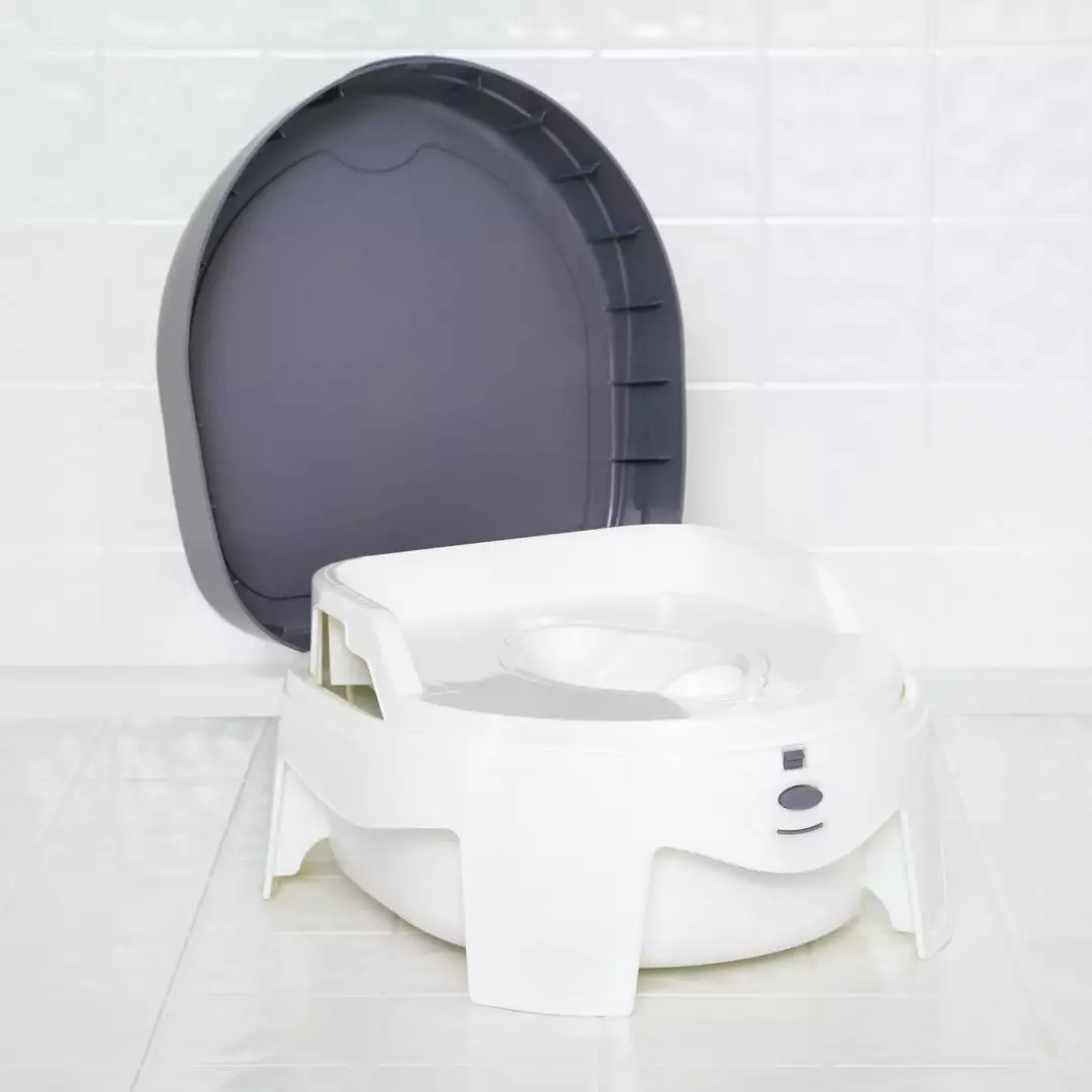 The PerfectSize 3-in-1 Potty by Delta Children makes it easier than ever to potty train your toddler! Made with recycled ocean plastics, this potty is packed with a ton of features that help boost your child’s potty confidence while also helping save 100 plastic bottle caps from the oceanâitâs a win-win. This 3-in-1, multi-functional potty chair stars as a toddler training toilet with removable bowl, then converts into an adjustable toilet seat that works with most standard round and elongated toilets, and lastly can be used as step stool to reach the toilet, brush teeth at the sink or help out mom and dad in the kitchen. Perfect for boys or girls to use, the seatâs integrated splash guard makes it extremely easy to clean while the non-slip bottom prevents slipping and sliding. The potty seat’s lightweight and compact design allows you to move it around the house wherever your child feels the most comfortable, you can also bring it on family trips. Get the PerfectSize Potty by Delta Children when it’s time for your little one to start their potty-training journeyâit effortlessly grows with your little one, making the transition to the “real” toilet easier and faster! Age recommendation: 1 year +. Weight recommendation: holds up to 50lbs. Made in the USA.