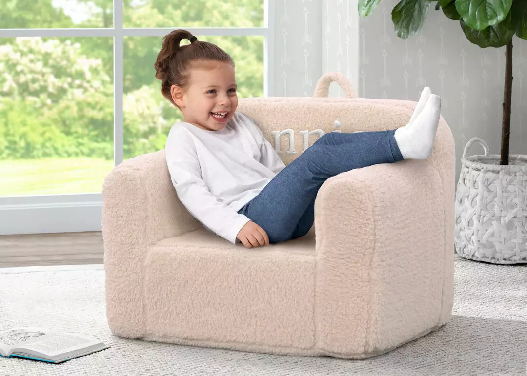 Cozy up to the Cozee Sherpa Chair for Kids by Delta Children. A snuggly spot for reading, watching TV or just hanging out, this supremely comfy chair features a Sherpa slipcover that adds texture and comfort, plus itâs removable and machine washable for easy cleaning. Perfect for the playroom, living room or your child’s bedroom, this kidsâ foam chair goes anywhere they do–the lightweight design with handle on top is easy to move from room to room. Personalize it with a name for the perfect finishing touch. Recommended for ages 18 months+.