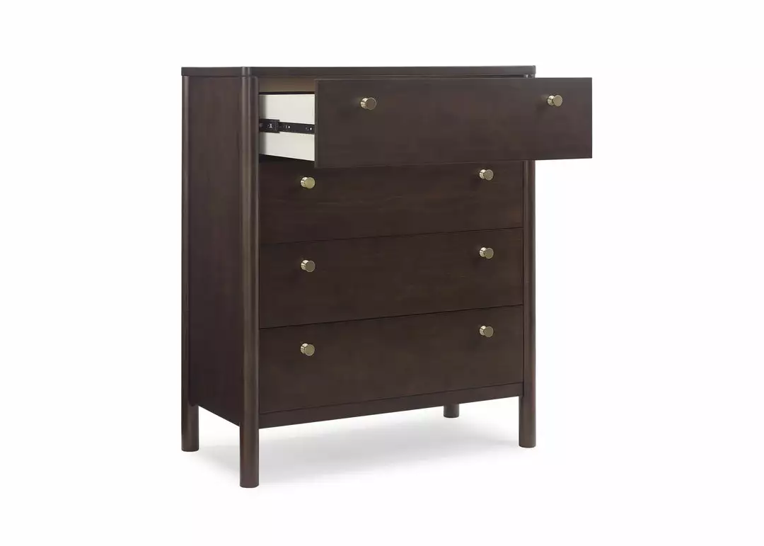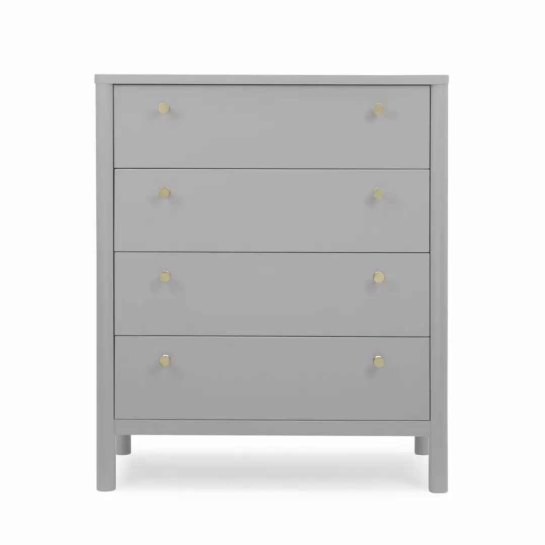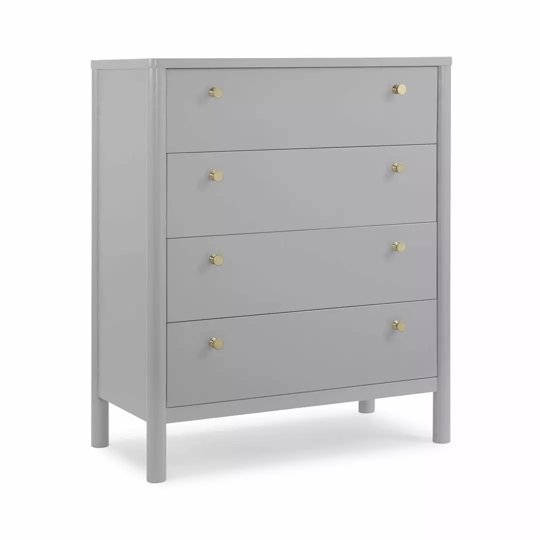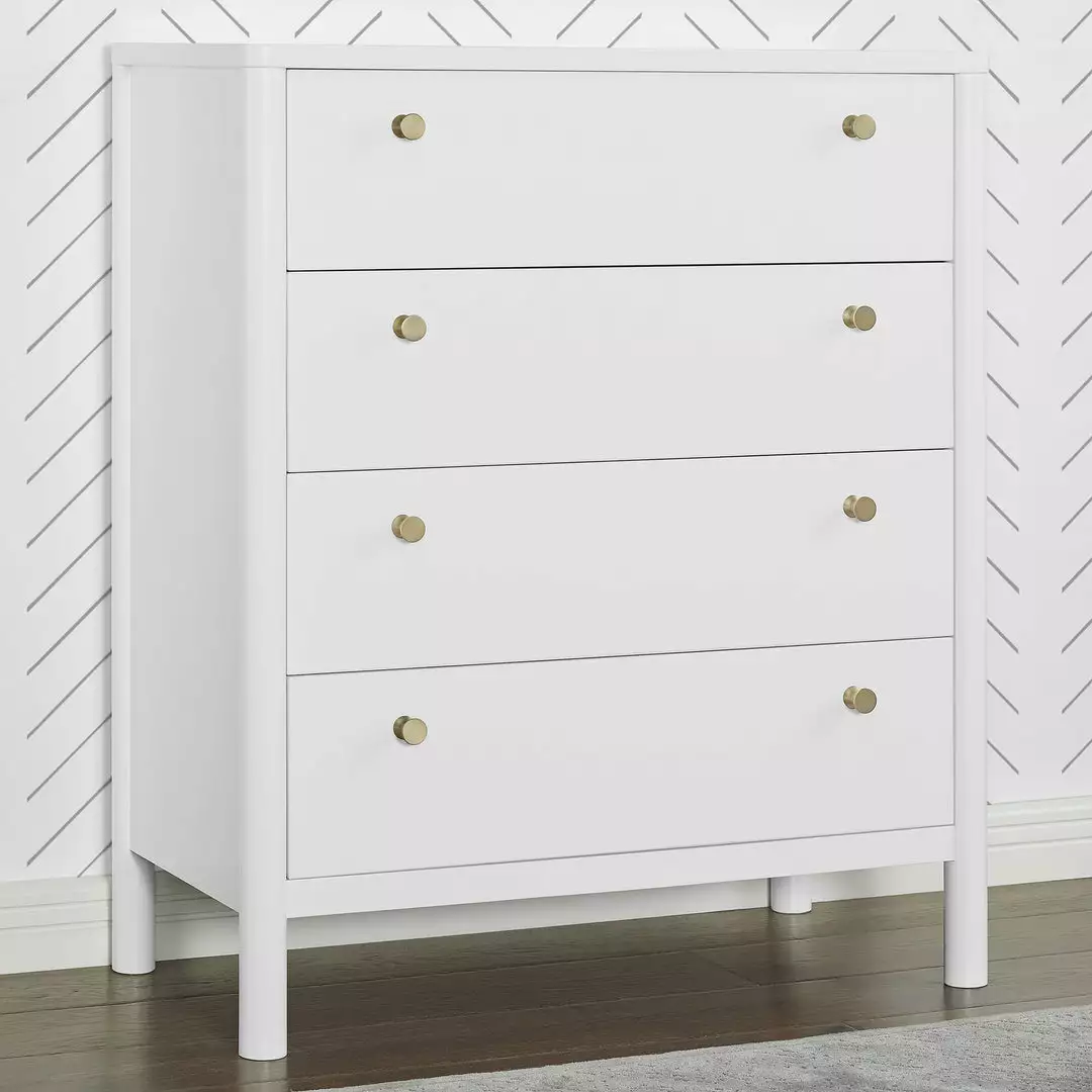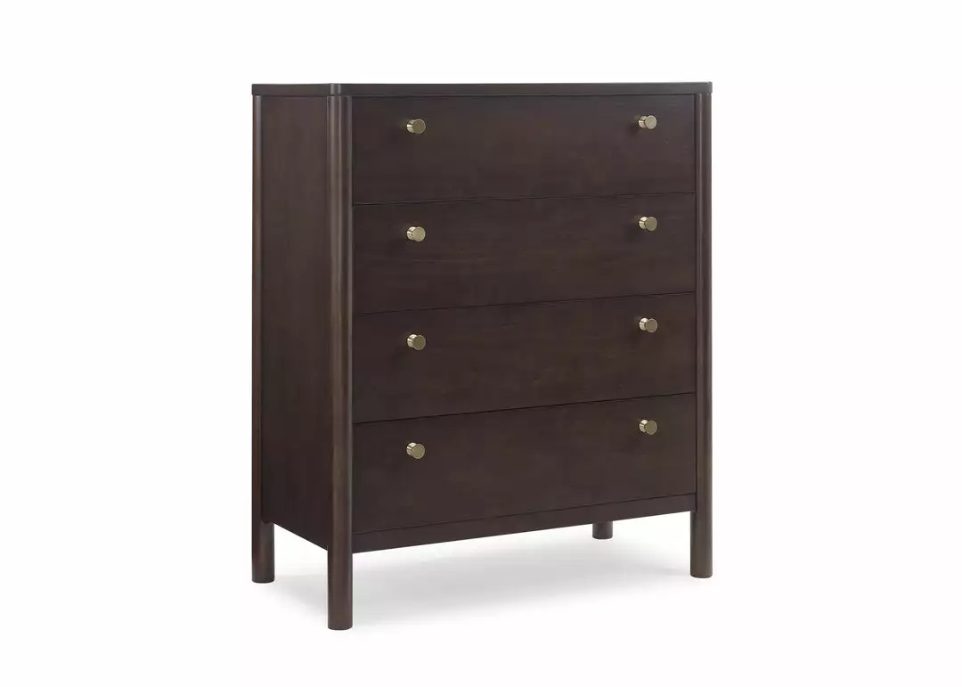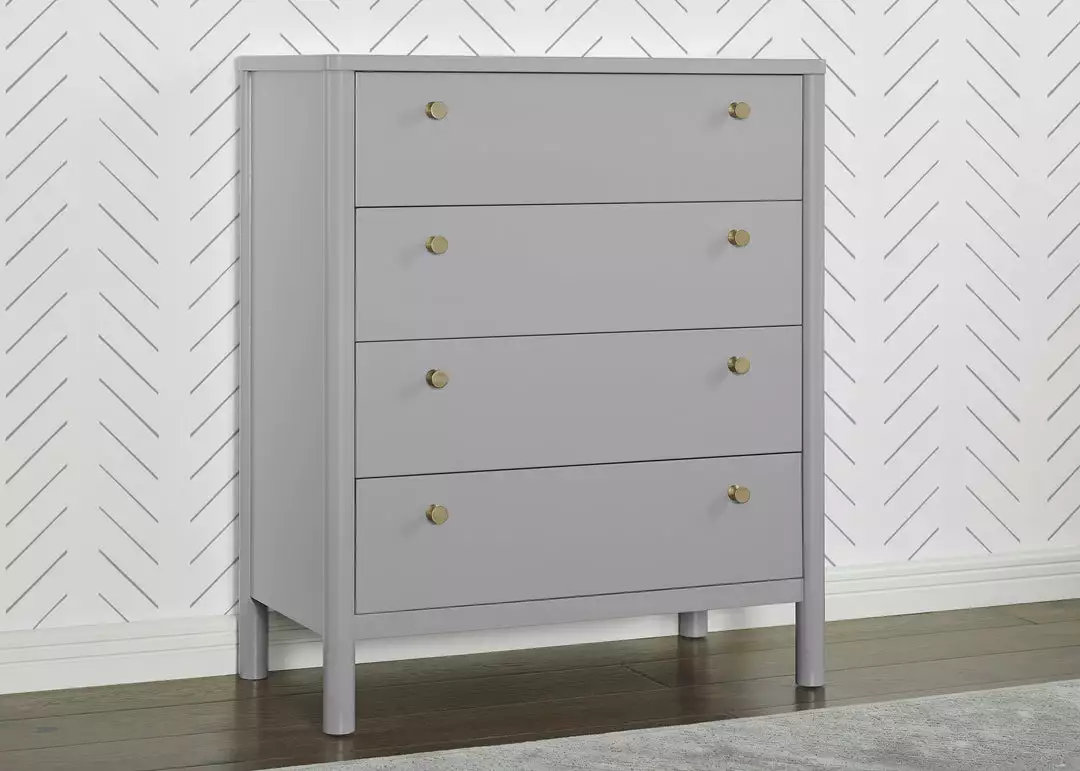 The Remy 4 Drawer Chest by Delta Children will instantly elevate your nursery with its mid-century modern style. Our updated take on retro features clean lines, brass knobs and four spacious soft-close drawers framed by cylindrical posts. Pair this tall chest with other pieces in the Remy Collection for a coordinated look.