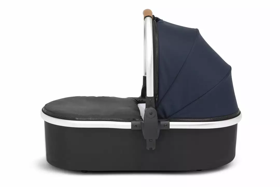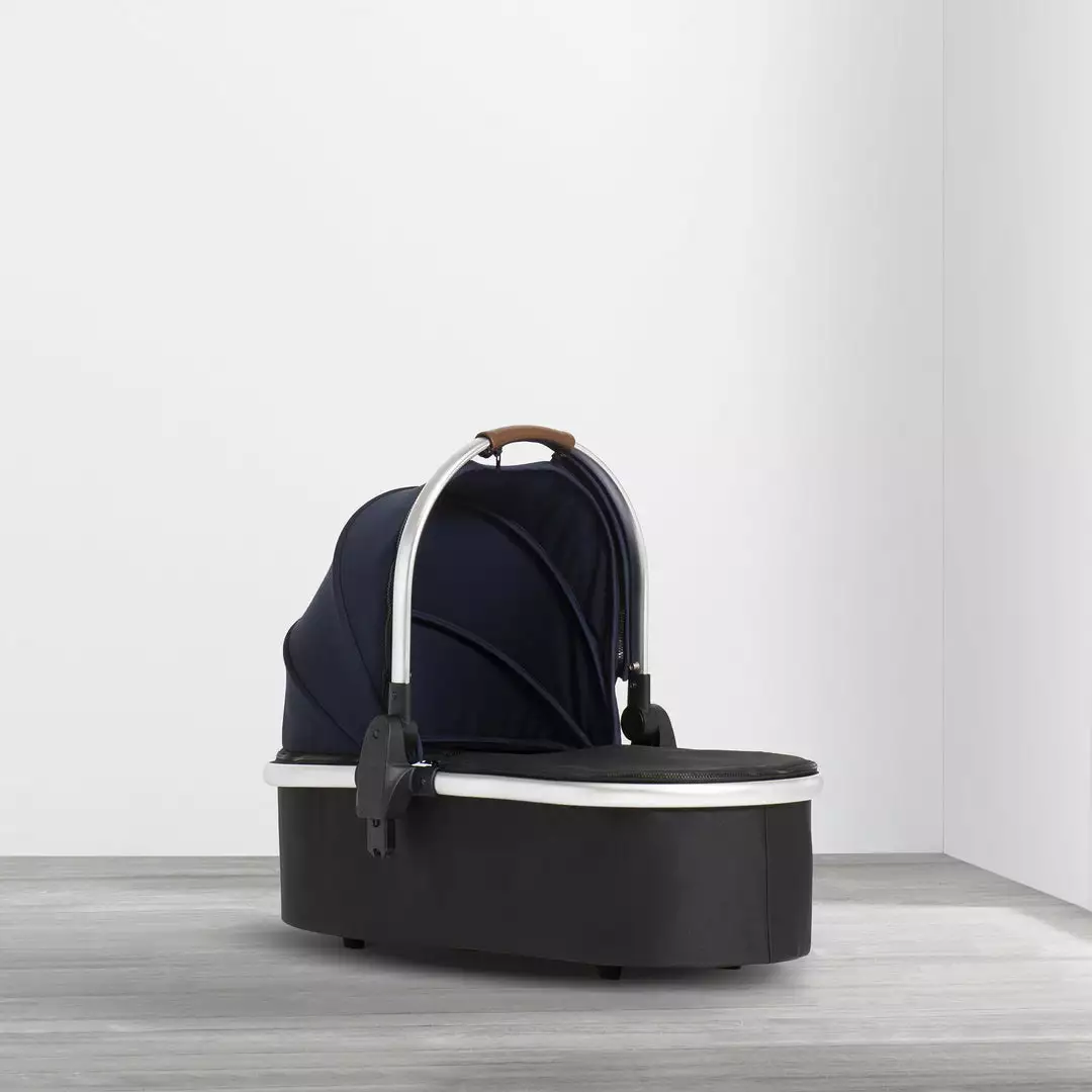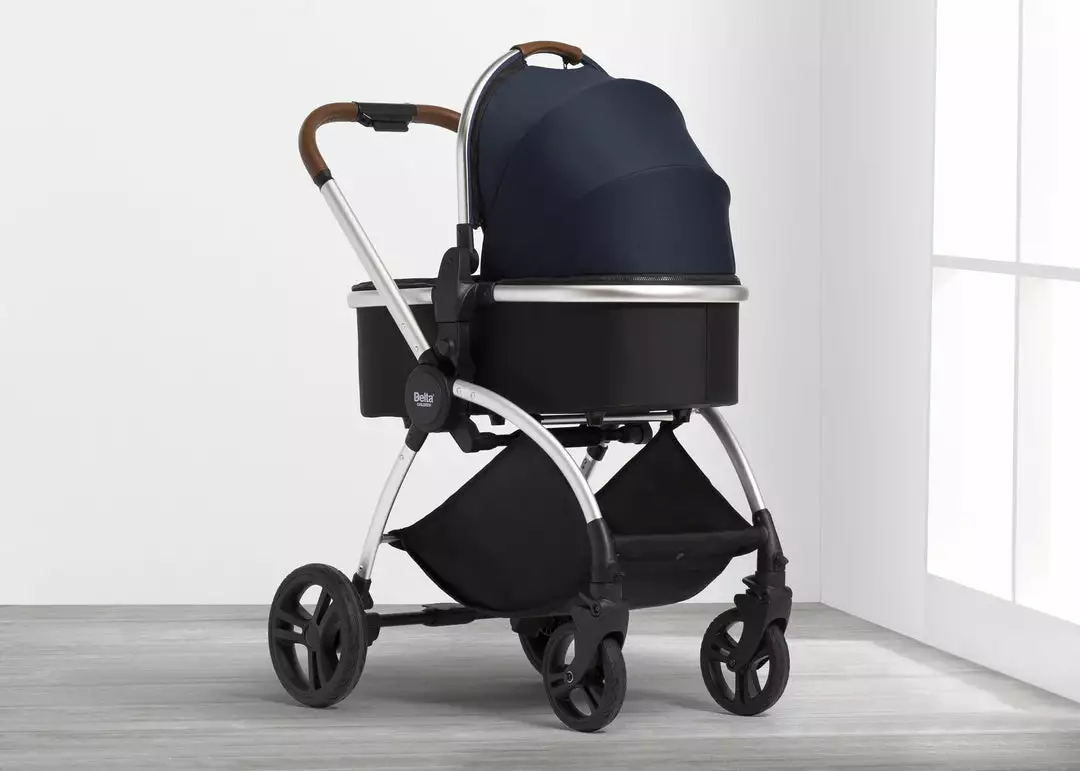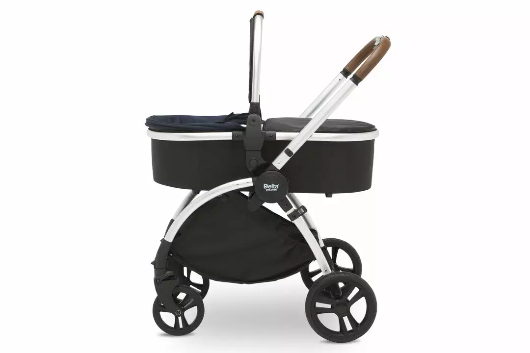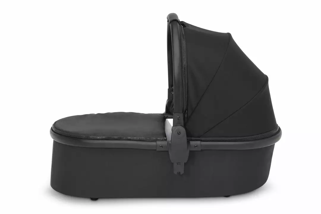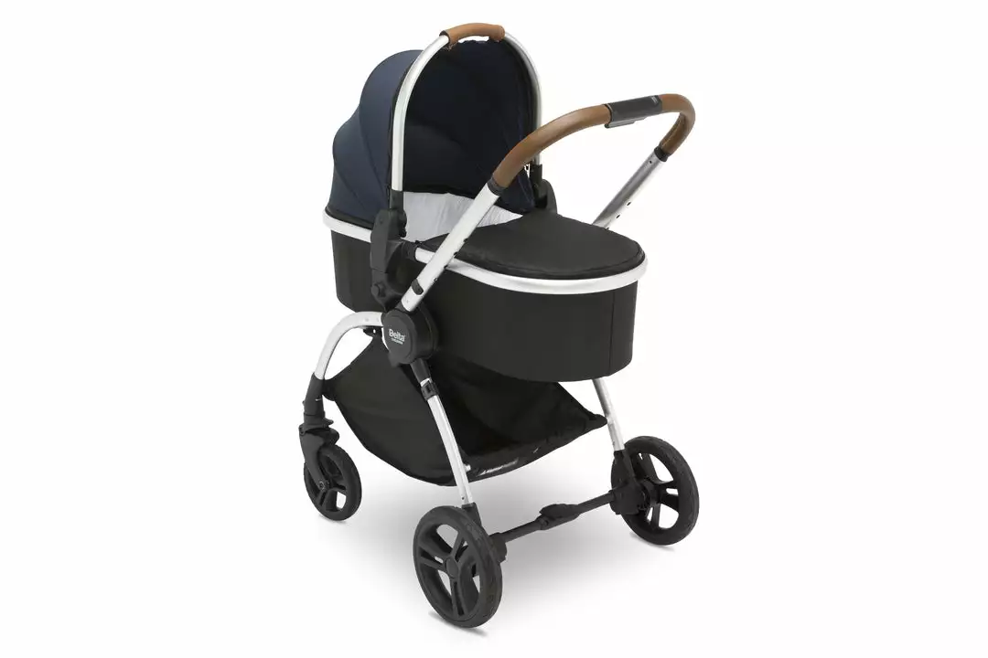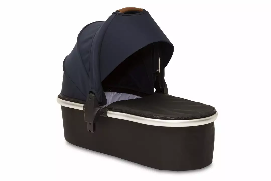 Adding the Revolve Carriage/Pram to your Delta Children Revolve Stroller is the coziest way to stroll around town with your newborn. This cozy infant carriage seamlessly attaches to the Revolve Stroller, both forwards and backwards. Designed with comfort in mind, this bassinet features a waterproof mattress pad, full coverage canopy, and lets your baby sleep soundly while laying completely flat. It also includes a sunshade attachment with UPF 30+ that completely blocks out all light. The zippered foot cover will protect baby from the sun or cold weather. Topped with a luxe leather wrapped carry handle that makes it easy to attach and detach.