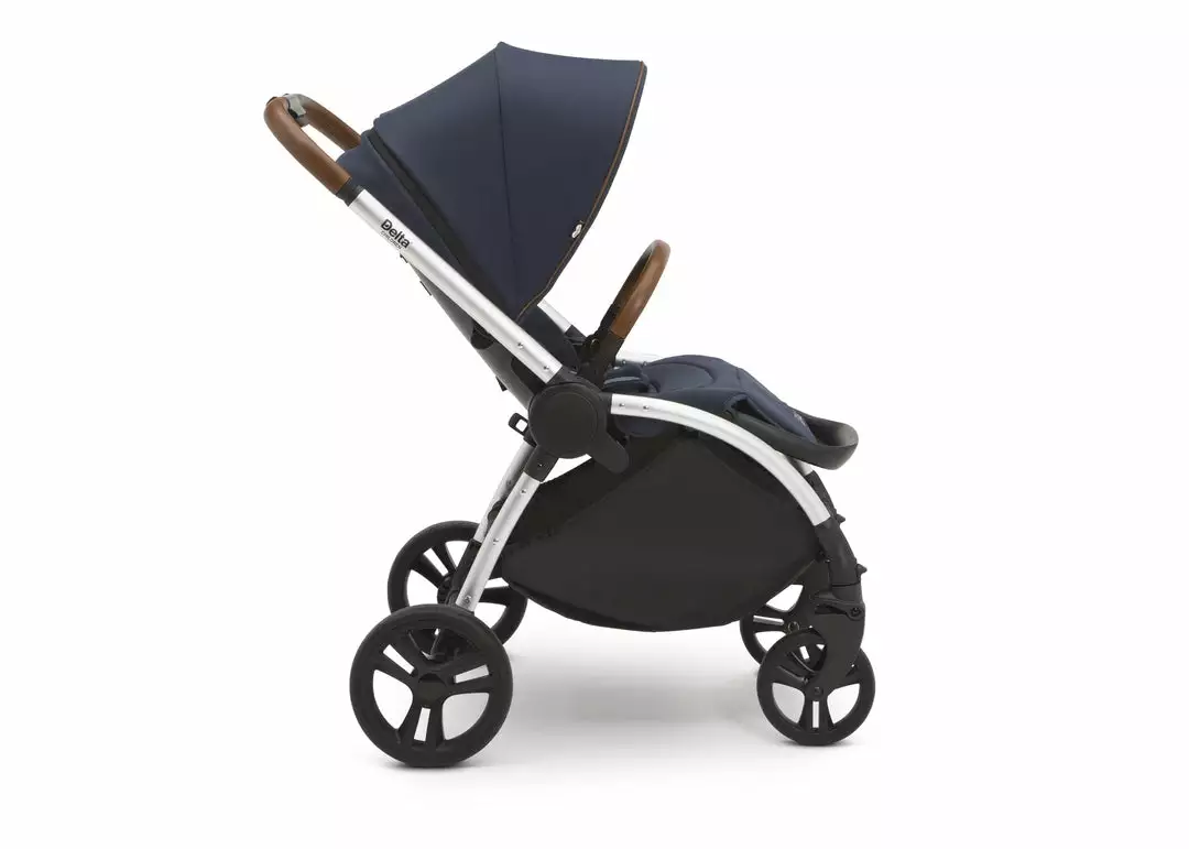 Light, compact and easy to maneuver, the Revolve Reversible Stroller by Delta Children is ideal for everything from city streets to park paths. With three ways to ride, its reversible seat can be positioned facing you or facing the world, and a car seat adapter allows you to easily attach the most popular car seats to the frame (car seat and adapter sold separately). Offering premium features any parent will appreciate, this ultramodern stroller has an expandable knit canopy with zippered peek-a-boo window and a soft, leather wrapped handlebar and child bar. Its reclining seat, adjustable footrest and all-wheel suspension system ensures the most comfortable ride for your little one. Youâll love the adjustable handlebar positions, spacious under-seat storage, as well as the front swivel wheels and one-step back brake that allow you to easily maneuver the stroller in busy streets, airports or amusements parks. And, when you need to store or take the stroller with you, its super-lightweight aluminum frame with a compact, one-hand fold can be done in parent-facing or front-facing mode. Perfect for city or suburban living, the Revolve Stroller combines style, performance and function to create the ultimate stroller for modern parents and their little explorers. Holds up to 50 lbs.