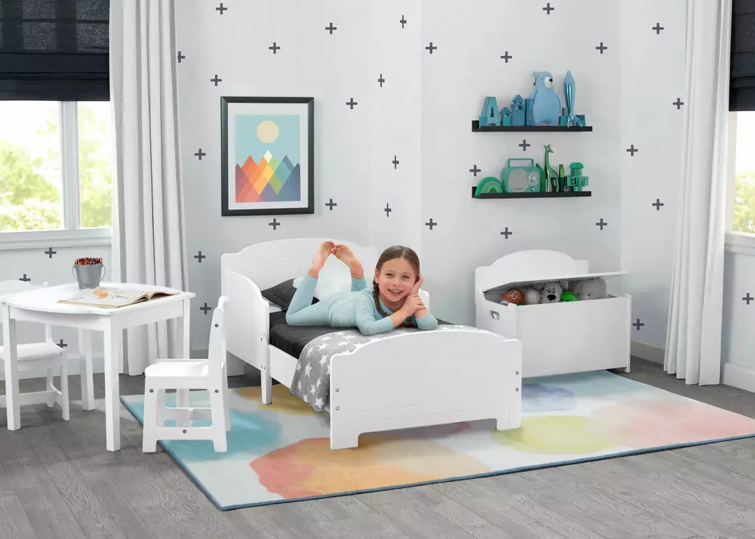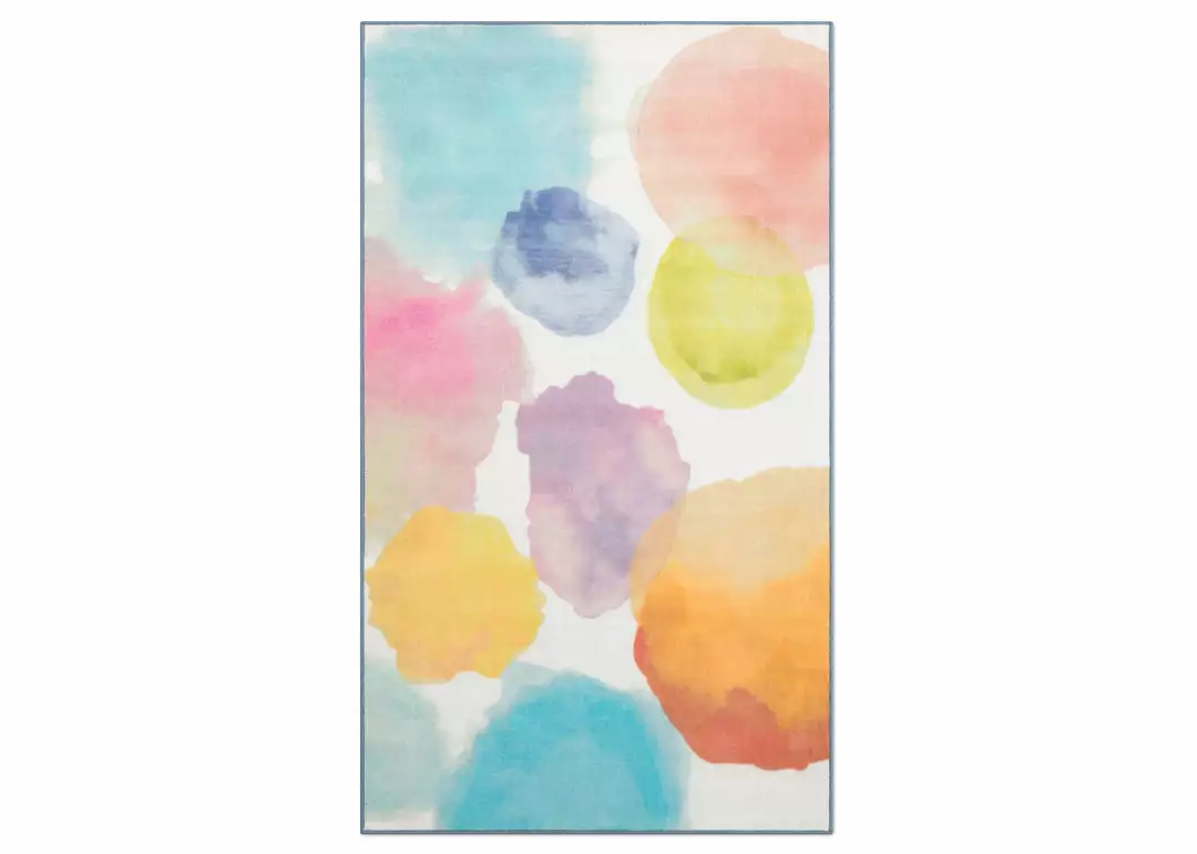 With its bright hues and watercolor-inspired brushstrokes, this Watercolor Rectangle Area Rug by Delta Children will help you create your dream space. This fun rug is awash with painterly splatters in modern colors. A great option for your childâs bedroom or playroom, this generously sized area rug is made from soft and durable materials to ensure itâs the perfect place to sit and play or read. The rugâs non-slip latex backing makes it safe to use on types of flooring and reinforced borders prevent fraying.